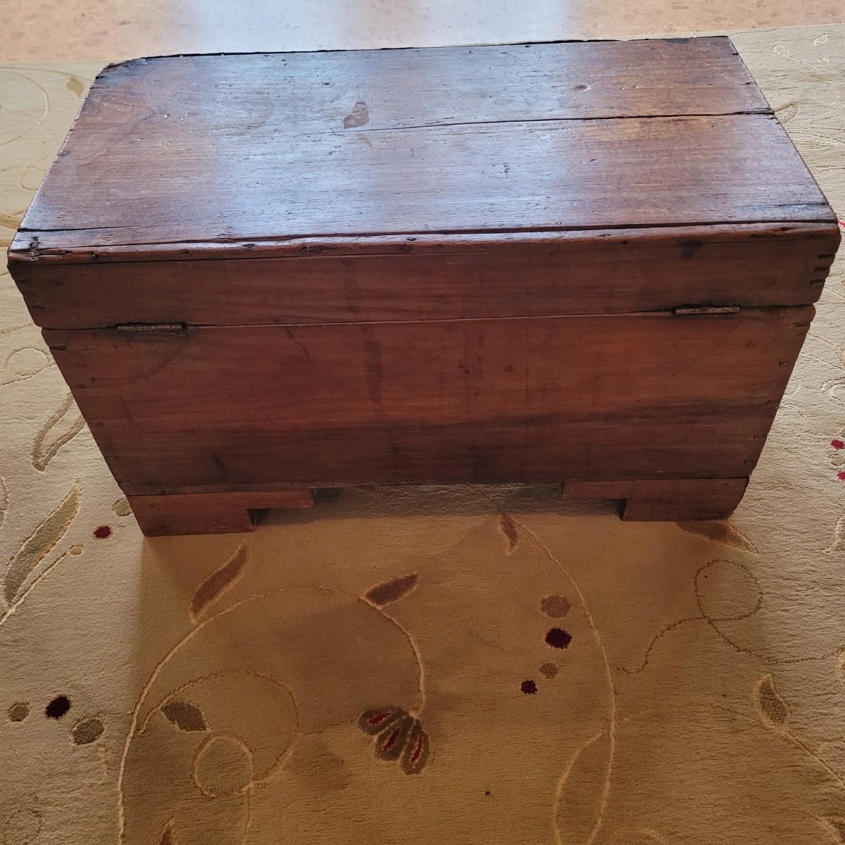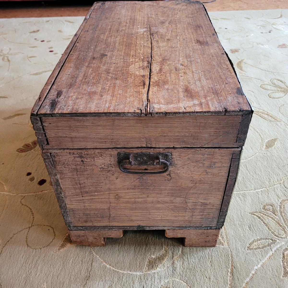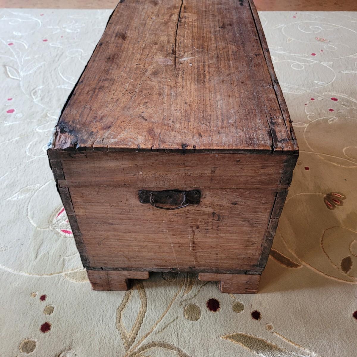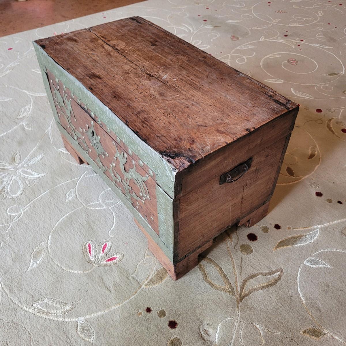 Metal faced wooden trunk. Metal embellishments appear to be brass or copper and features floral and animal motifs. Could have served as a storage chest, a travel trunk, or a dowry chest. likely dating back many decades. Shows some signs of wear. Item measures 25" x 13.5" x 14.5"H.