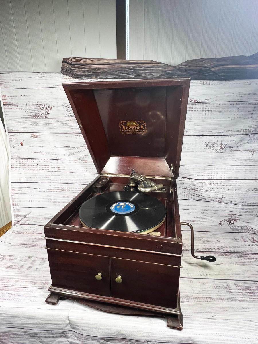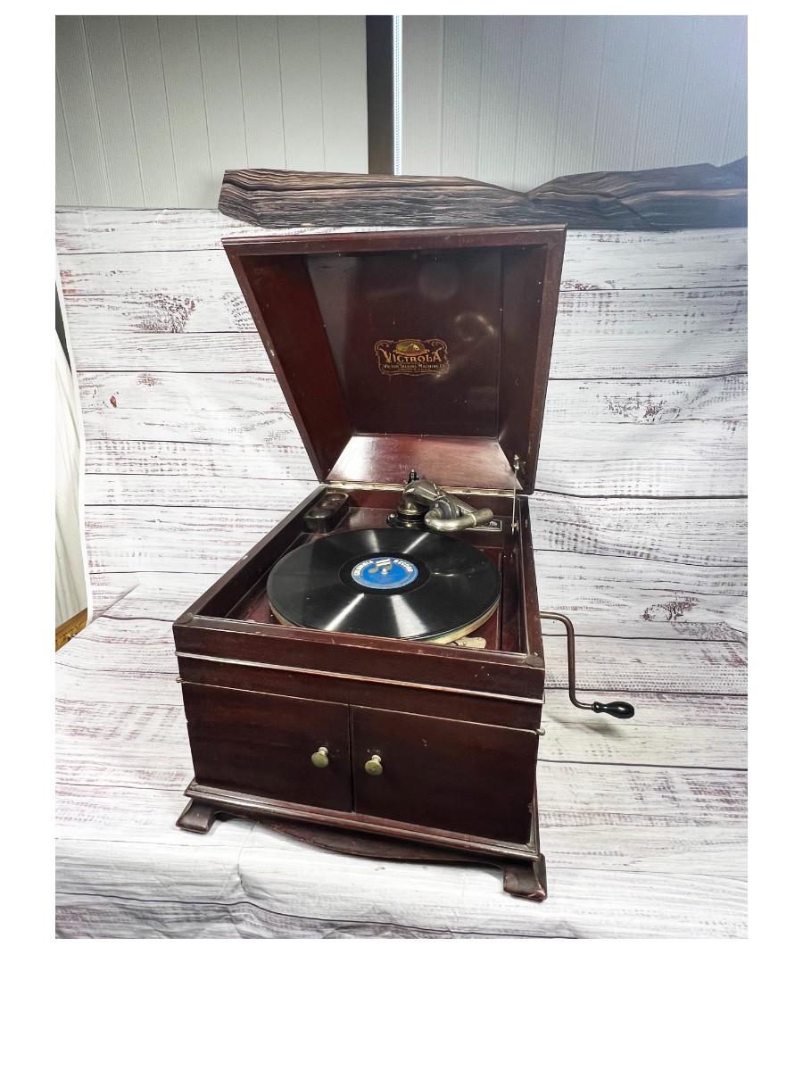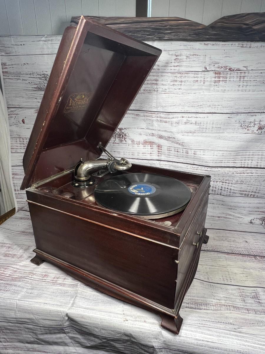 Antique Wooden Victor Victrola Talking Machine Tabletop Phonograph Model VV-IX, there is some light wear to the wood, but there is no significant damage and is in overall good condition for its age. Has been tested, the crank, turntable, speed adjustment, and needle all work to produce the sound from the record. Check pictures for more details and for sizing, the record comes with the phonograph.