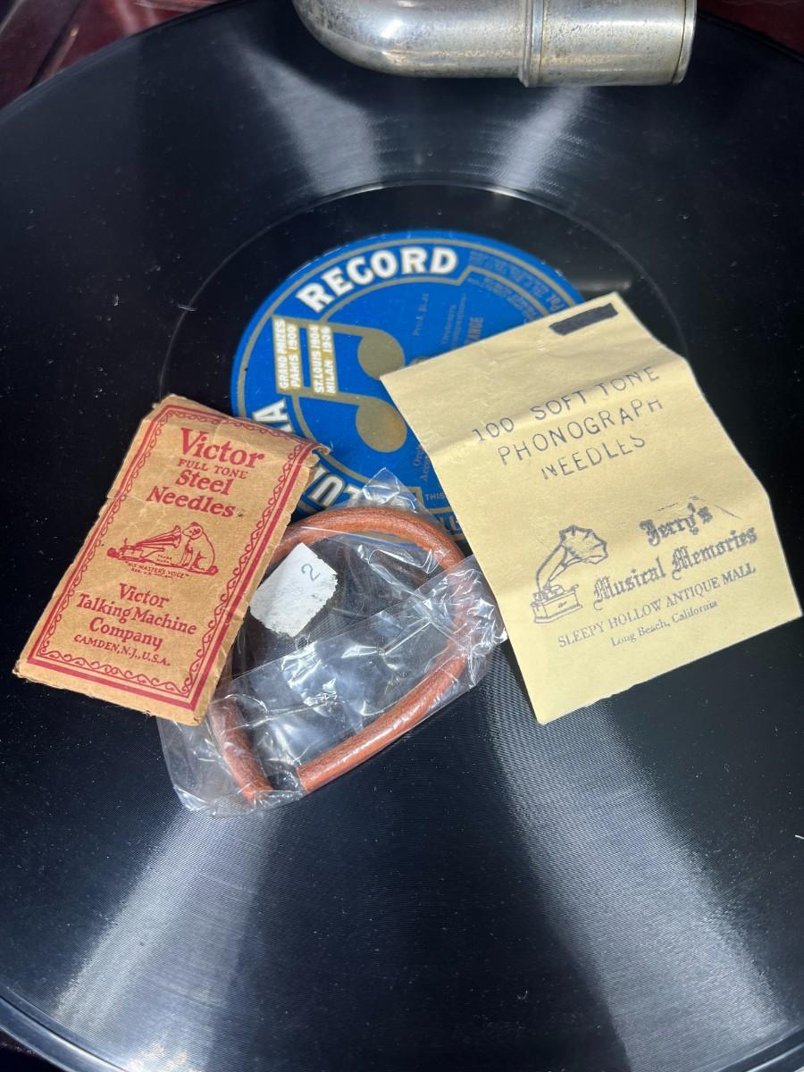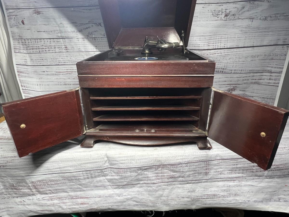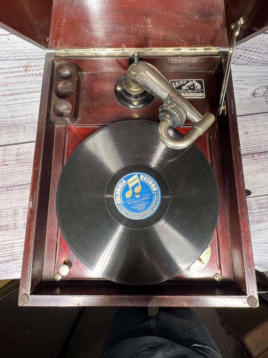 Antique Wooden Victor Victrola Talking Machine Tabletop Phonograph Model VV-IX, there is some light wear to the wood, but there is no significant damage and is in overall good condition for its age. Has been tested, the crank, turntable, speed adjustment, and needle all work to produce the sound from the record. Check pictures for more details and for sizing, the record comes with the phonograph.