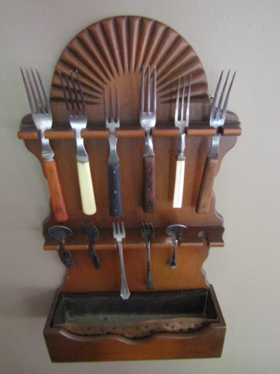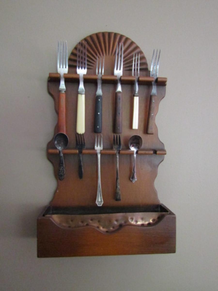 Antique Wooden Wall Hanging Spoon Rest- Utensils Included