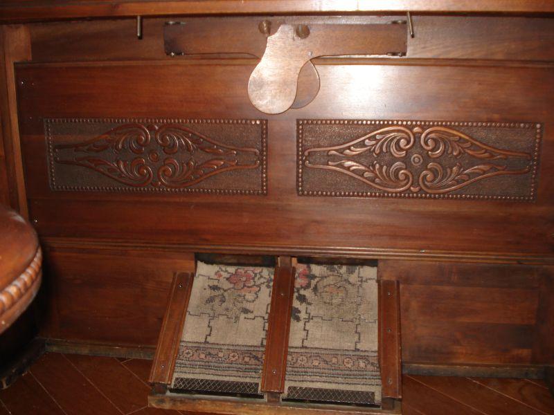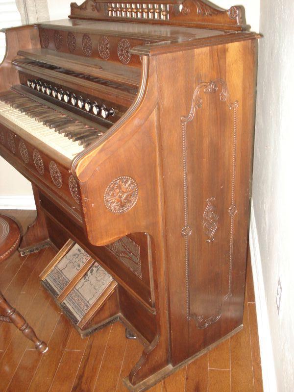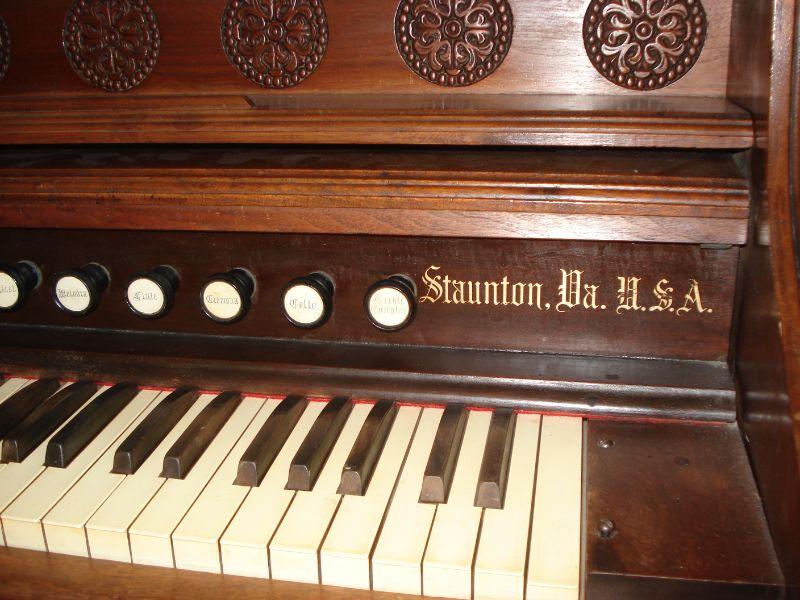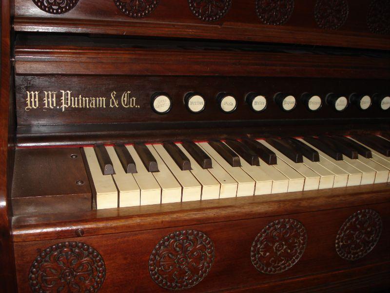 Antique working Pump Organ with stool made by W.W. Putnam & Company, Staunton, PA U.S.A. it measured 45" wide by 20" deep. Has beautiful decoration all over it. A definite conversation piece that would look good in any room.