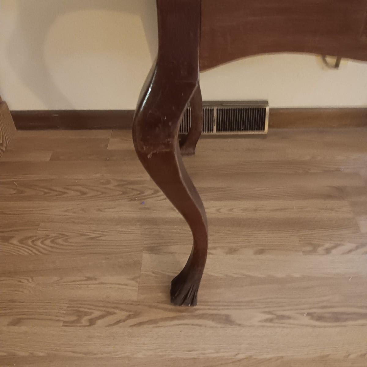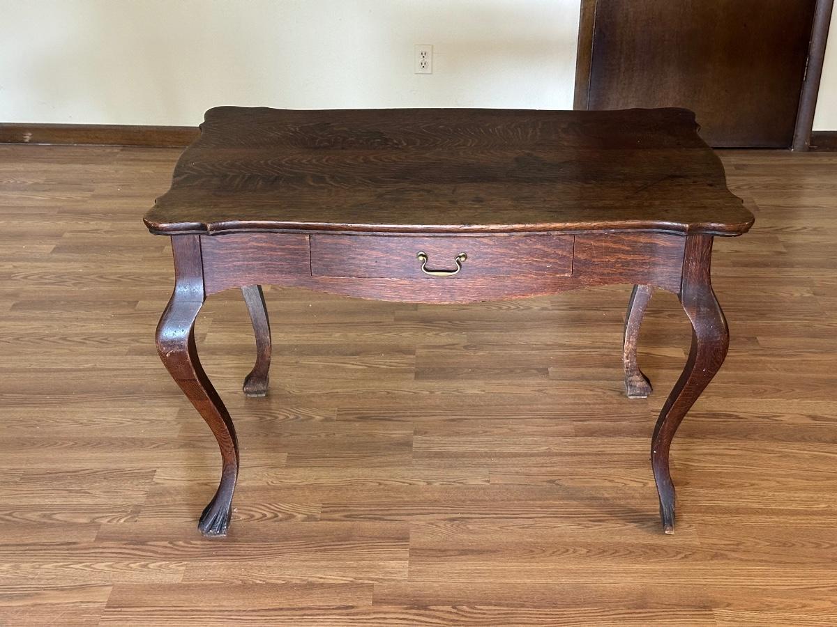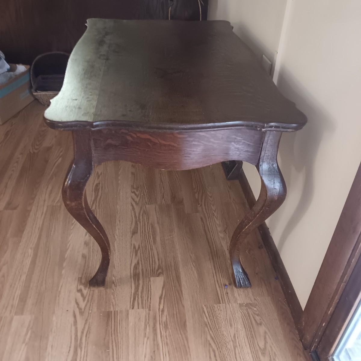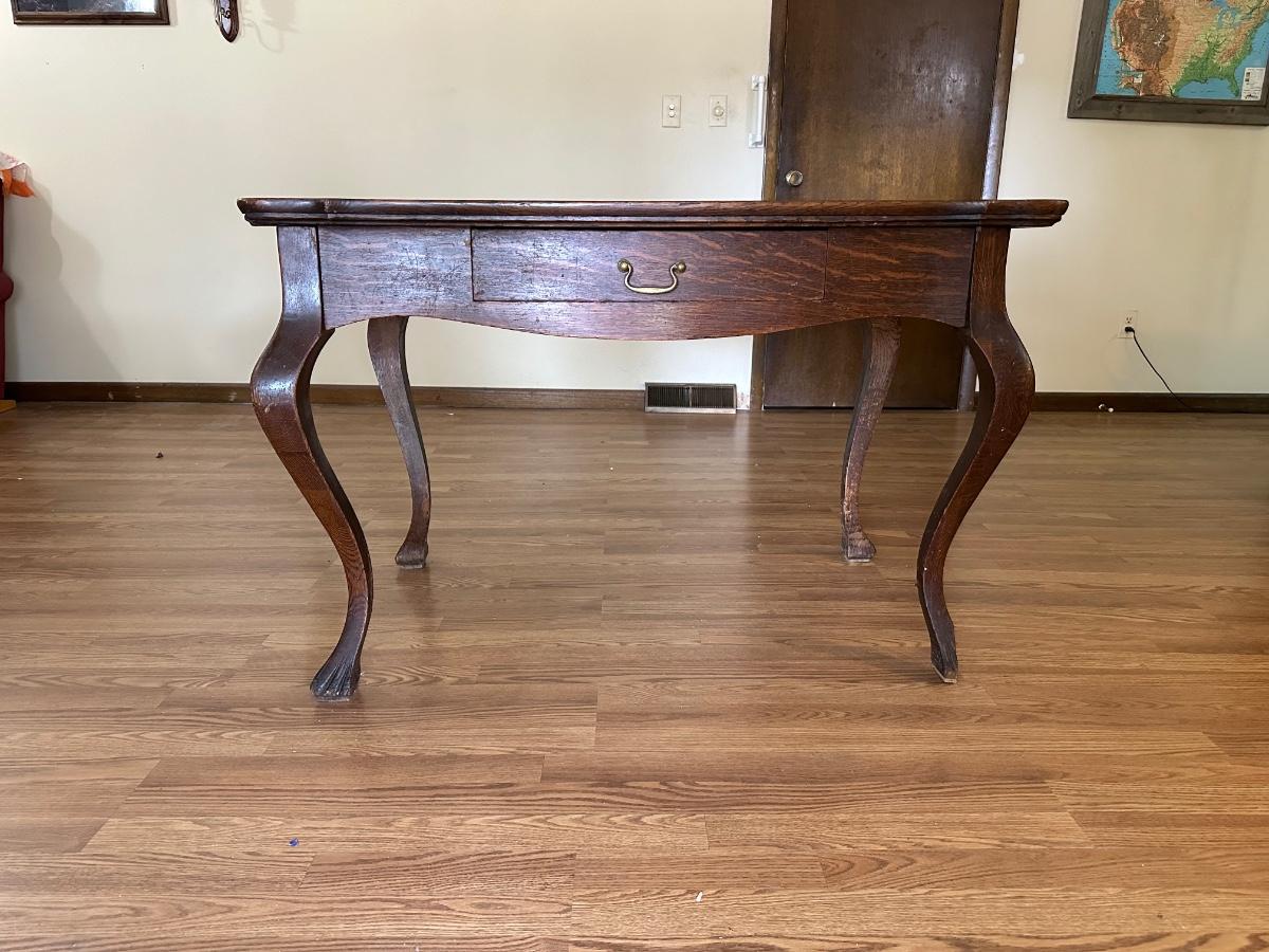 45 X 28 X 30 1 OF THE FEET IS MISSING PART OF THE CLAW AND THERE IS SOME INK? (BLACK SPOTS ON THE TOP OF DESK. ALSO, THE INSIDE OF DRAWER IS CRACKED