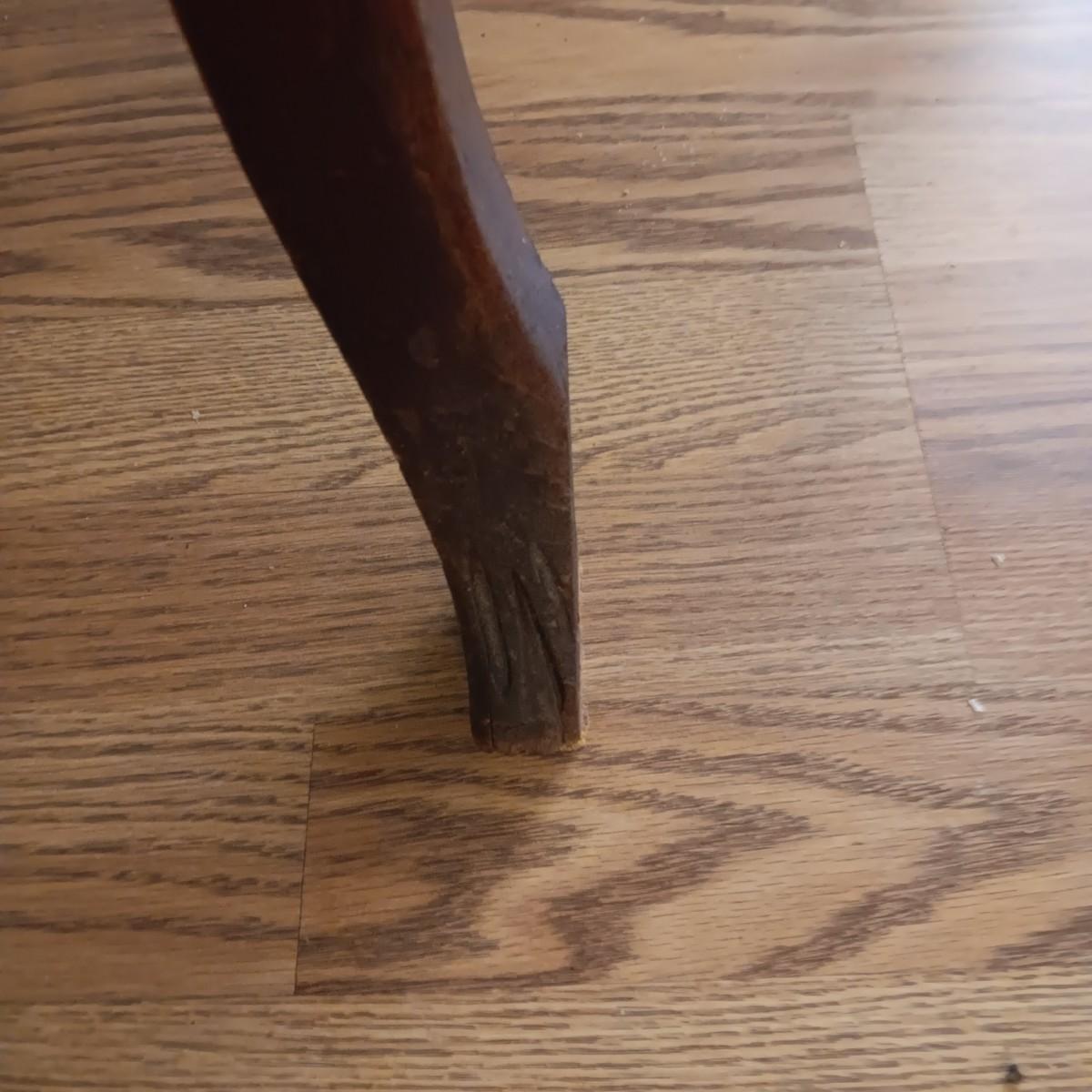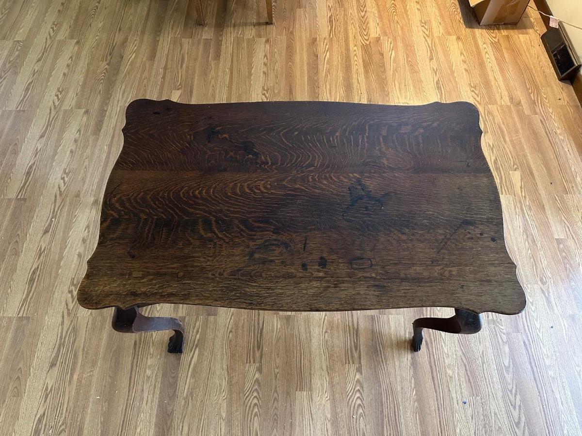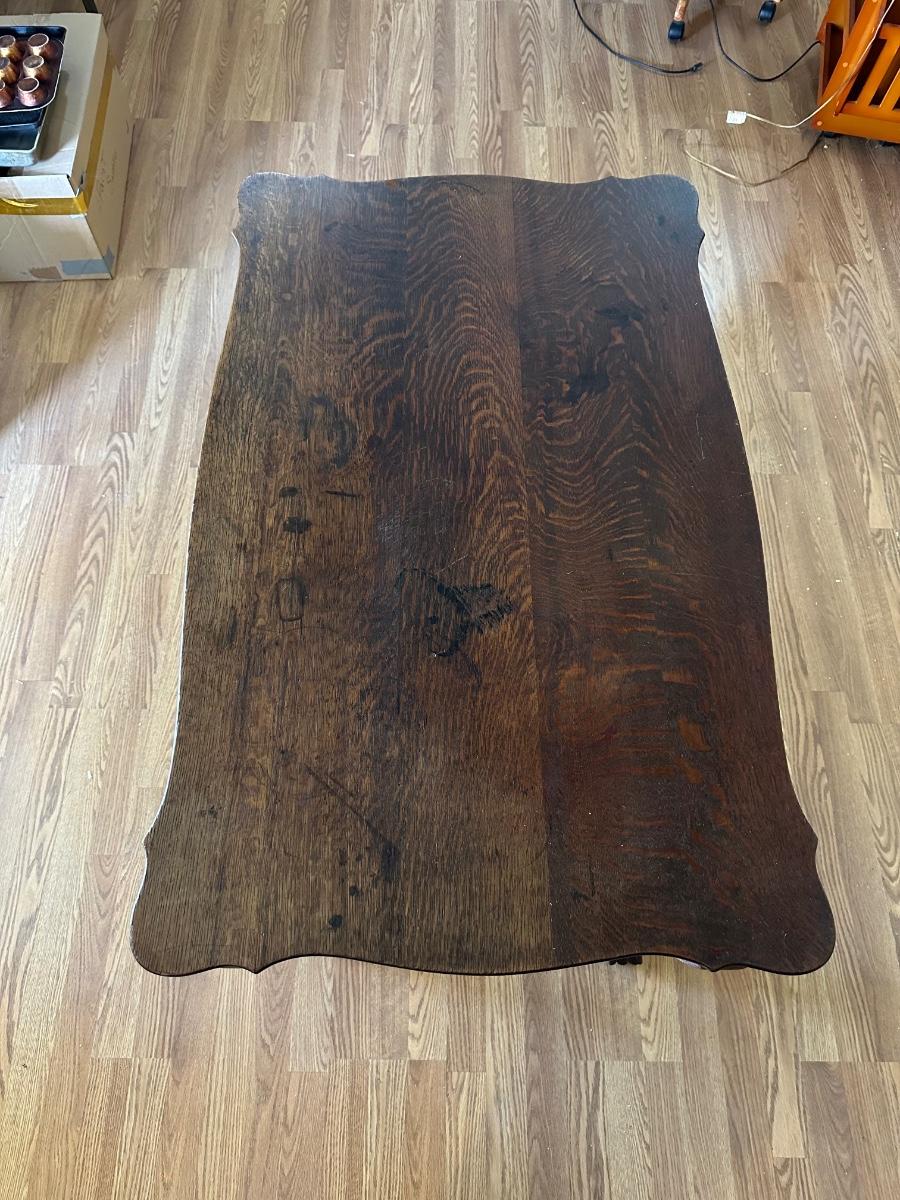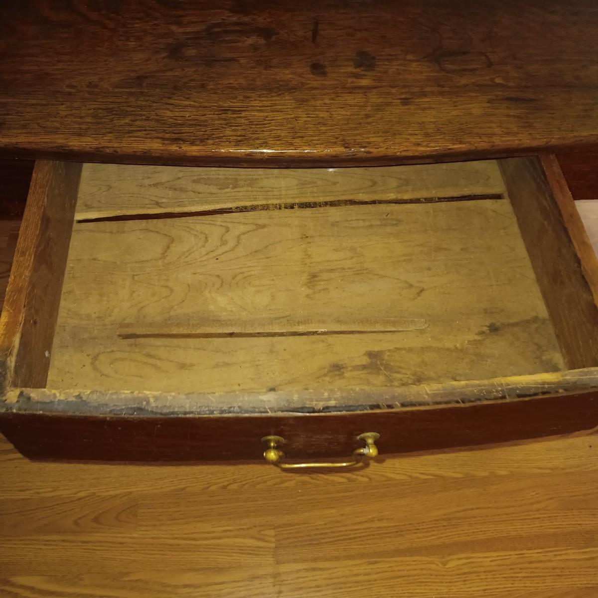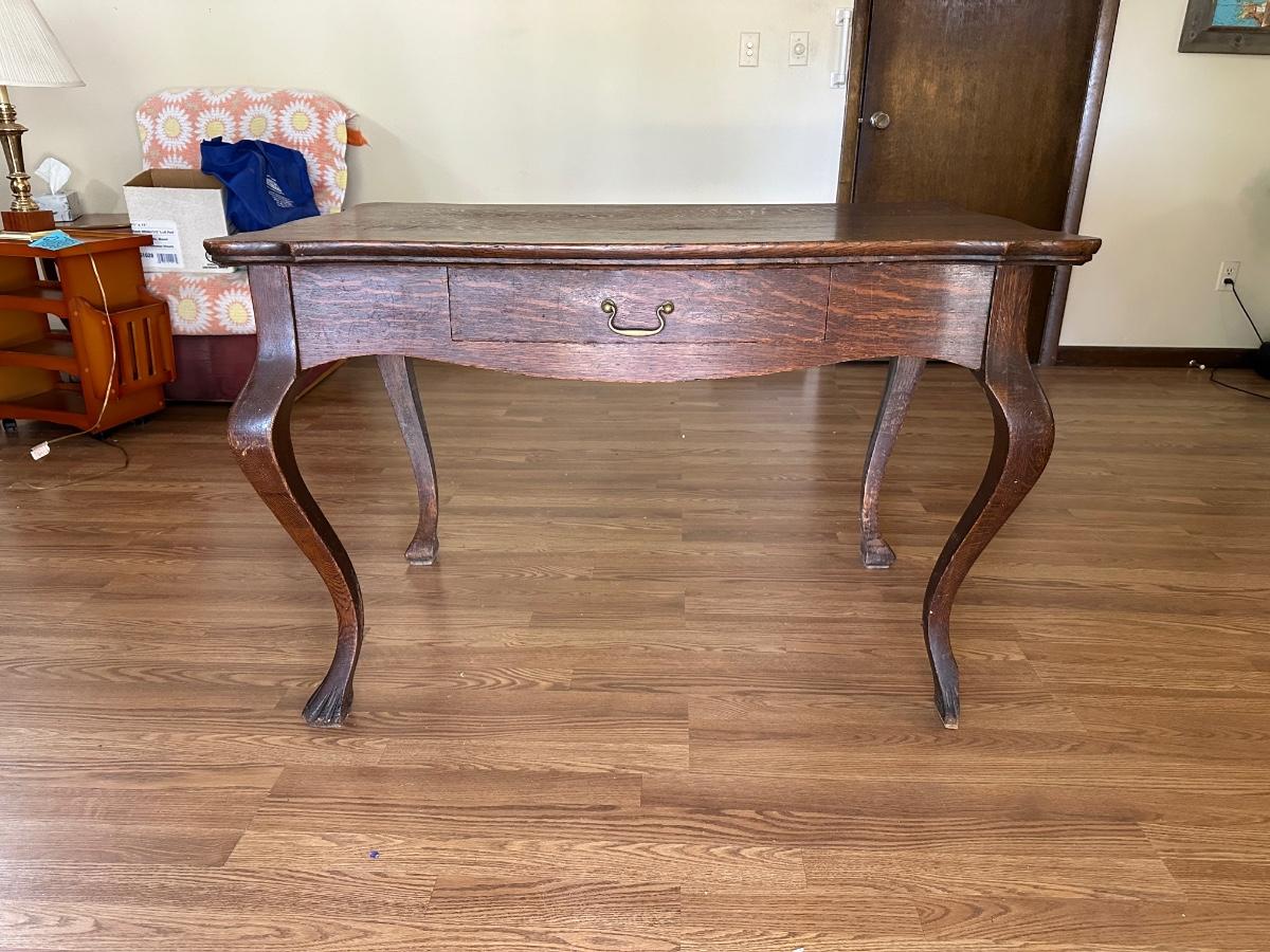 45 X 28 X 30 1 OF THE FEET IS MISSING PART OF THE CLAW AND THERE IS SOME INK? (BLACK SPOTS ON THE TOP OF DESK. ALSO, THE INSIDE OF DRAWER IS CRACKED