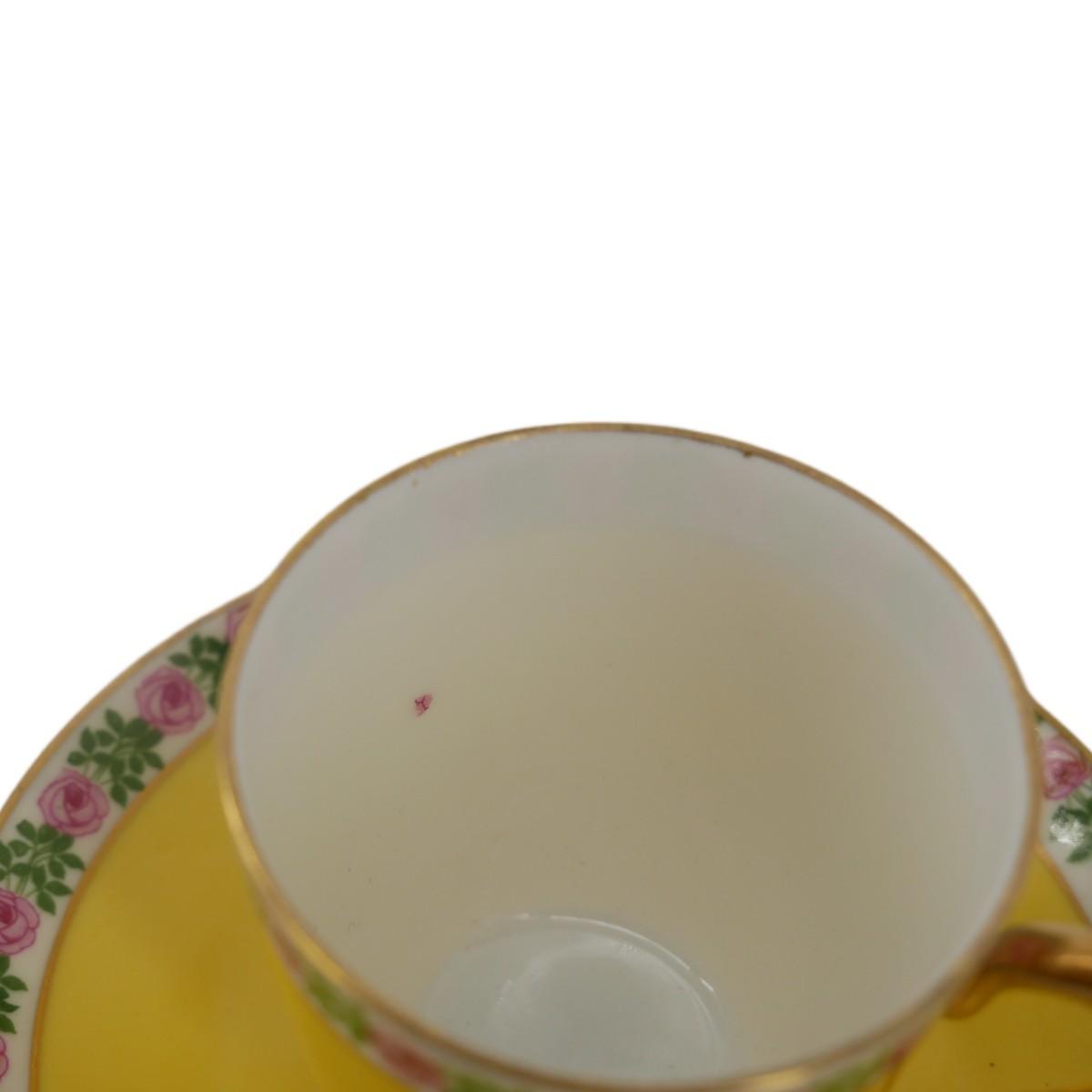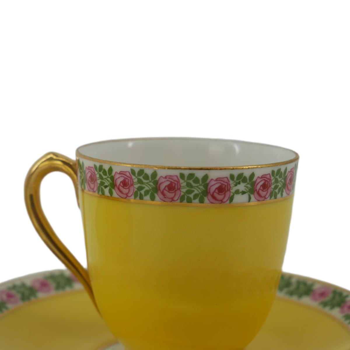 Small antique yellow with pink and green rose banded tea/demitasse cups and saucers. Marked "Imperial China, Austria" on bottom of all. Superb condition! One small flaw in one cup which happened during its production. Each cup measures approximately 2" in diameter and 2" in height. Each saucer measures approximately 4.5". Lot weighs 7 oz. (G37)