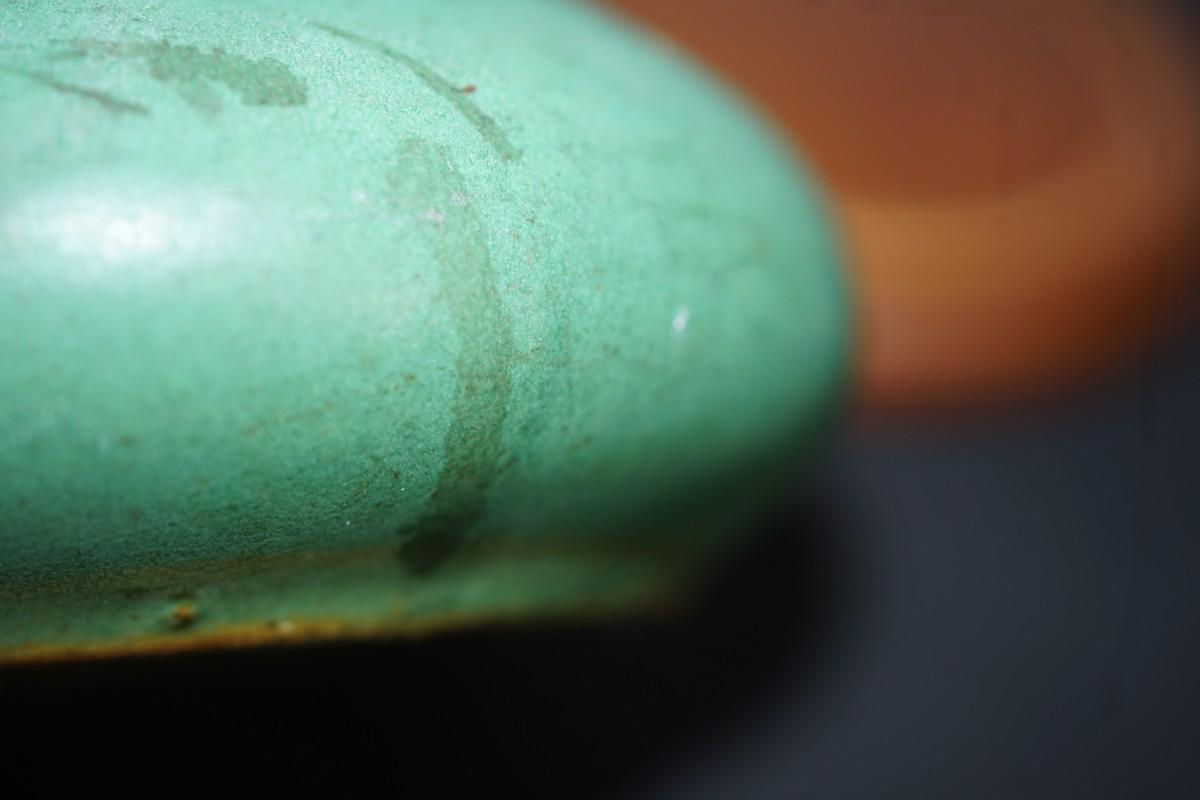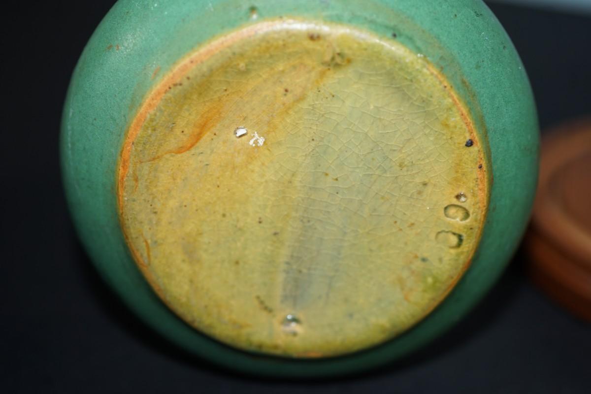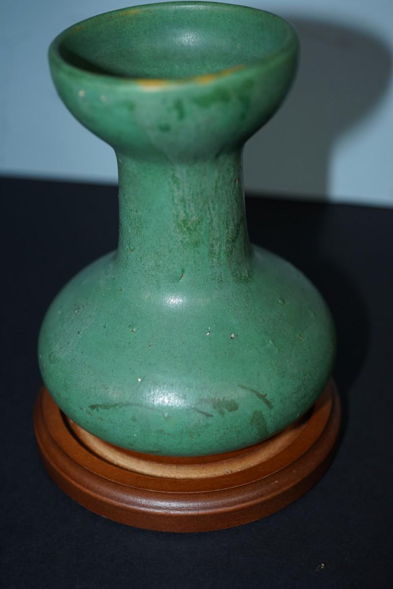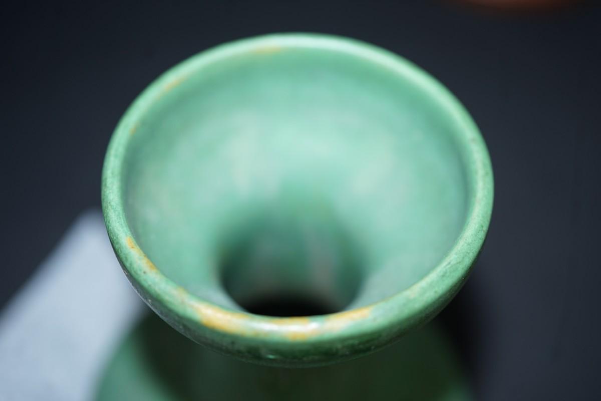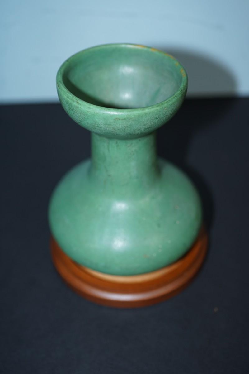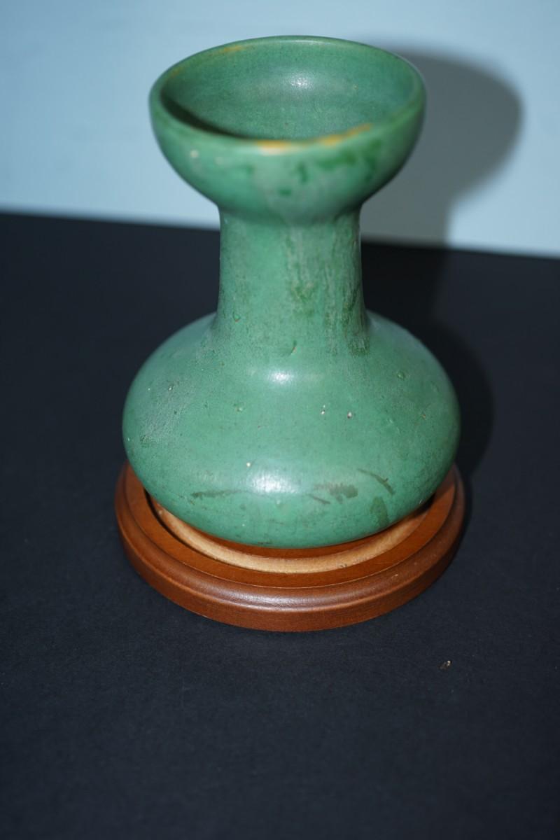 ANTIQUE ZANESVILLE MATT GREEN GLAZED 5 3/4" CORSET WAIST CERAMIC VASE