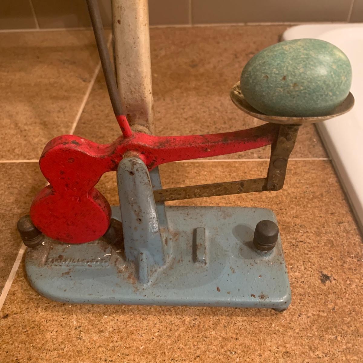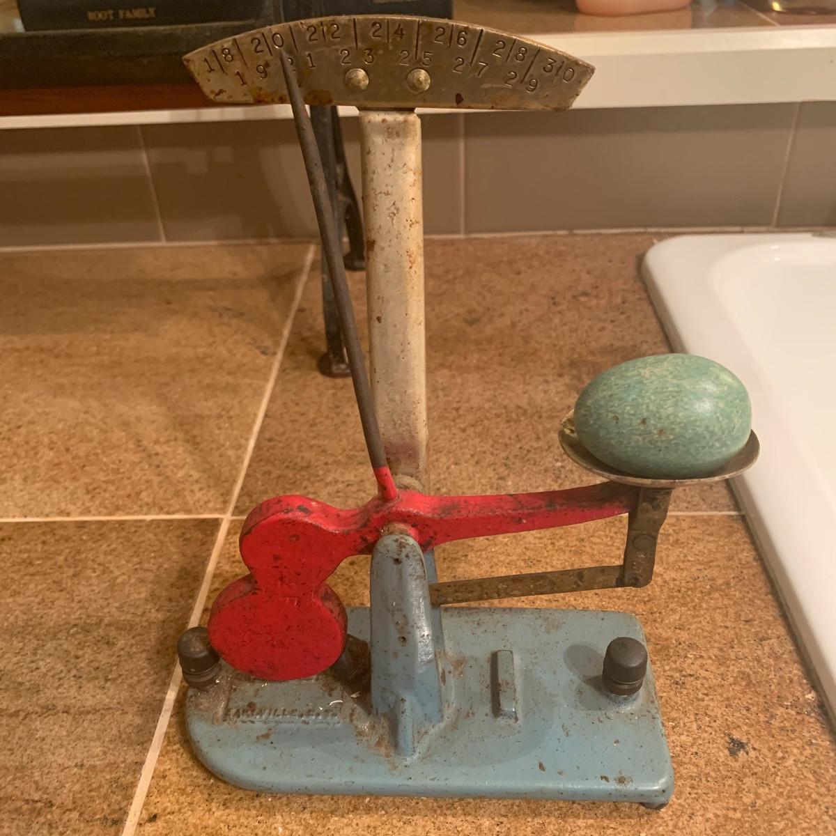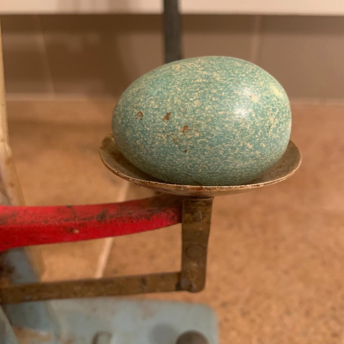 This lot features a cast iron vintage Zenith egg grading scale. This piece displays well, numbers are readable, and original paint is intact. It even comes with an artificial robin’s egg.
