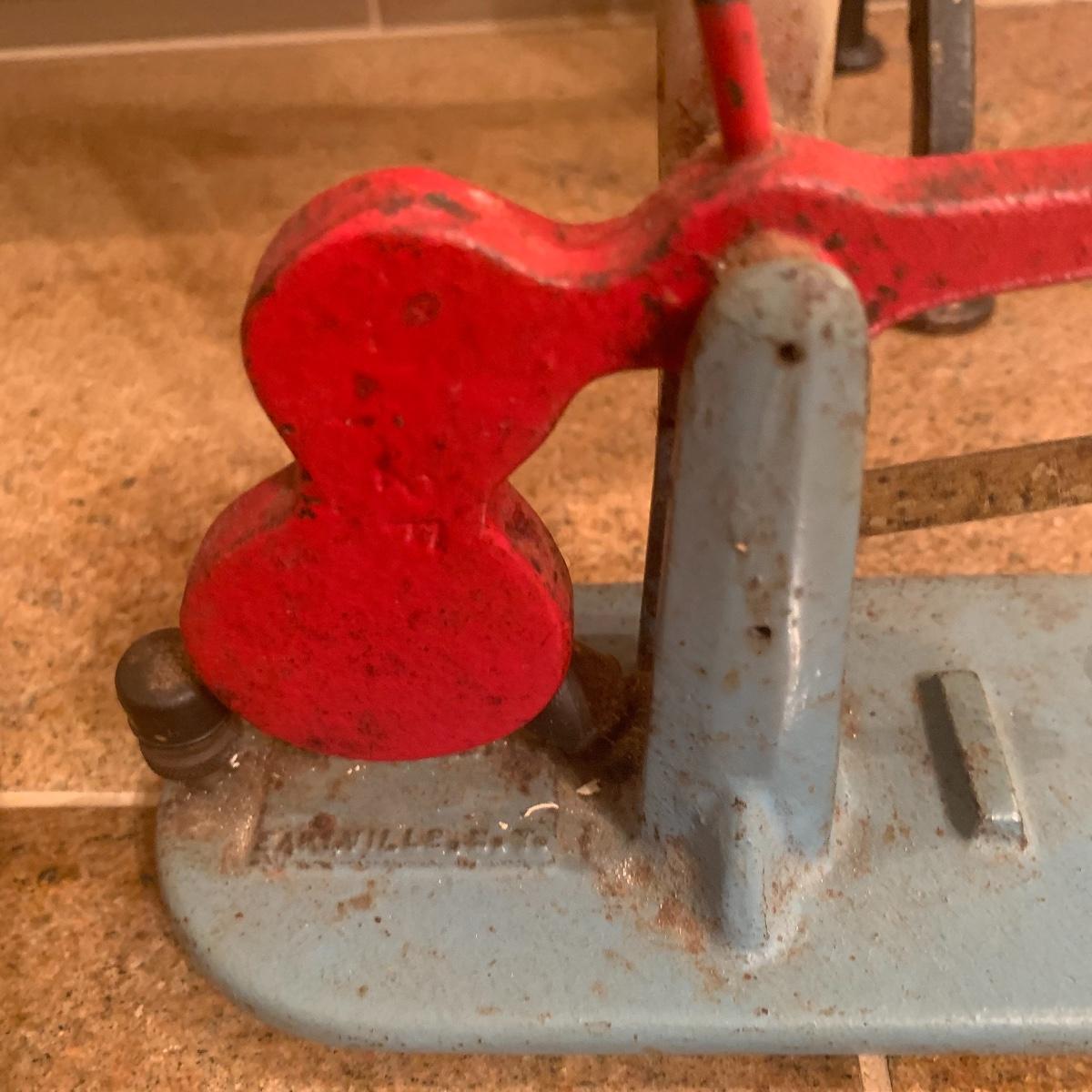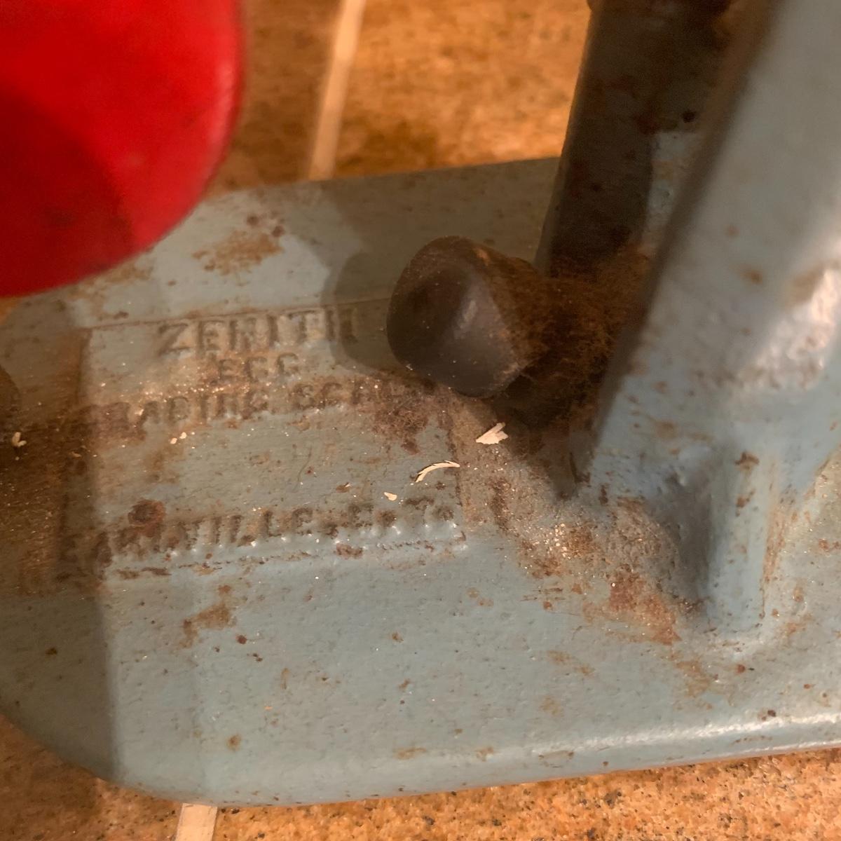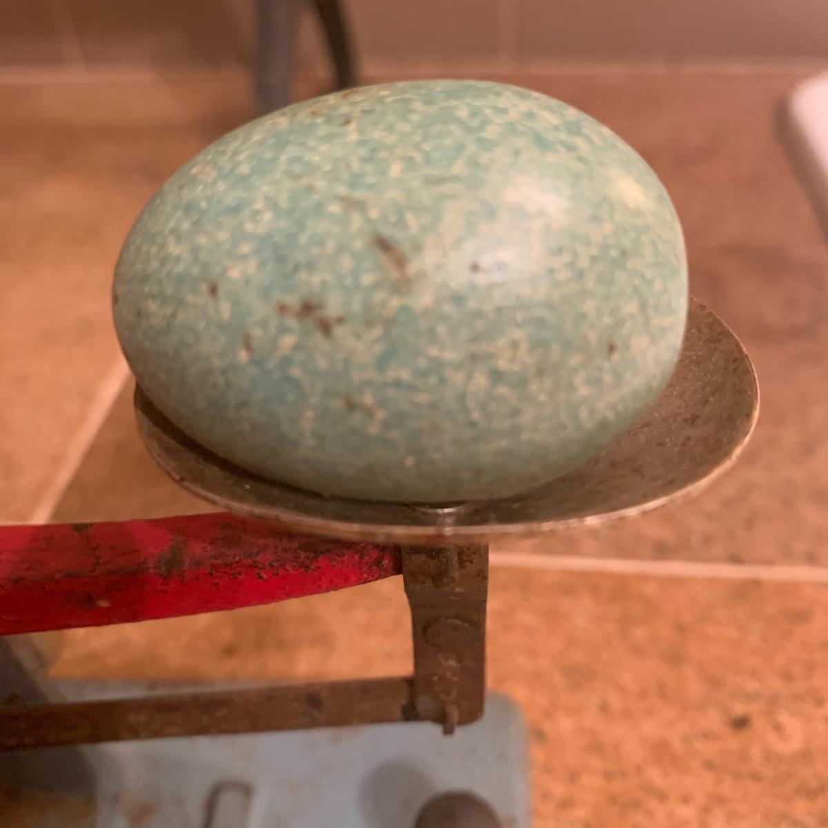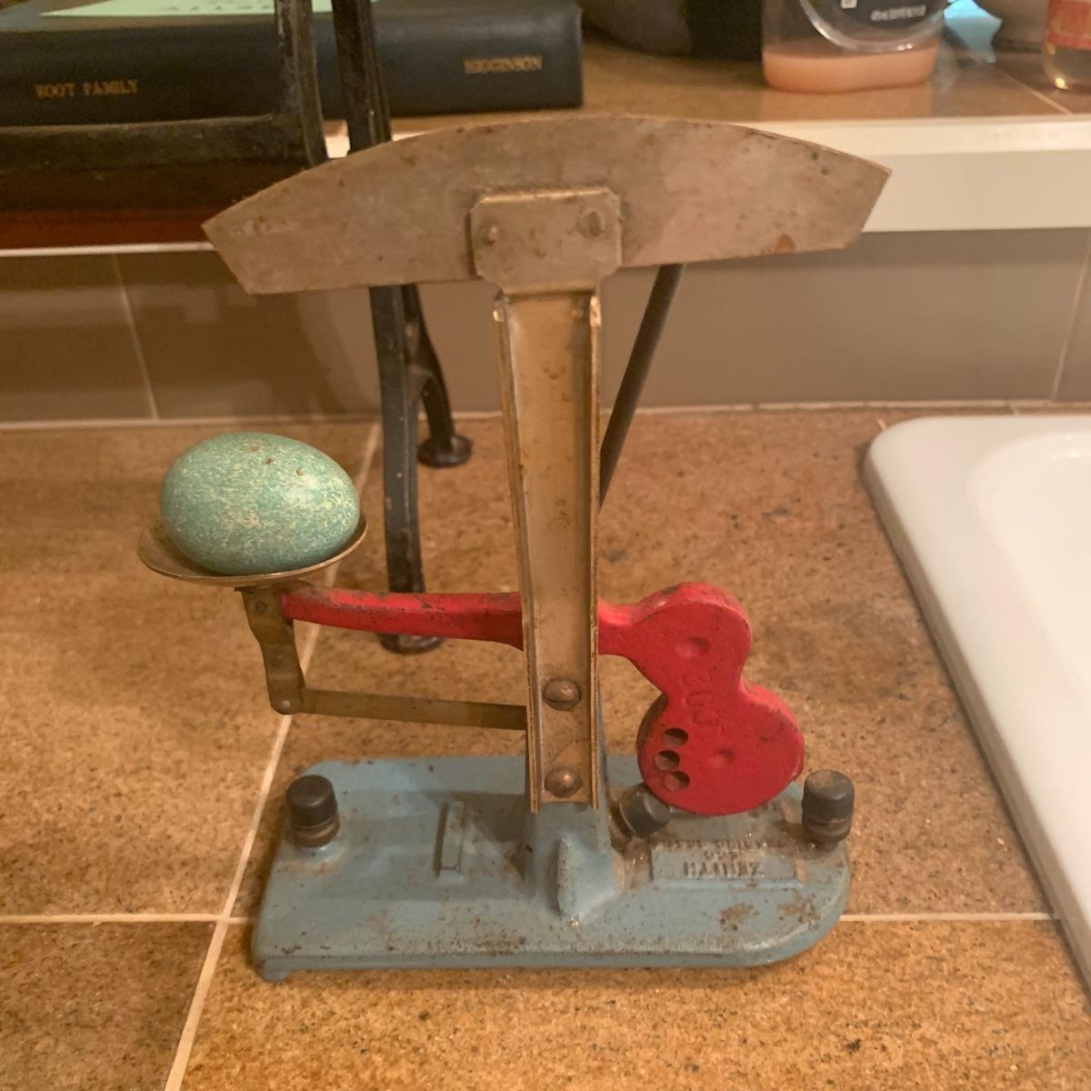 This lot features a cast iron vintage Zenith egg grading scale. This piece displays well, numbers are readable, and original paint is intact. It even comes with an artificial robin’s egg.