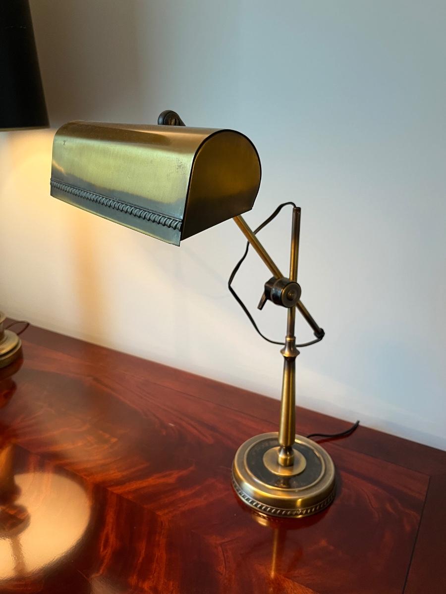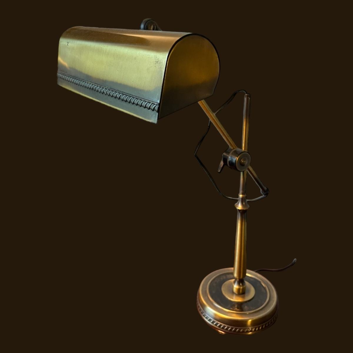18"h x 10"w--elegant antiqued brass desk lamp with adjustable arm and rope trim. Nice and heavy and in excellent condition.