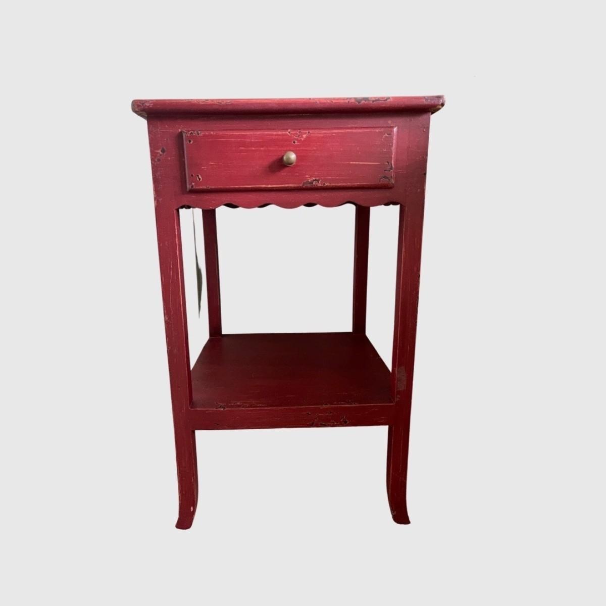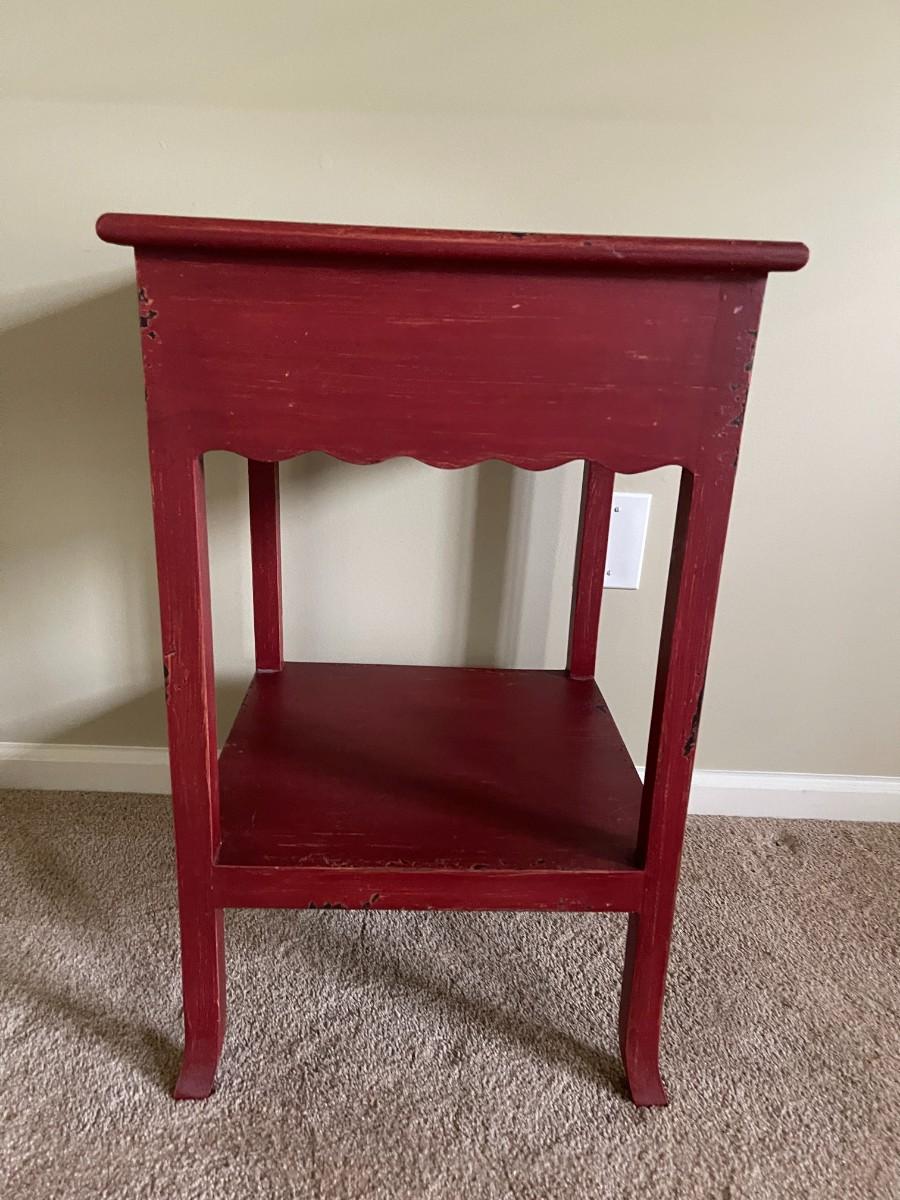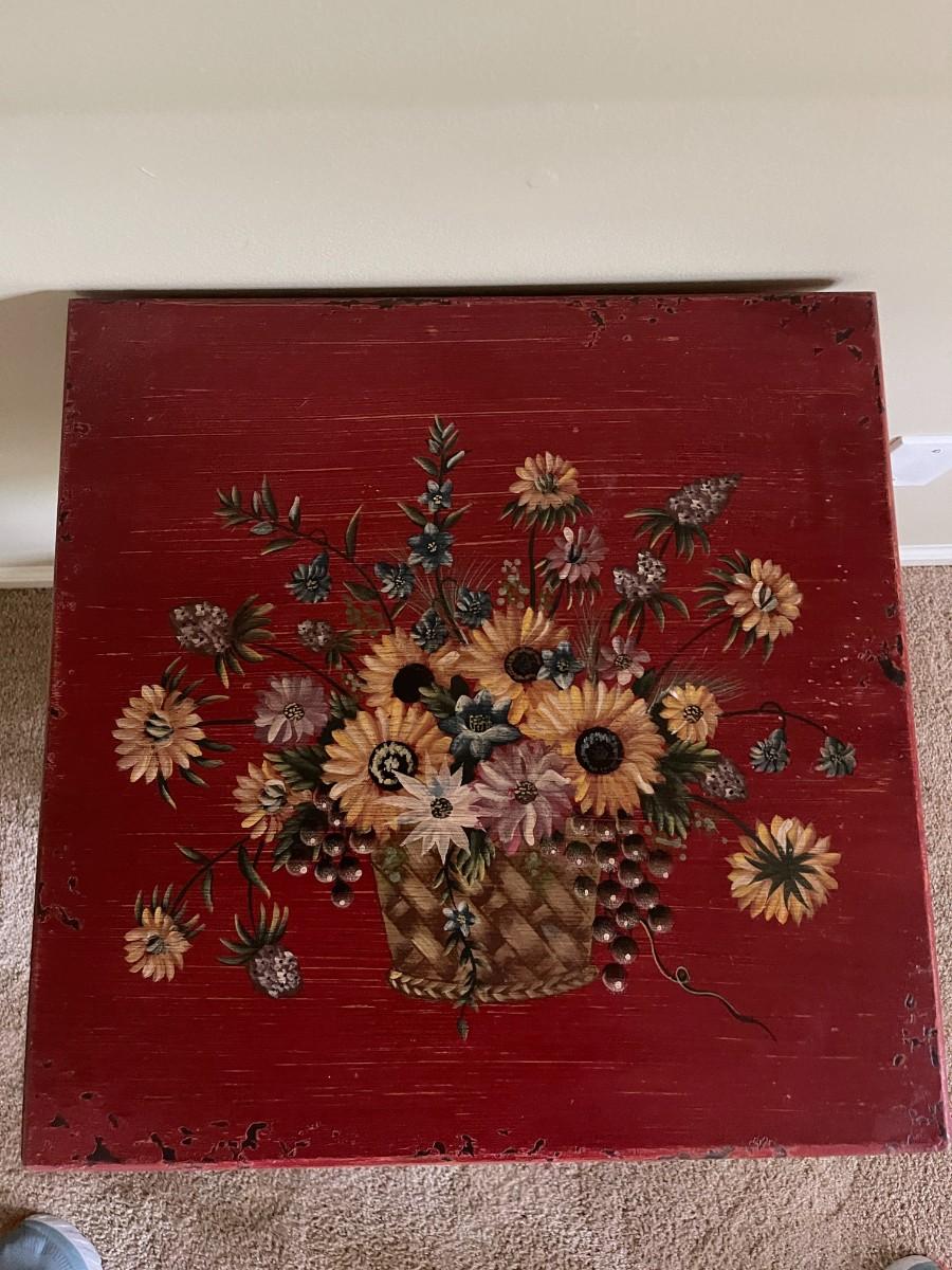 Antiqued Red Accent Table with Hand Painted Flower Design. Dimensions: Approximately 17" wide x 18" deep x 27 1/2" tall. # 110
