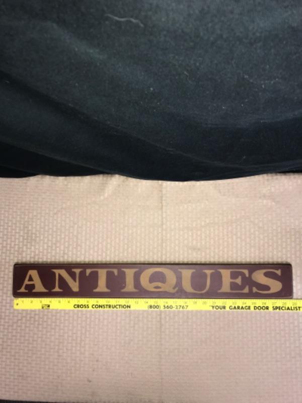 Auction consists of one wall ““ mounted sign that reads, “Antiques“. It measures 3.5” length by 29“ width. It has two brackets on the rear for mounting to wall via nails or screws.