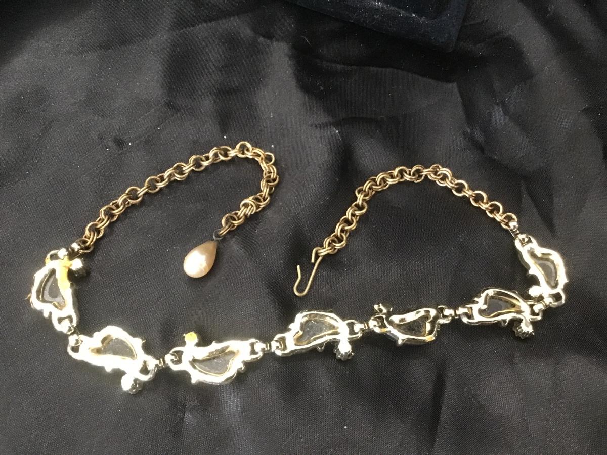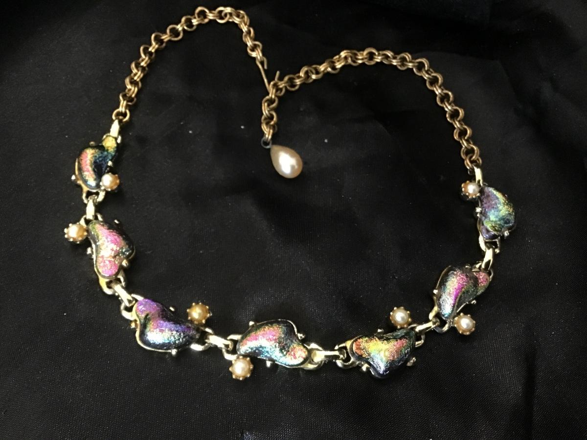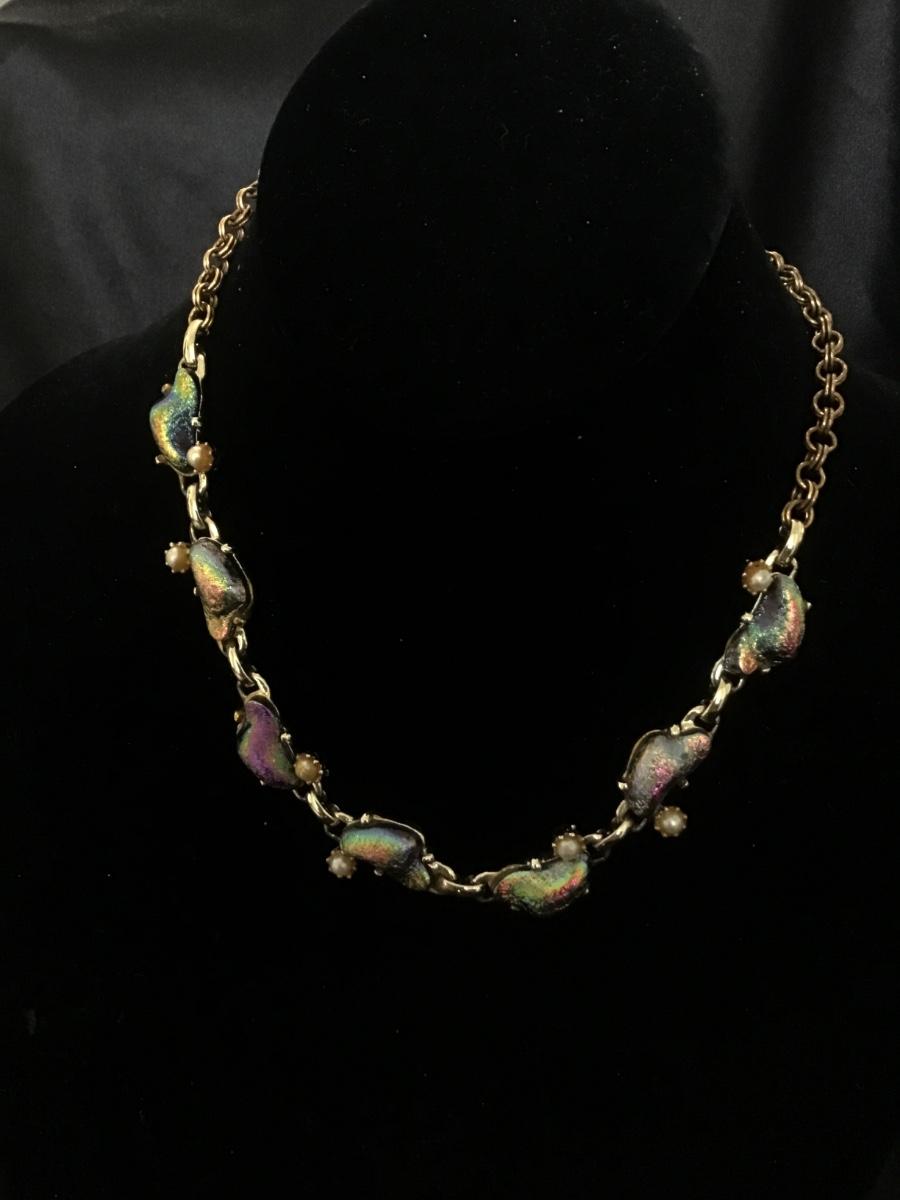 Antique/Vintage 1940’s Lava Art Glass Rock Iridescent Gold Tone Necklace 15”