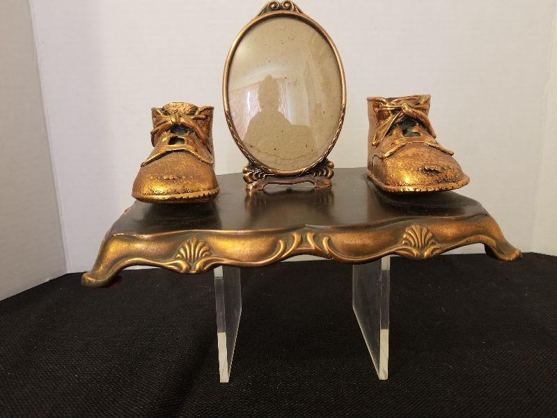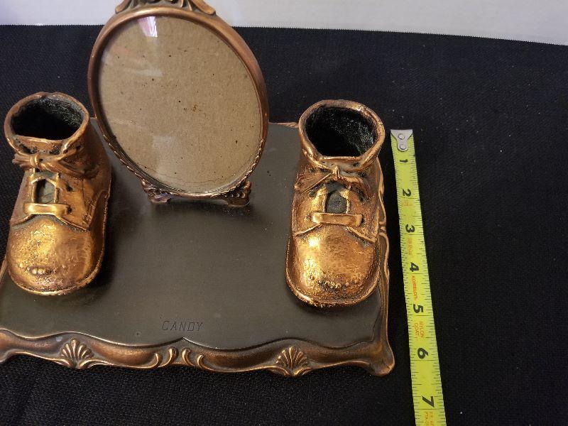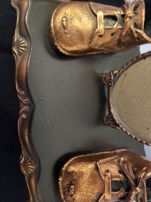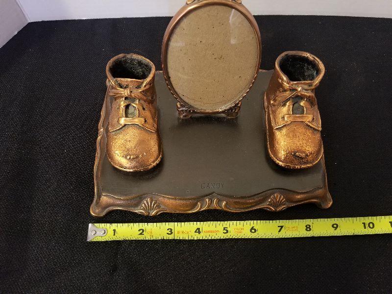 Antique/Vintage Cast Iron Copper Coated Picture Frame & Baby Shoes - #88-A