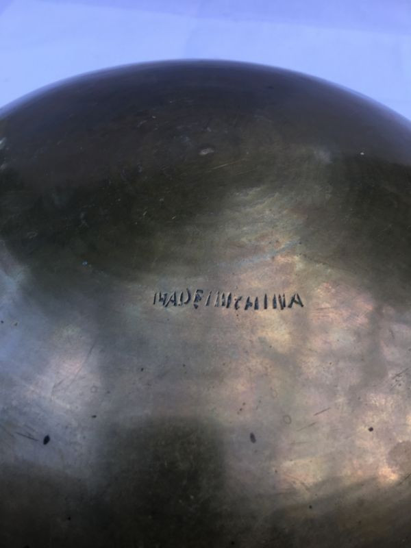 beautifully etched brass/cooper Chinese made 12" diameter bowl. Perfect as a center piece! Has a depth of 2.5" and is etched inside and around. Not stamped but a mid century piece. Left it as is, with the original patina.