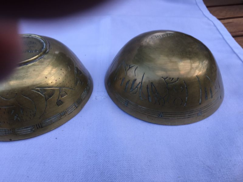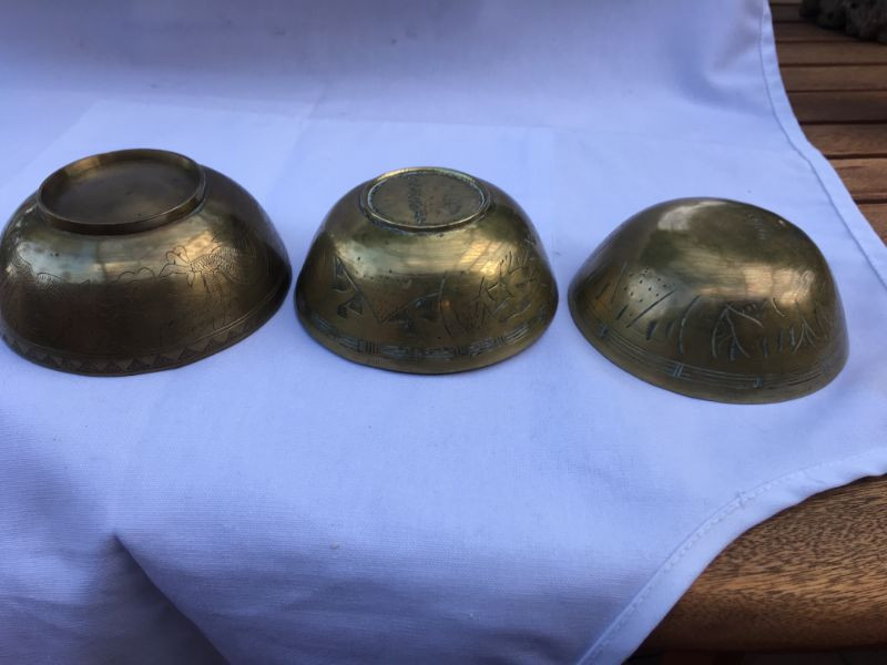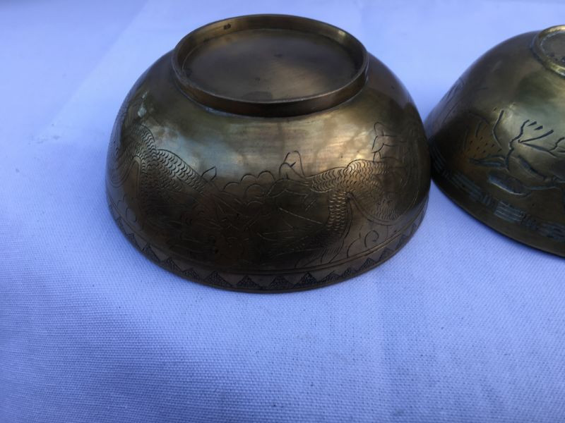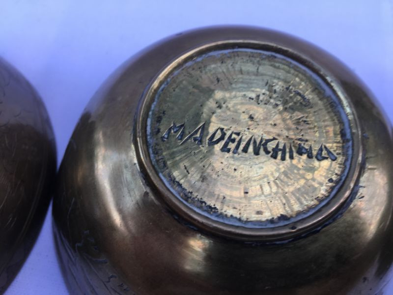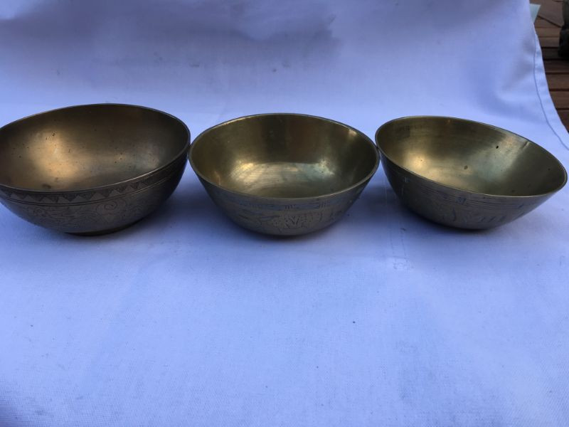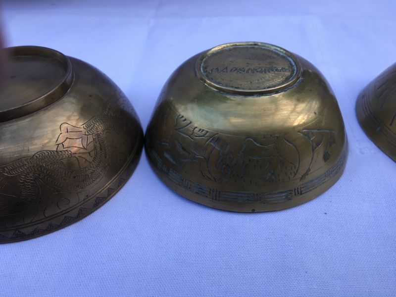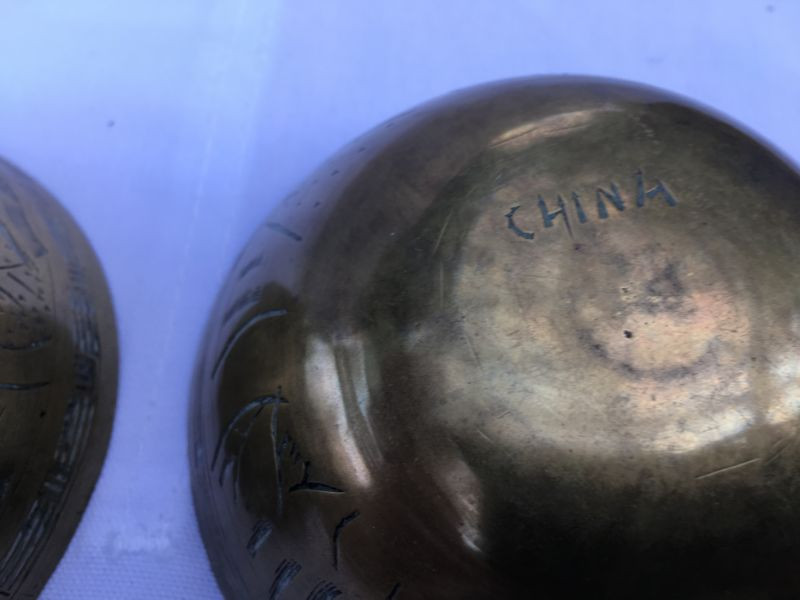 large beautifully etched brass/cooper Chinese made set of 3 small bowls. One is marked China, one is marked Made in China and the 3rd has no stamp. Each measures 4.5" in diameter and has a depth of 2". Left it as is, with the original patina.