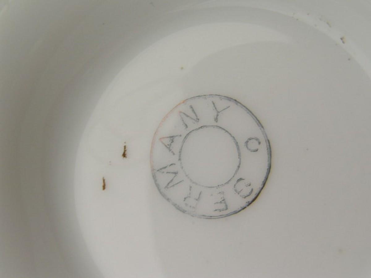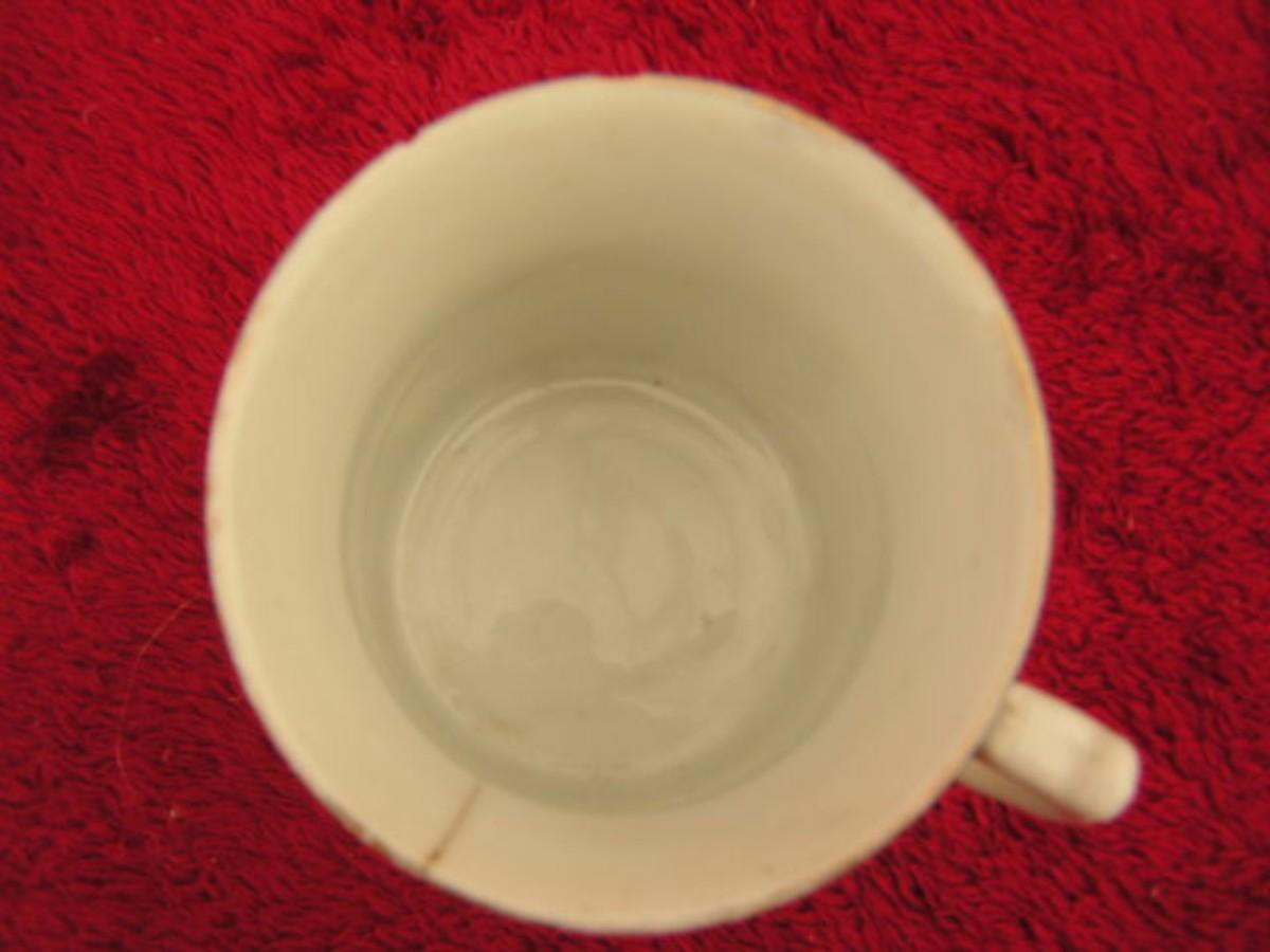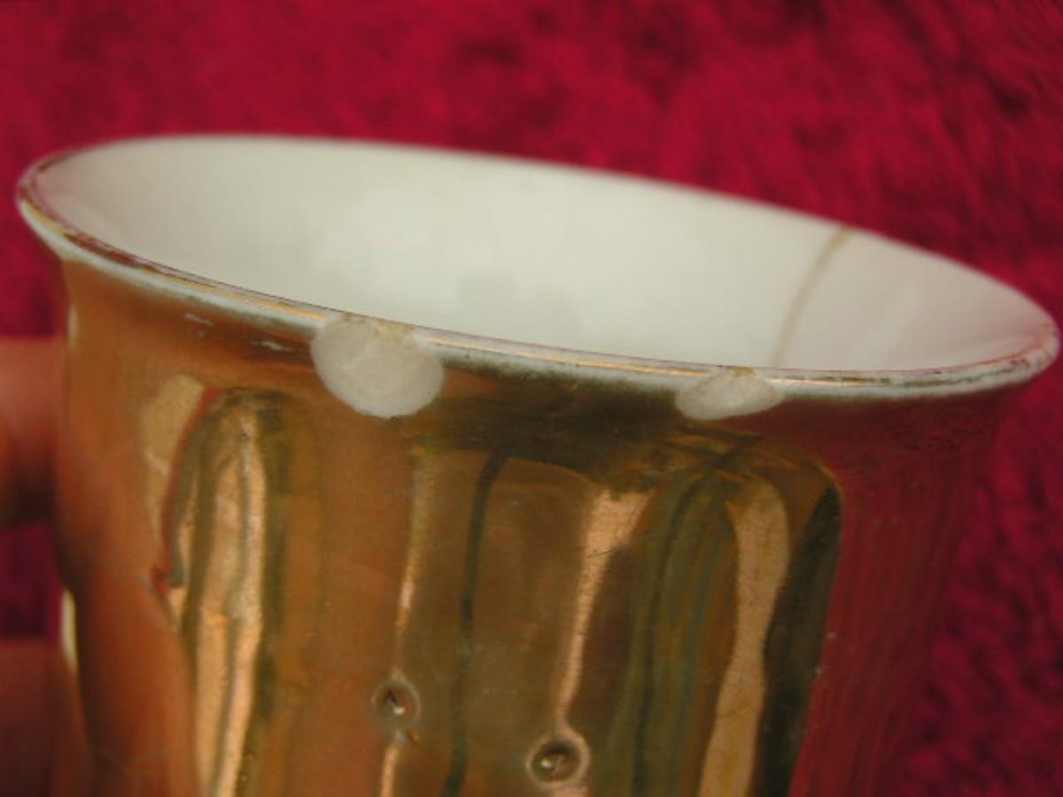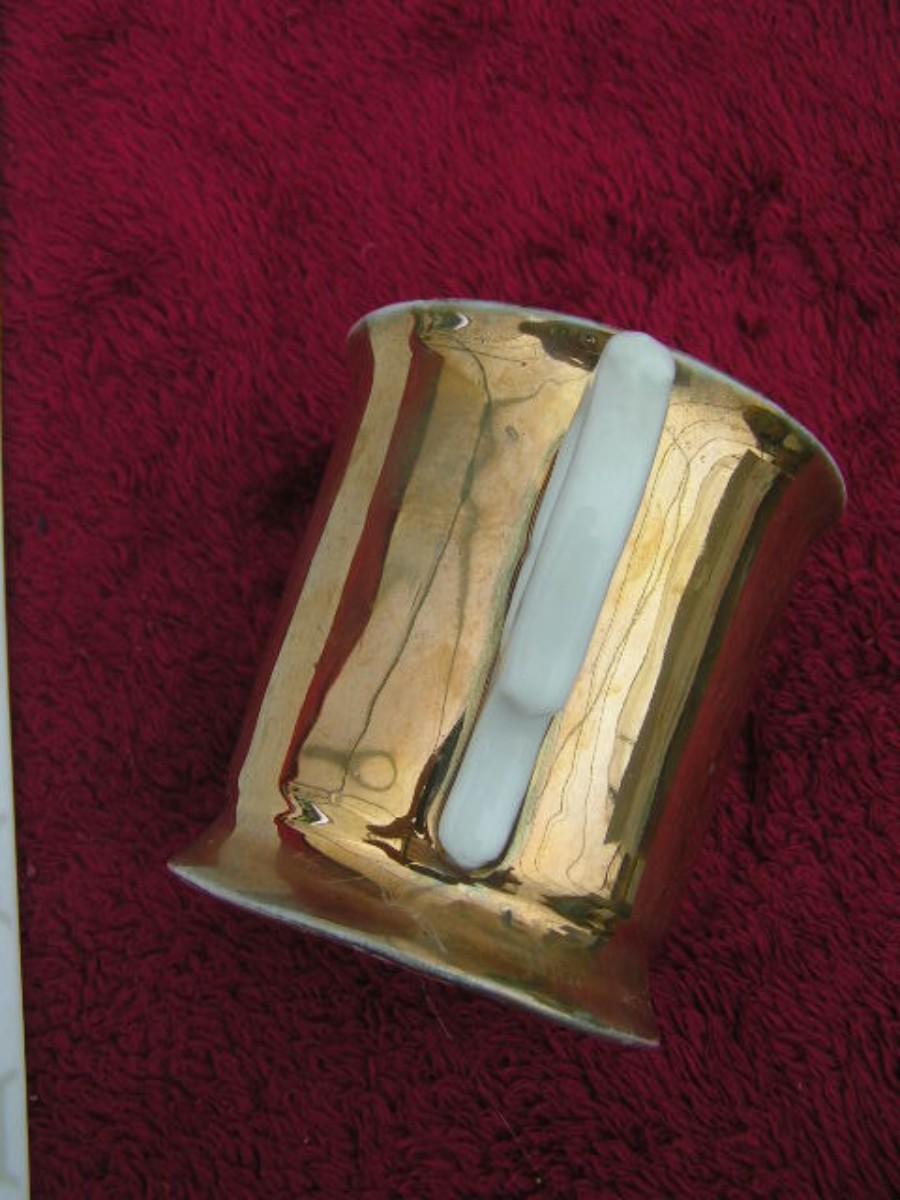Antique/VTG gold “shaving cup” used for shaving soap & brush for razor shaving. Gold on porcelain finish. Made in Germany. About 3½” tall. Fair condition, crazing inside & rim chips