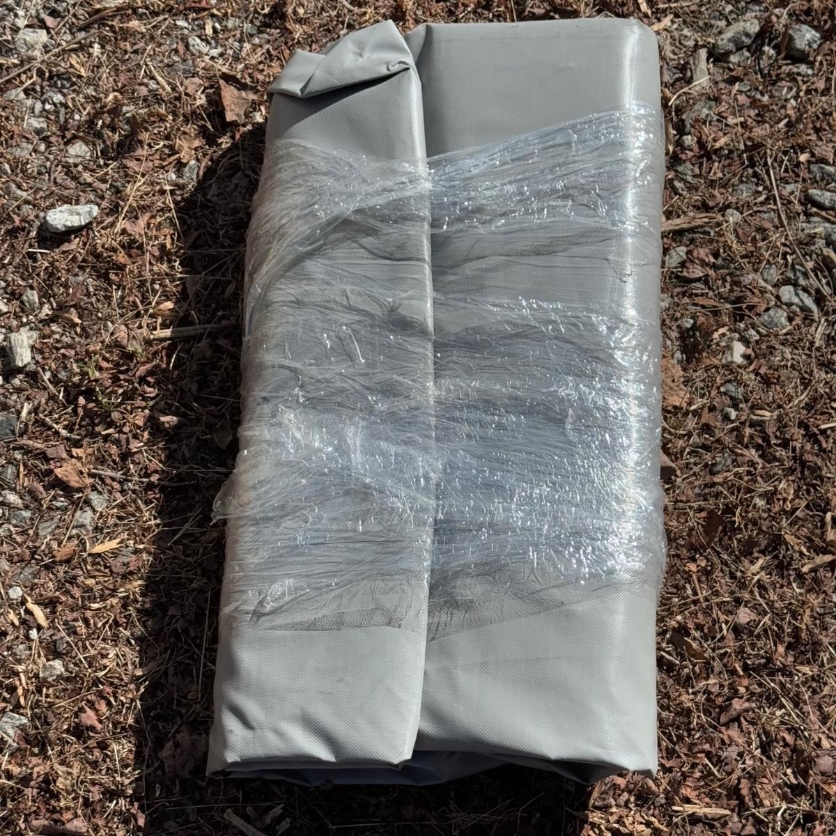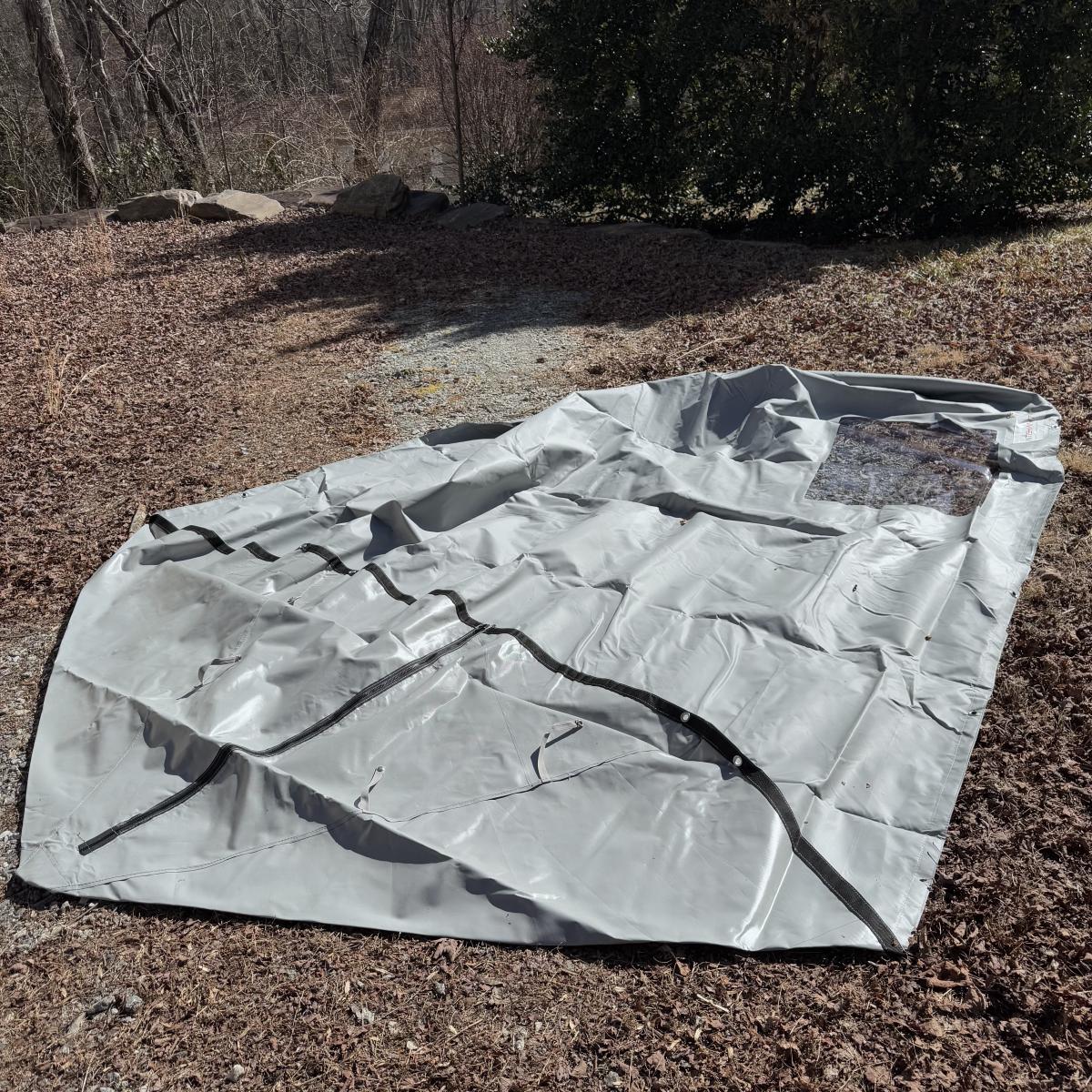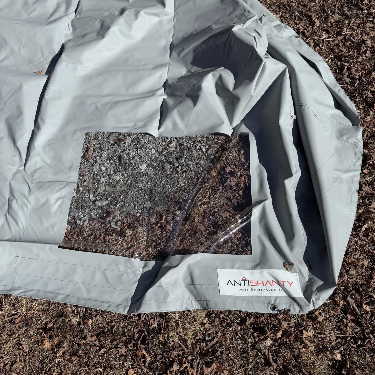 Lot includes one new Antishanty camper cover. The cover is waterproof and made of polyethylene. The cover has a section with a window. The cover measures 84” x 150”H.