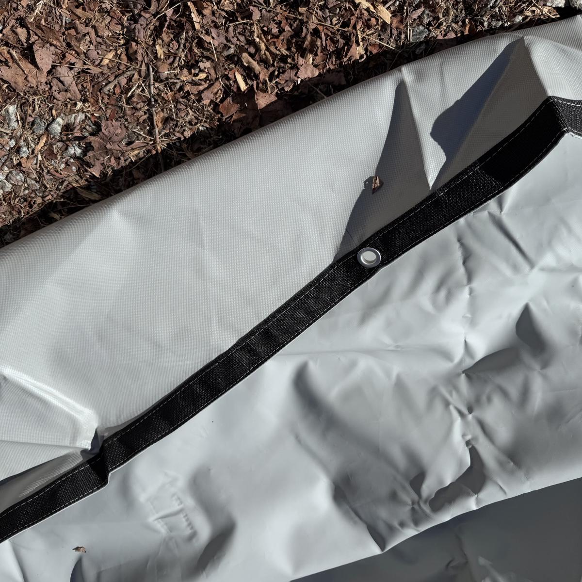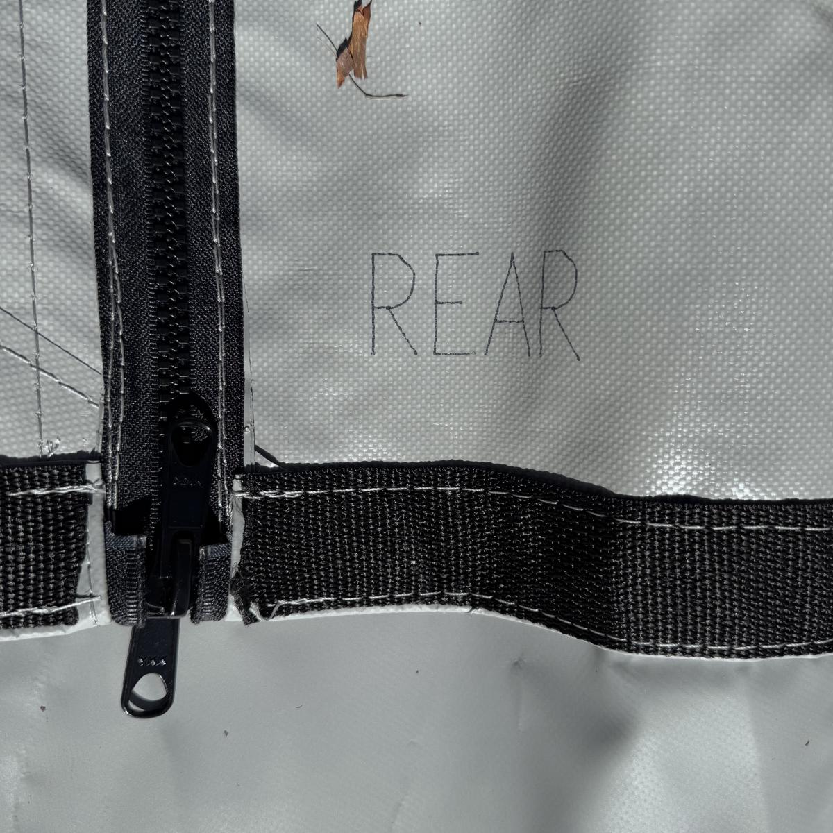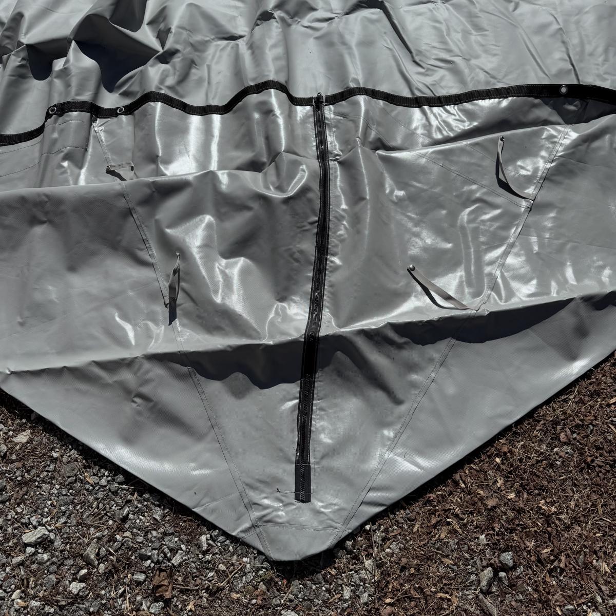Lot includes one new Antishanty camper cover. The cover is waterproof and made of polyethylene. The cover has a section with a window. The cover measures 84” x 150”H.