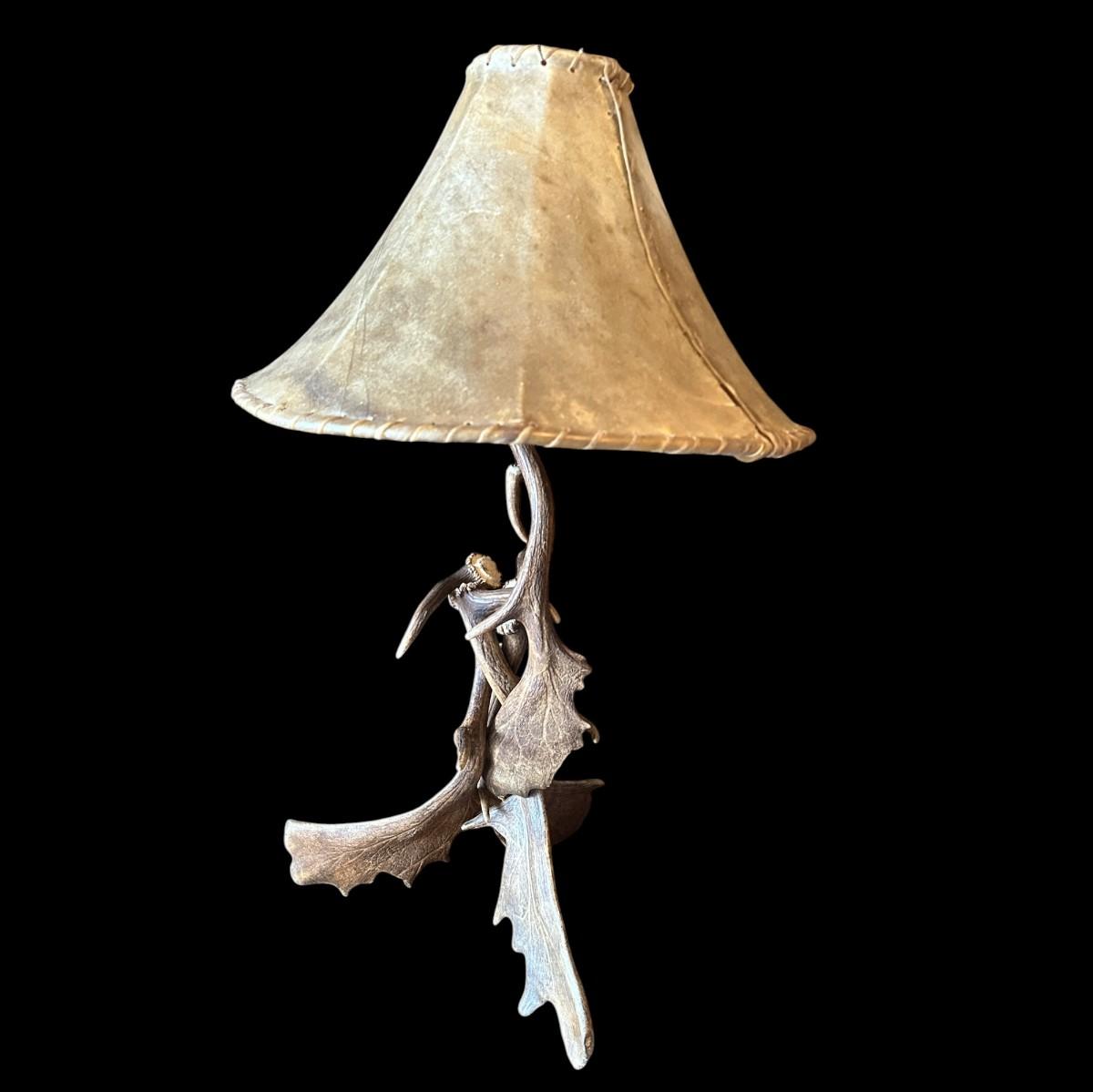 Rustic Free Standing Moose Antler Table Lamp With A Rawhide Translucent Shade