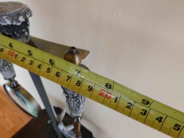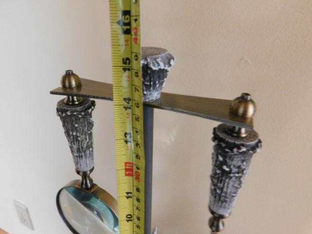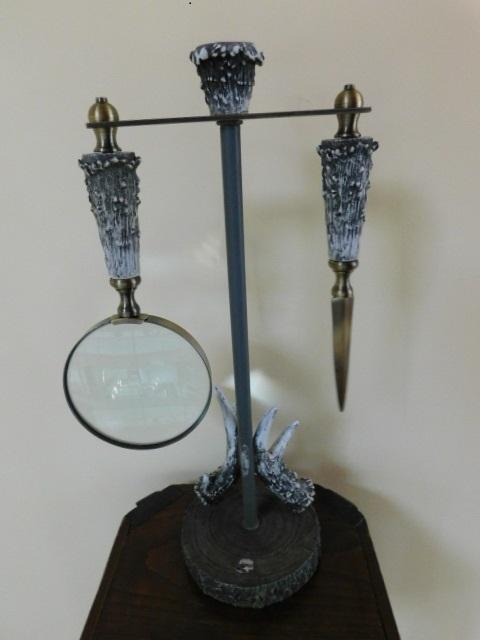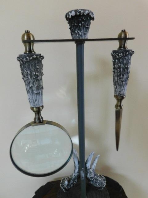 Antler Spyglass and Letter Opener with Stand Desk Set 15" has heavy brass binder around glass and sharp opener. Base has punch out spot but can be easily repaired or hidden. Nice looking item