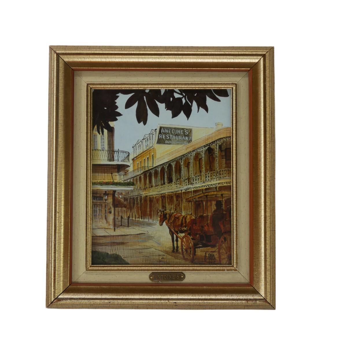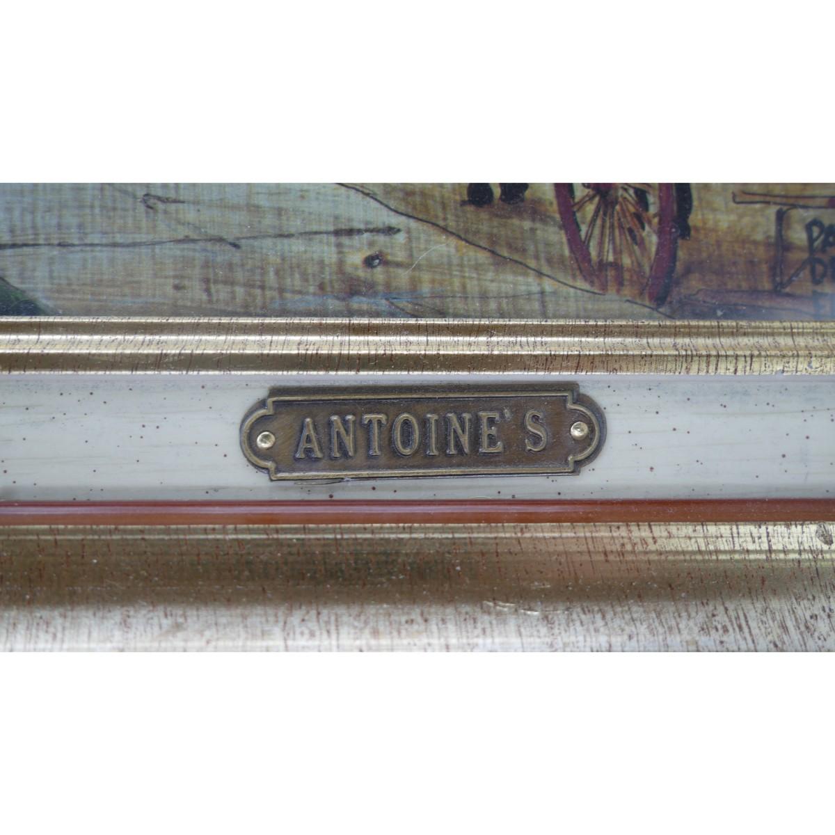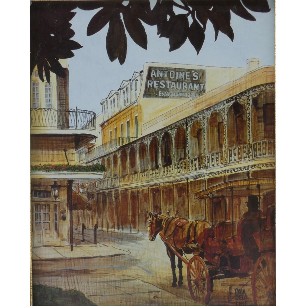 "Antonie's" Restaurant in New Orleans with horse drawn carriage by Paul de la Fille, (c. 1970s). Print signed and framed. Artwork is in excellent condition, frame needs new paper backing. Art measures 9.5" x 7.5", total frame measures 14" x 12" x 1". (A18)