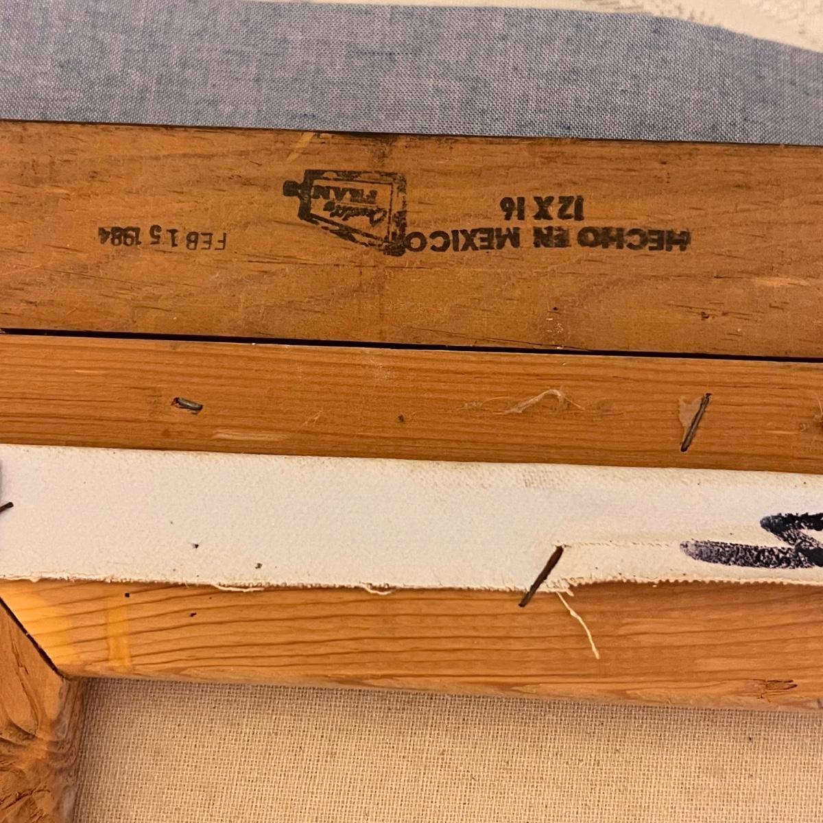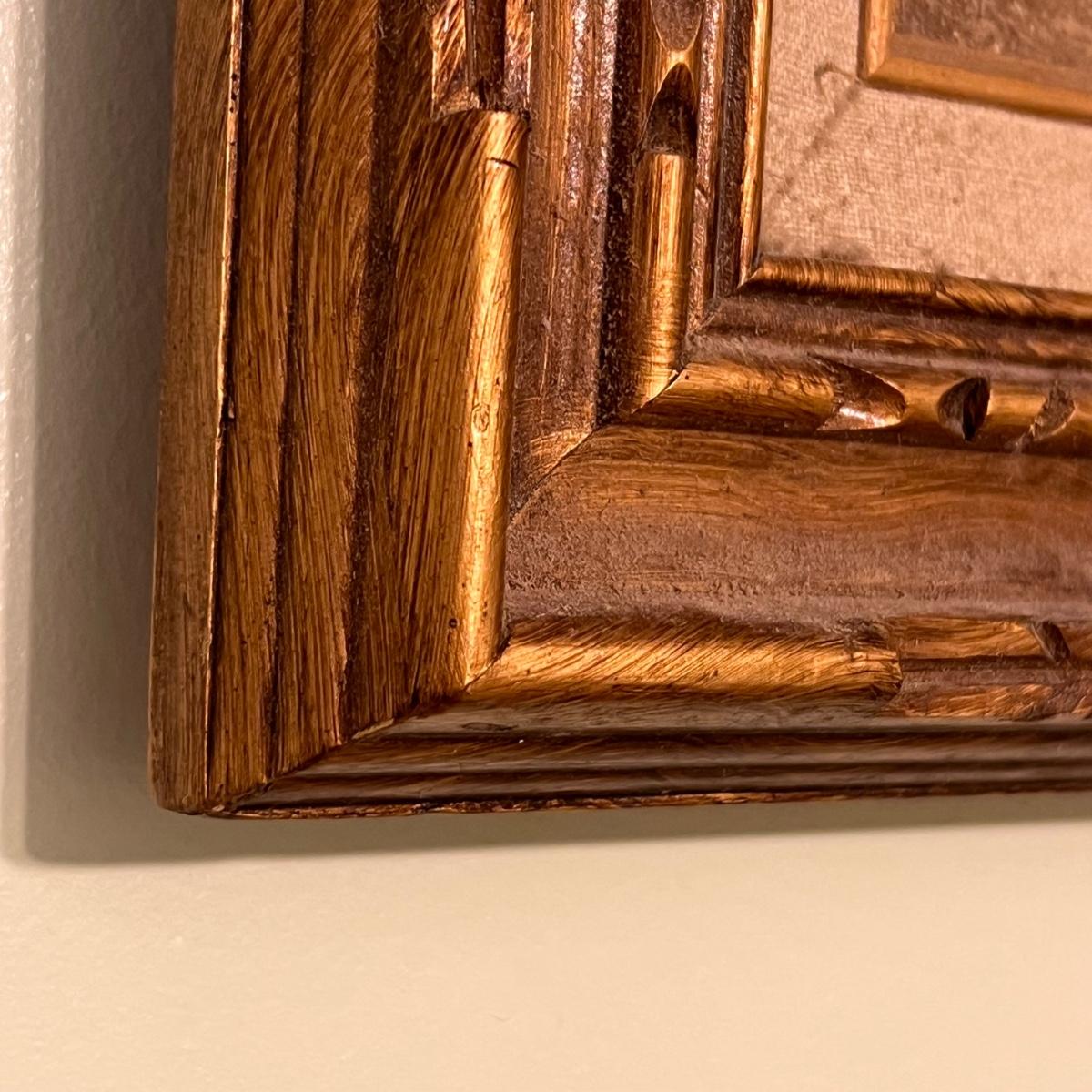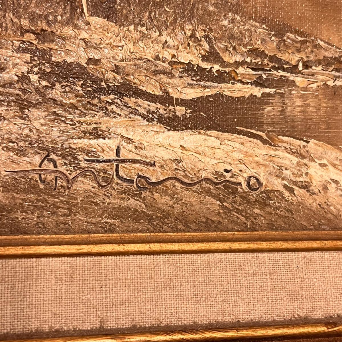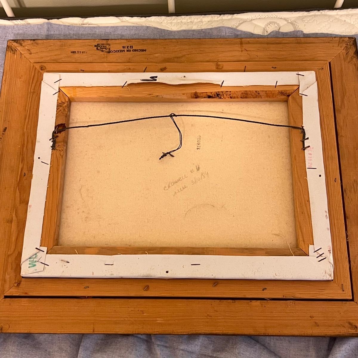 This painting appears to be an original and is signed Antonio which appears to be the artist Antonio Tano. This painting is not under glass and is matted and mounted in a carved wooden frame which complements the art perfectly. Frame measures 21” x 18”H. Note the name on the back of frame is most likely the name of the owner of the art, not the artist.
