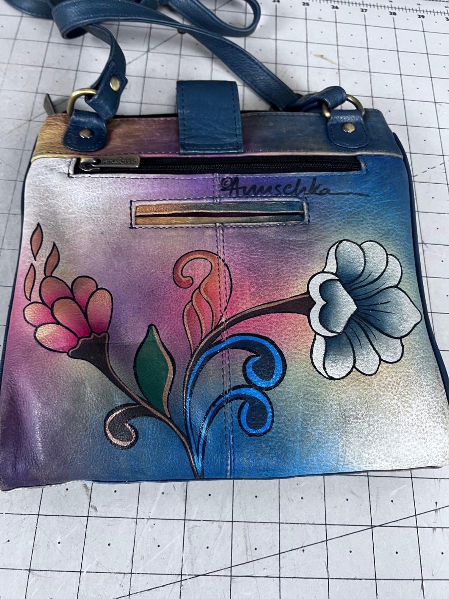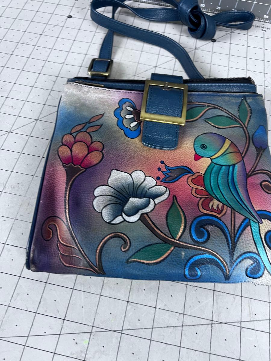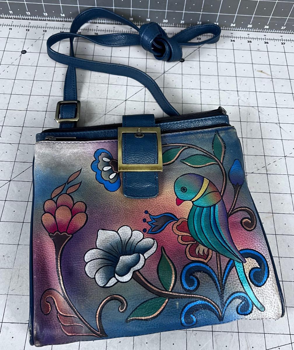Hand painted leather crossbody bag from Anushka..The Portuguese Parrot...Slight use..Approx 9"w x 9.5"h x 2"d...26.5" max. strap drop..Fabric lining..zip and snap closure..three compartments..Interior slip and wallet pockets..Exterior zip and slip pockets..A work of a