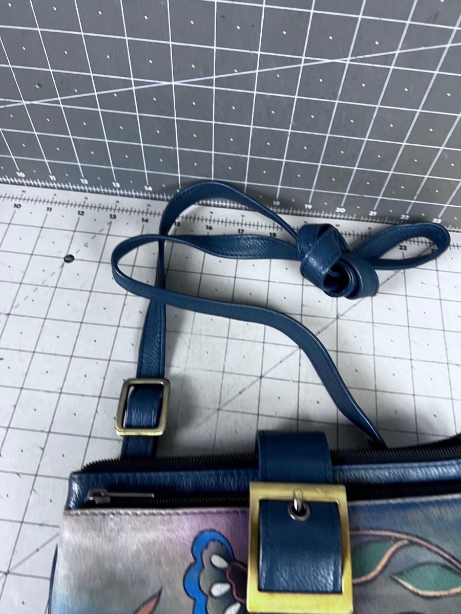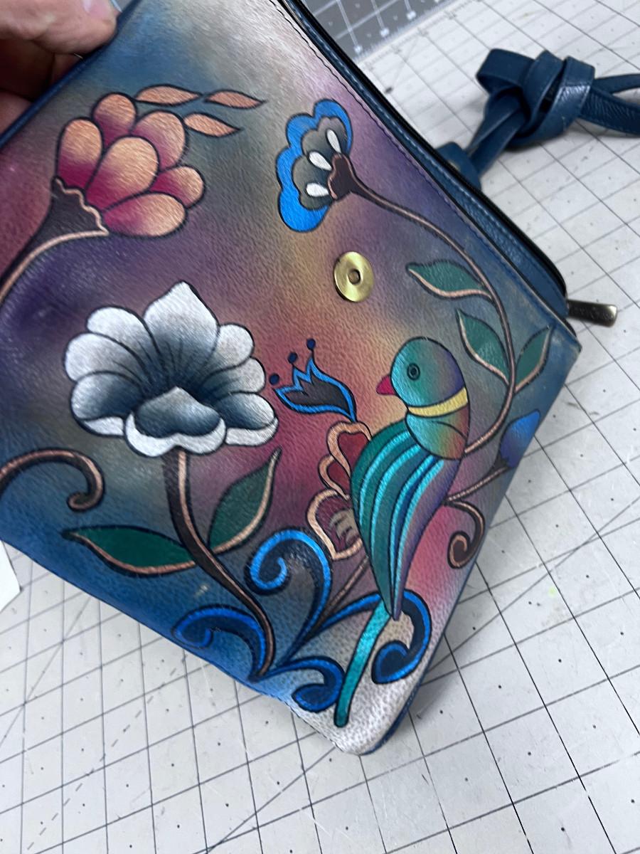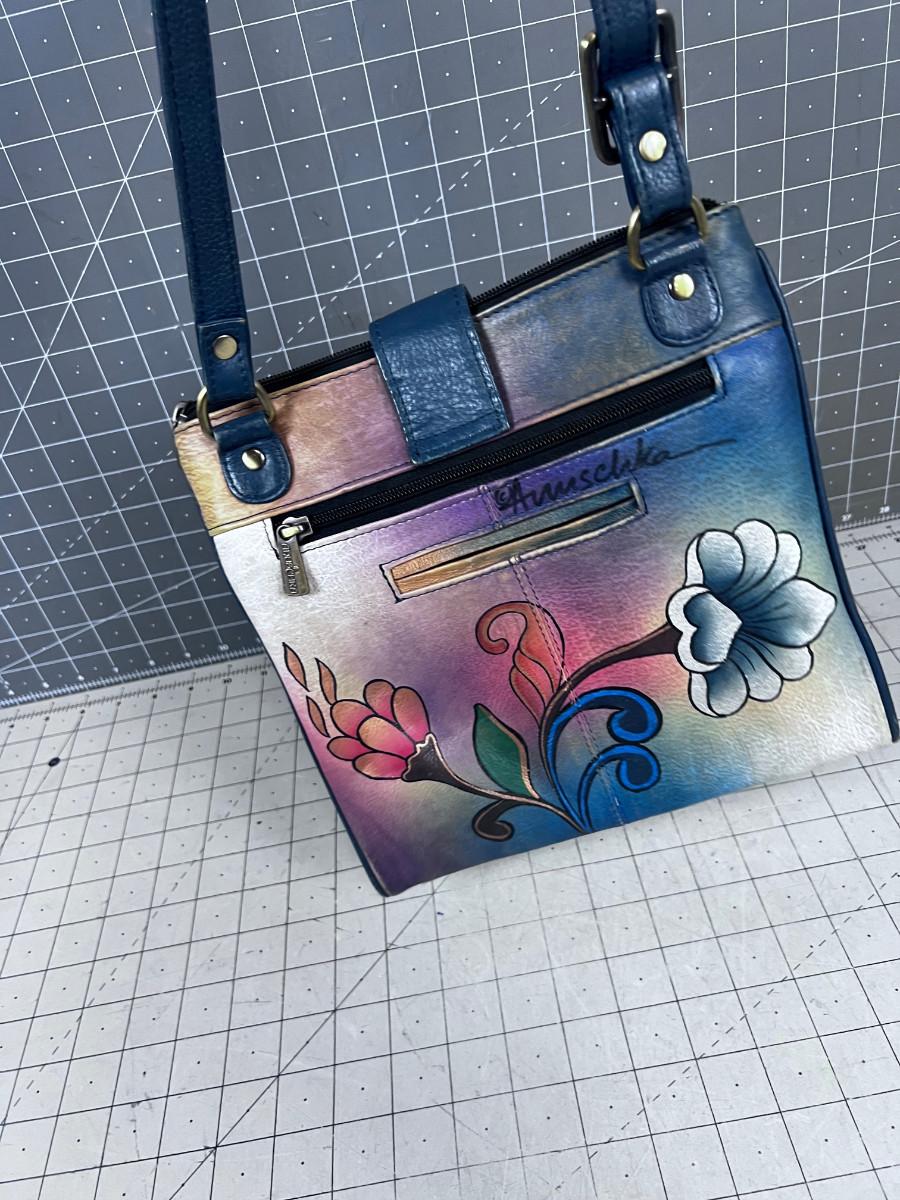 Hand painted leather crossbody bag from Anushka..The Portuguese Parrot...Slight use..Approx 9"w x 9.5"h x 2"d...26.5" max. strap drop..Fabric lining..zip and snap closure..three compartments..Interior slip and wallet pockets..Exterior zip and slip pockets..A work of a