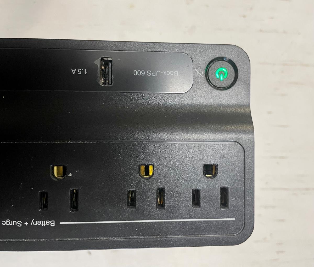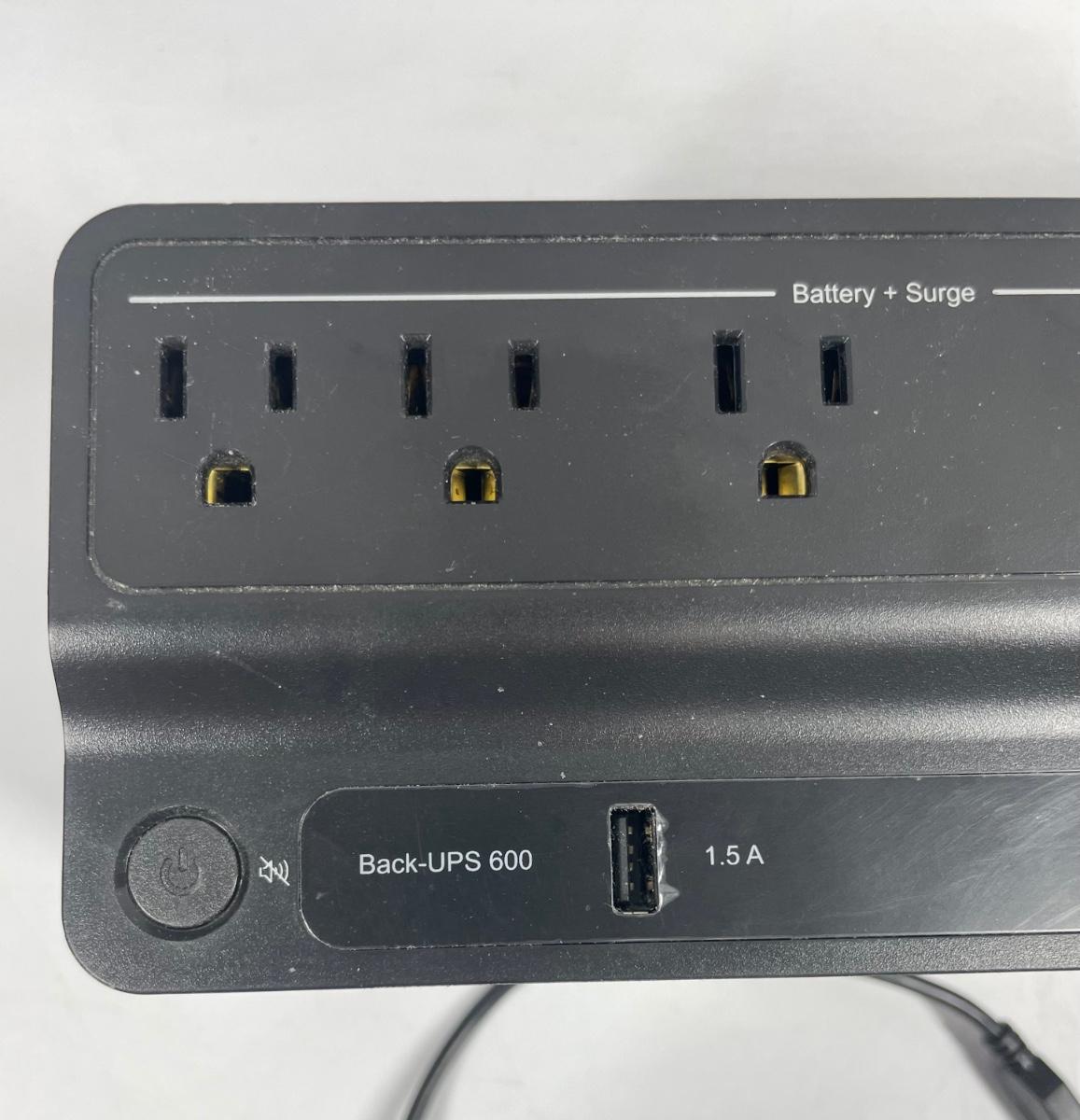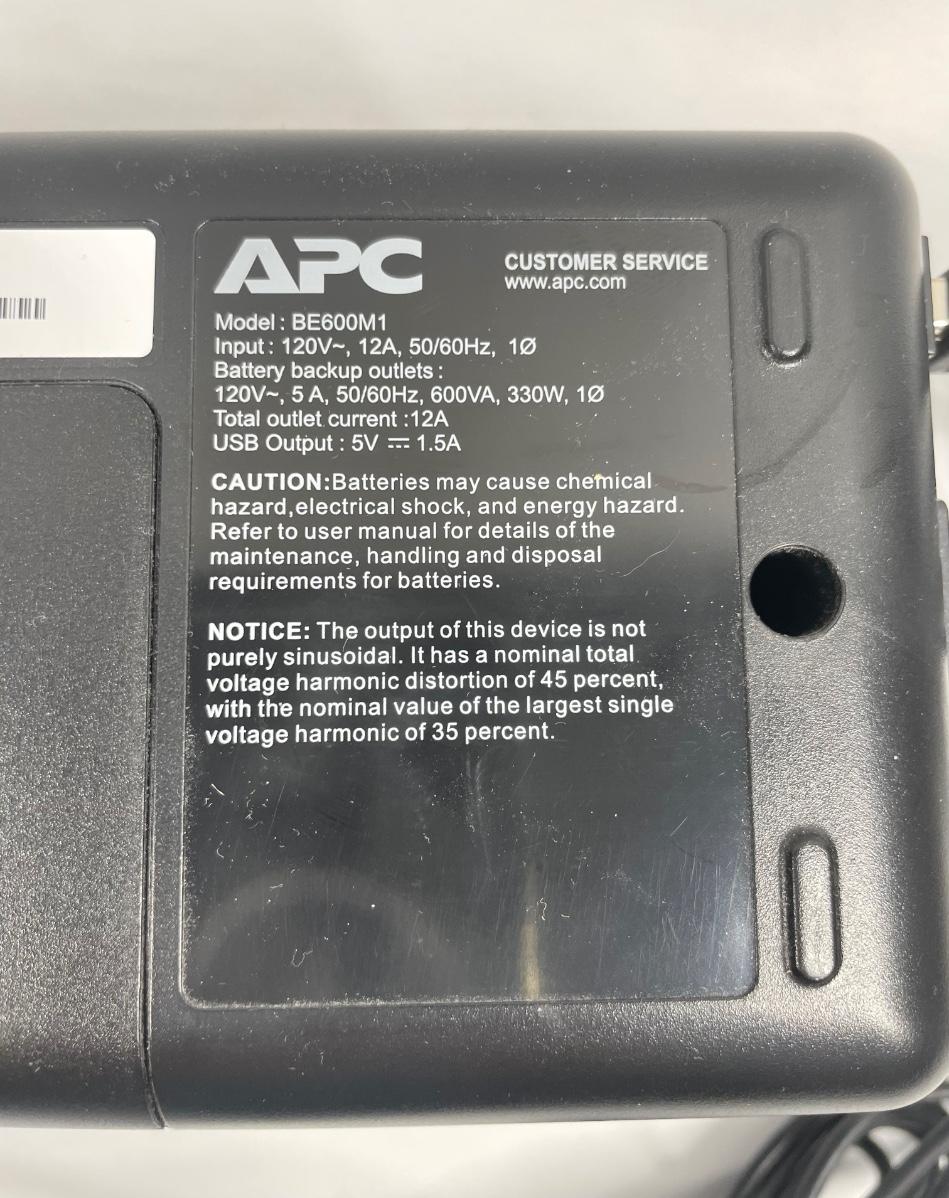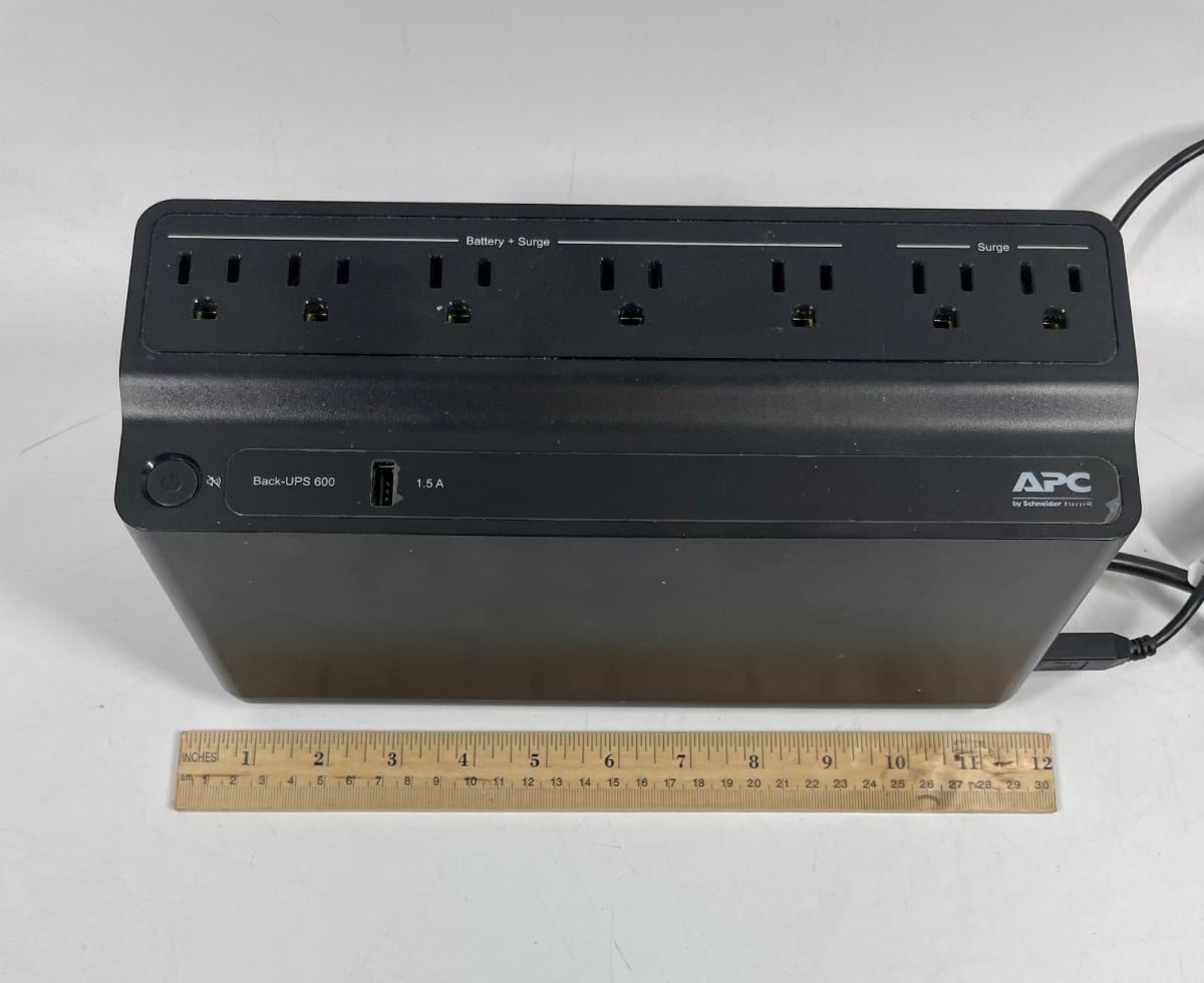 APC Battery Backup Power Supply, model BE600M1. Battery backup outlets for 120V, 5A, 50/60Hz, 600VA, 330W, 1 ohm. USB port output is 1.5A. Tested.