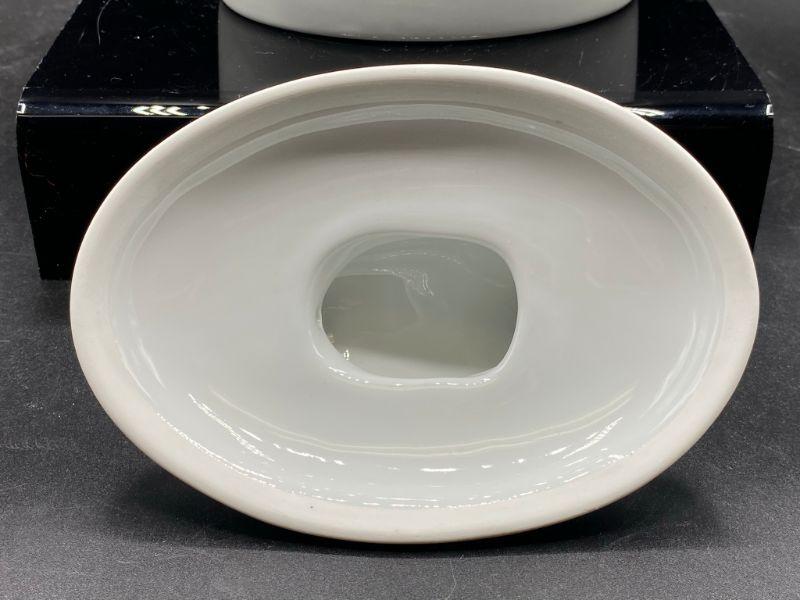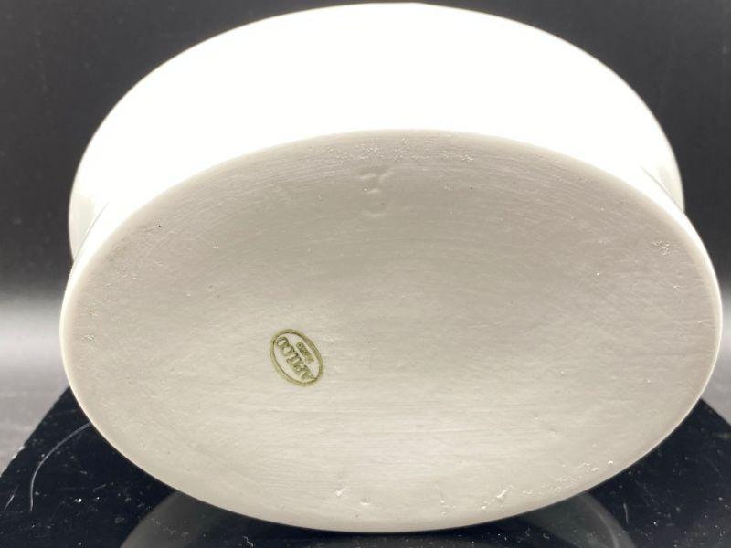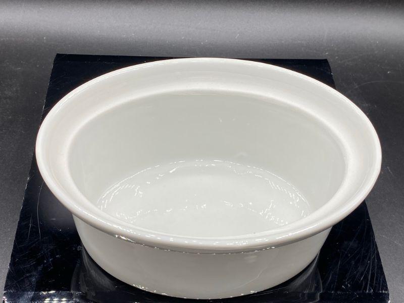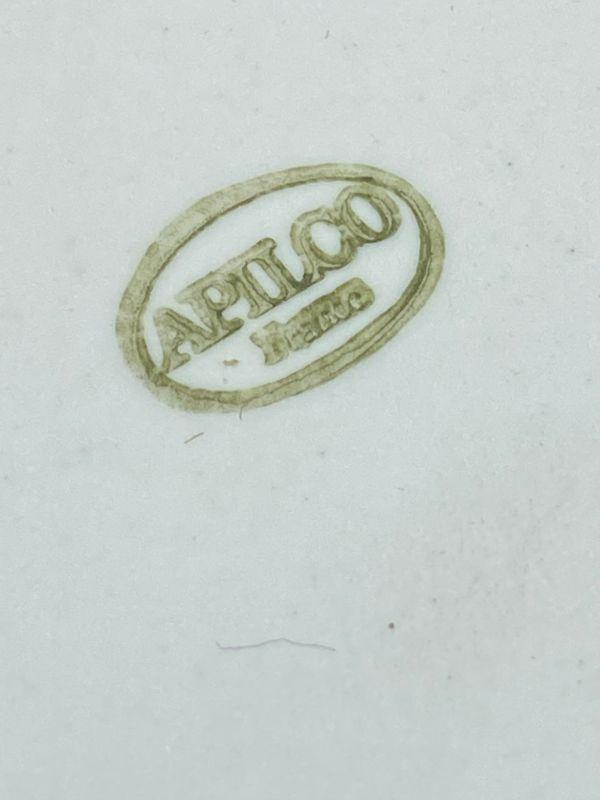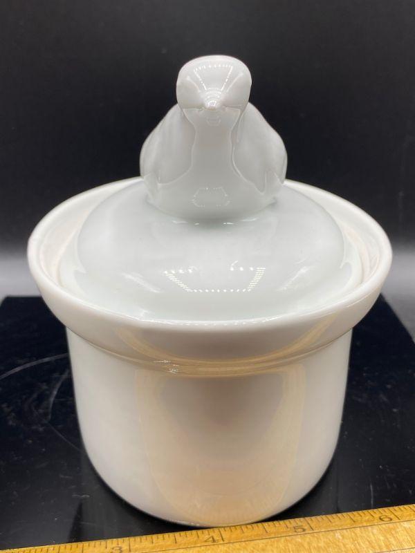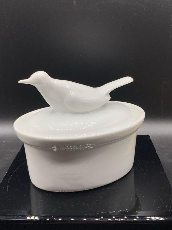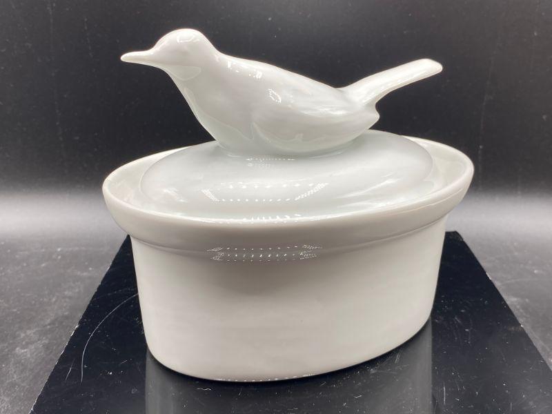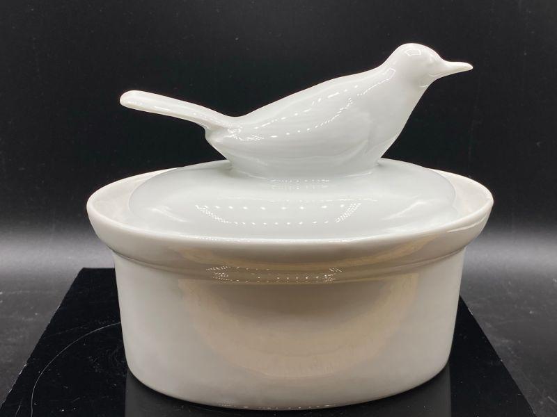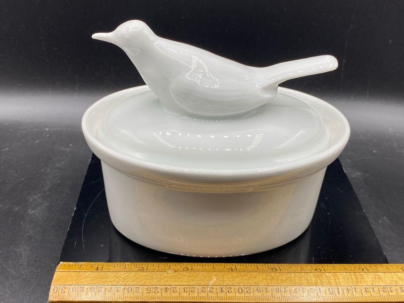 Small lidded casserole from Apilco. Oval shaped. Has a bird sitting on top for a lid handle. Good condition. About 7" across.