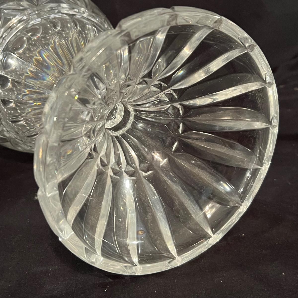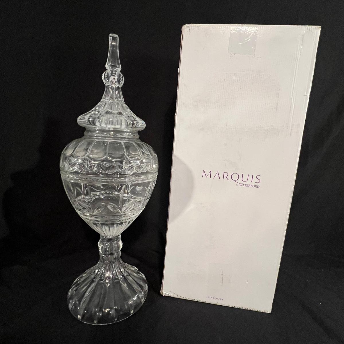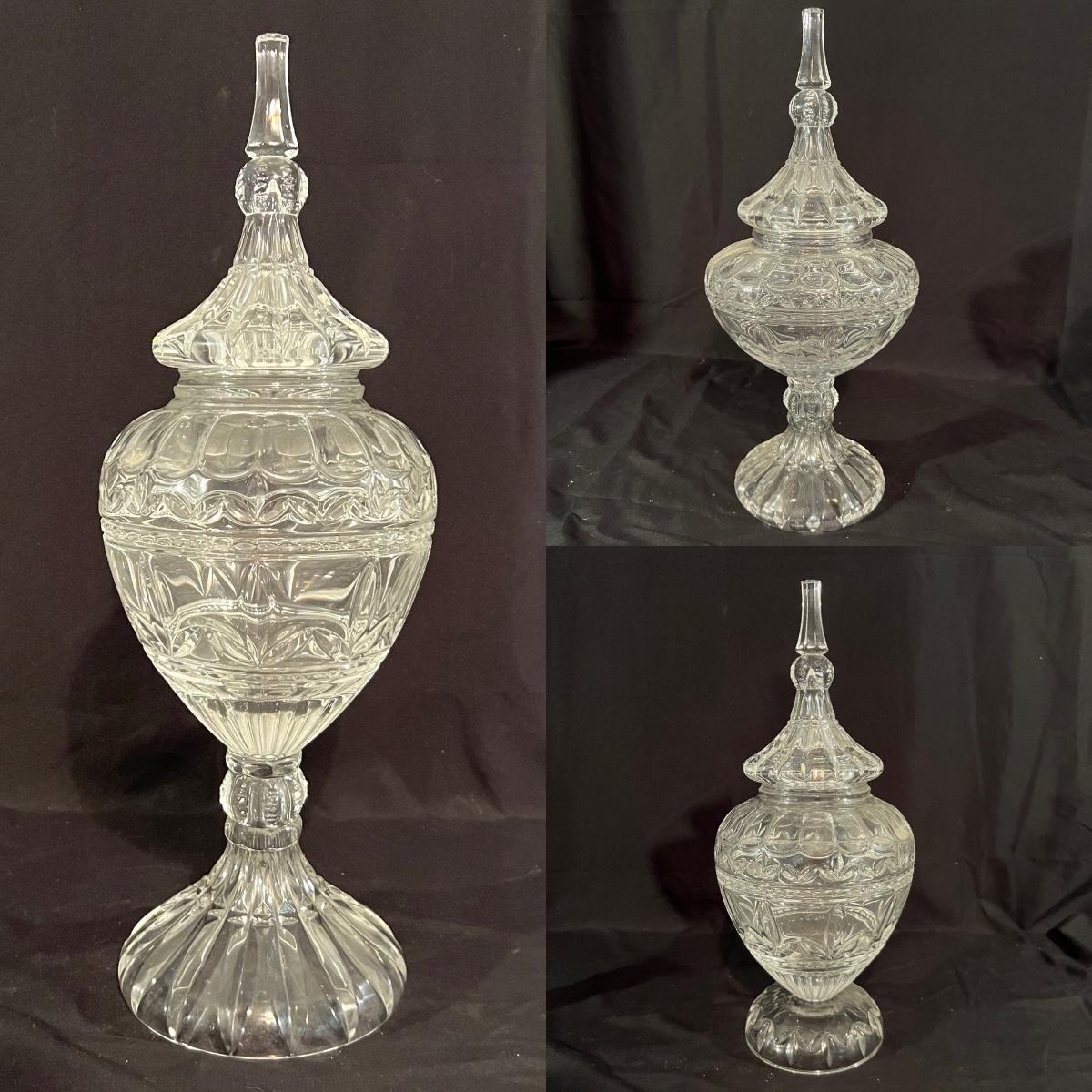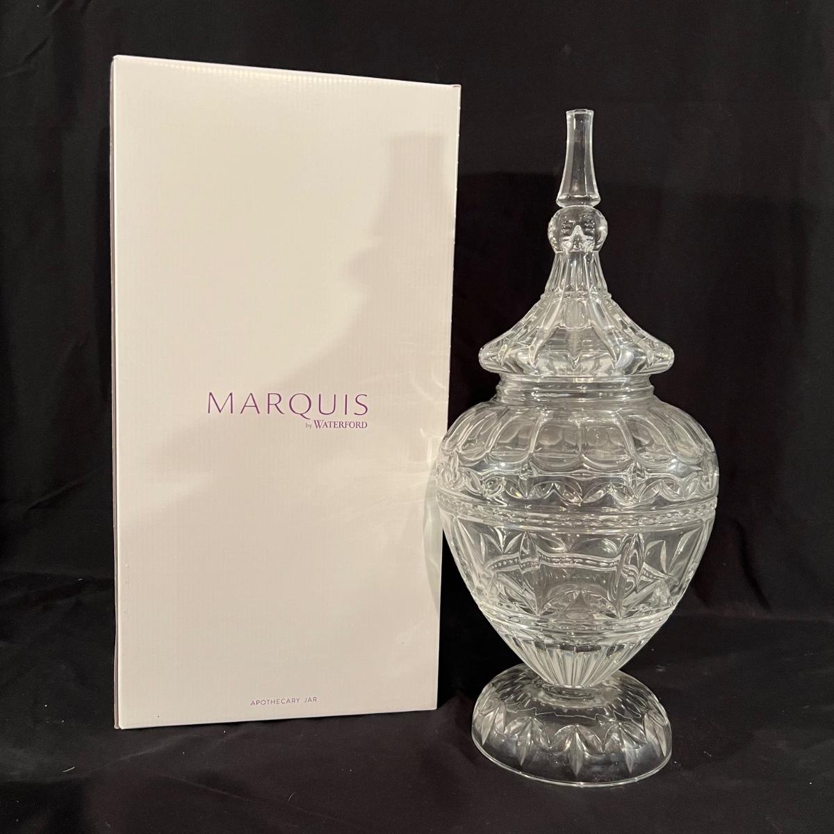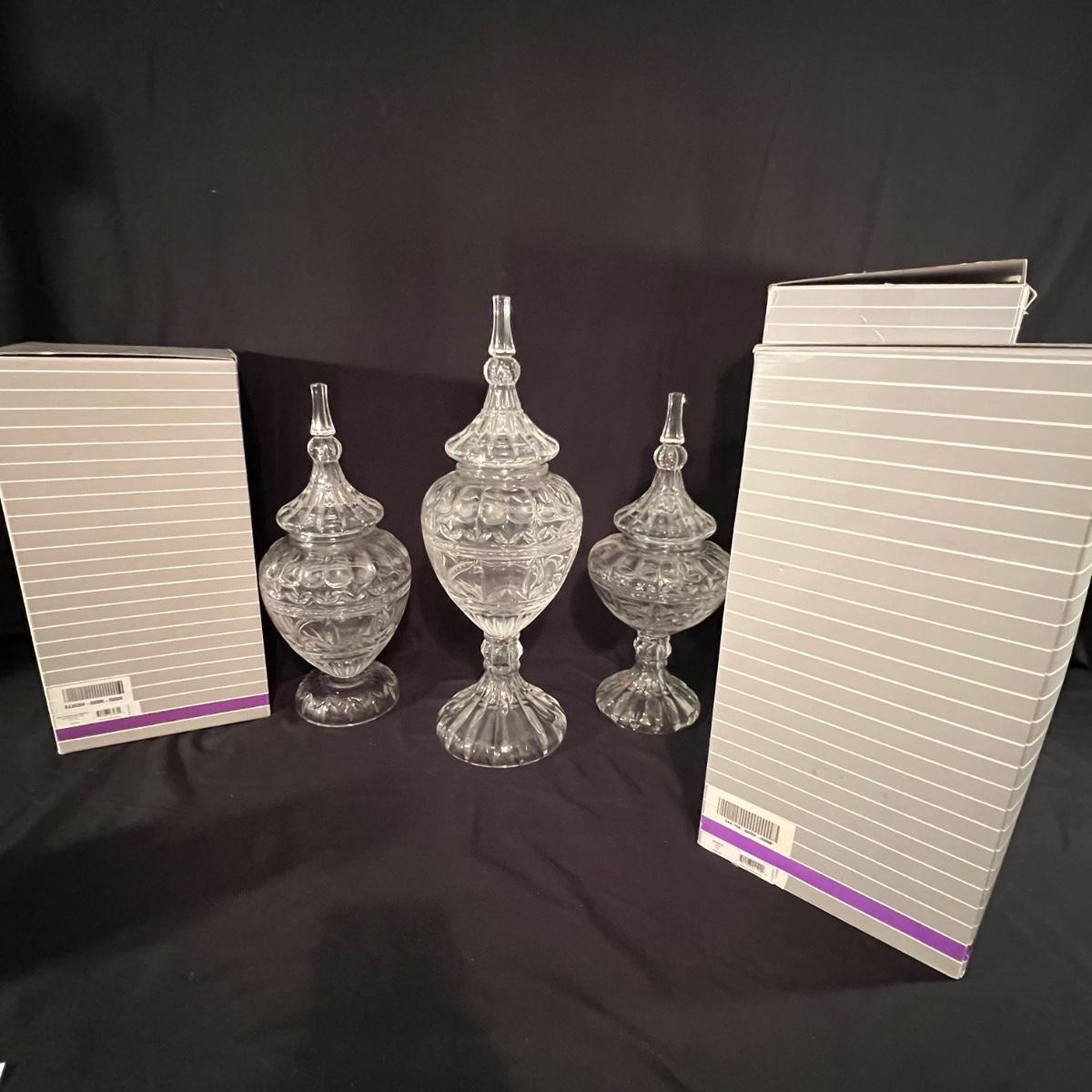Two ginger and one apothecary jars, all Waterford crystal. Tallest jar measures 7”D (base) x 22”H. Boxes are included; it appears these items were out of box and on display.