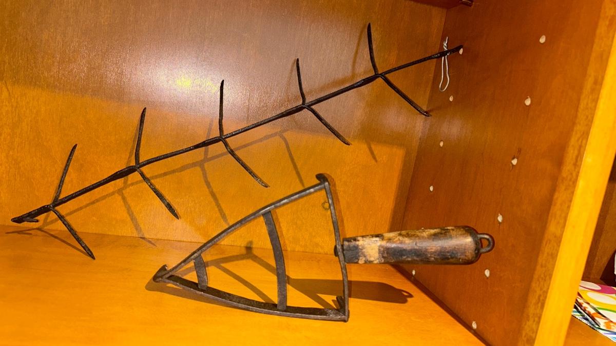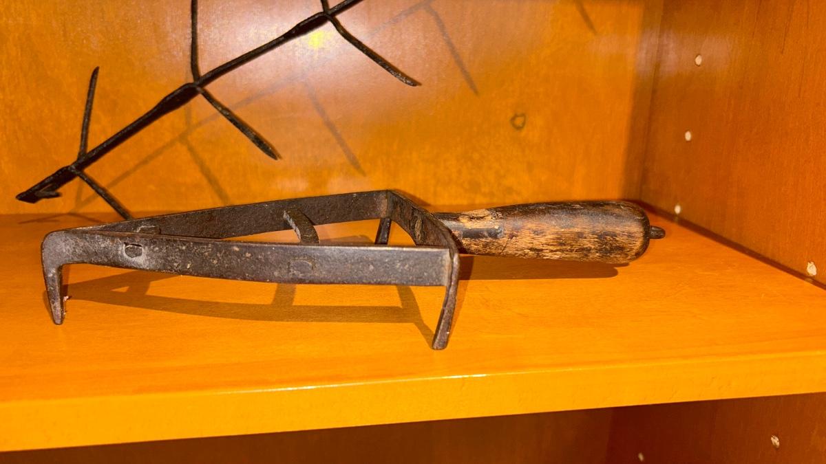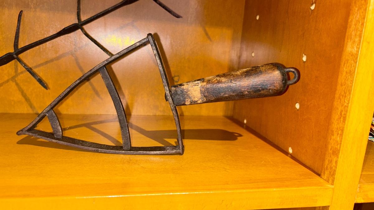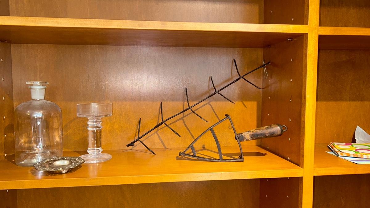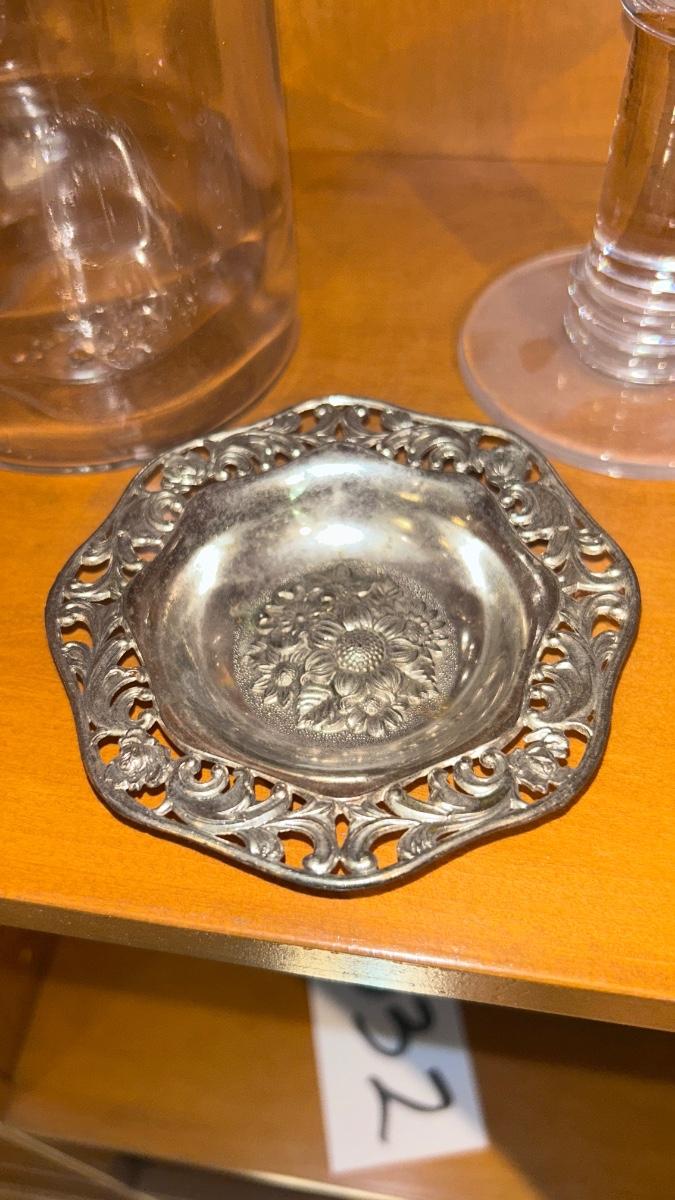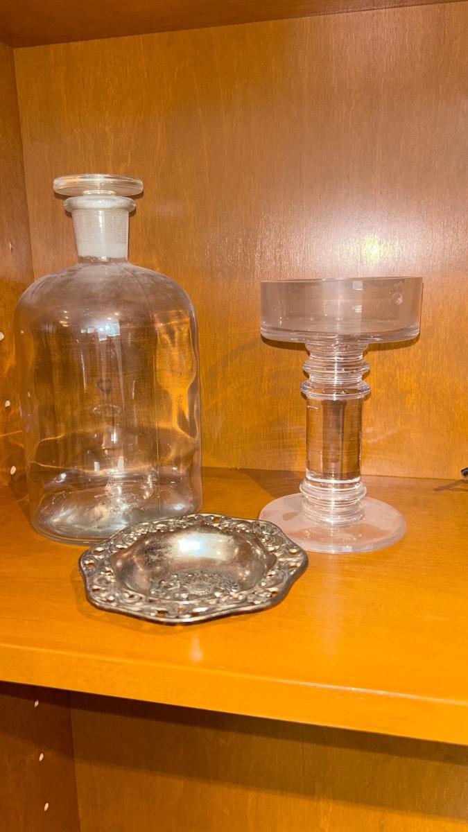 APOTHECARY JAR, CANDLE HOLDER, PEWTER DISH, ANTIQUE IRON STAND AND OTHER IRON DOODAD