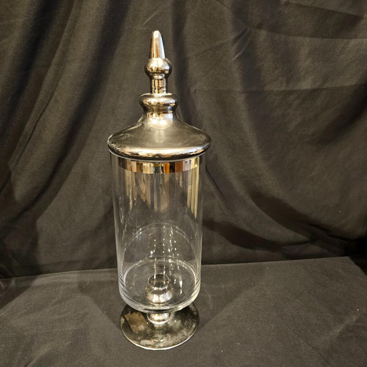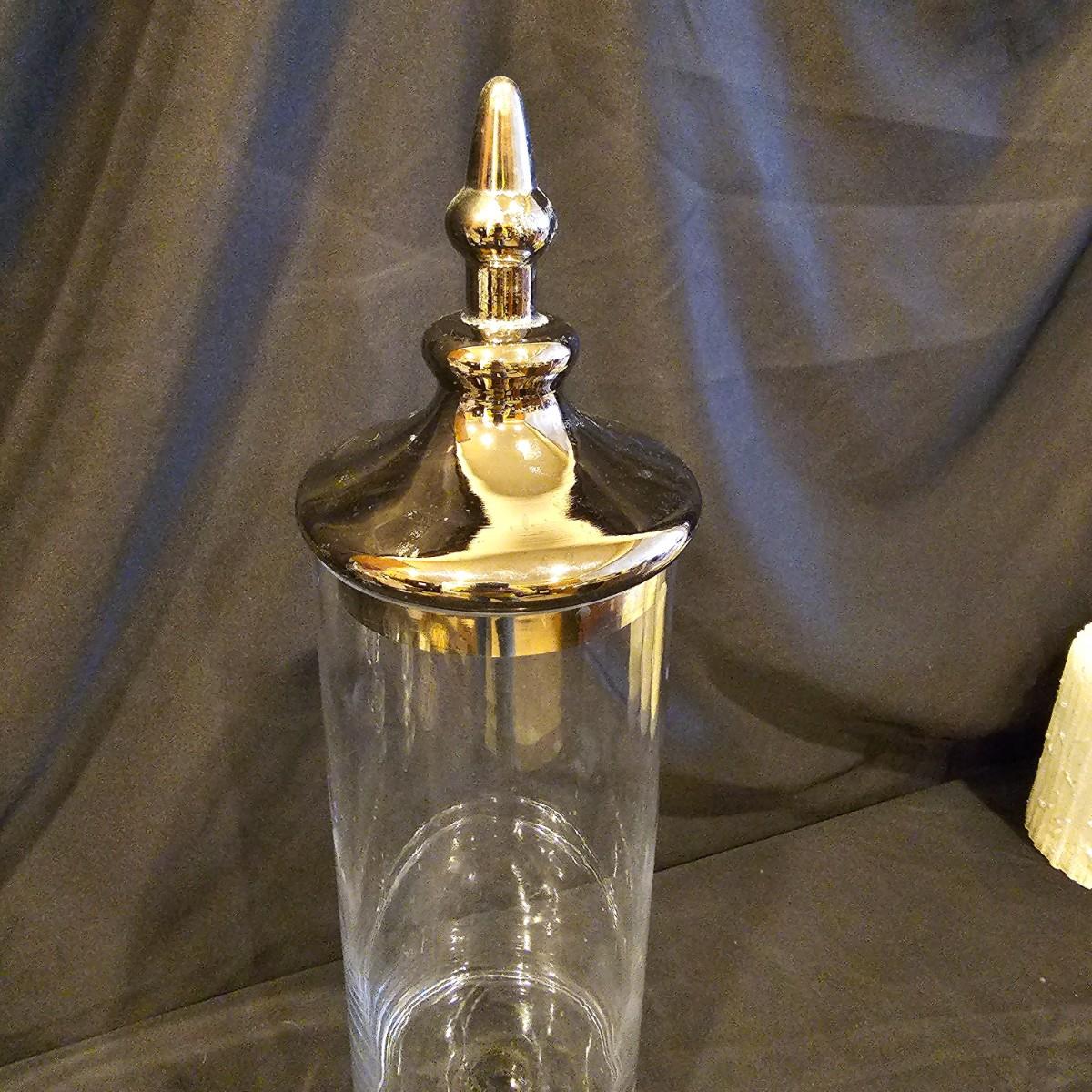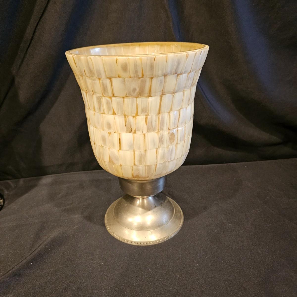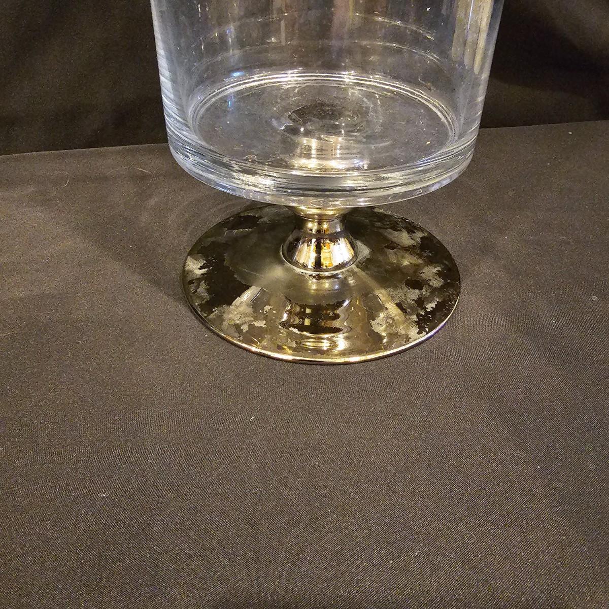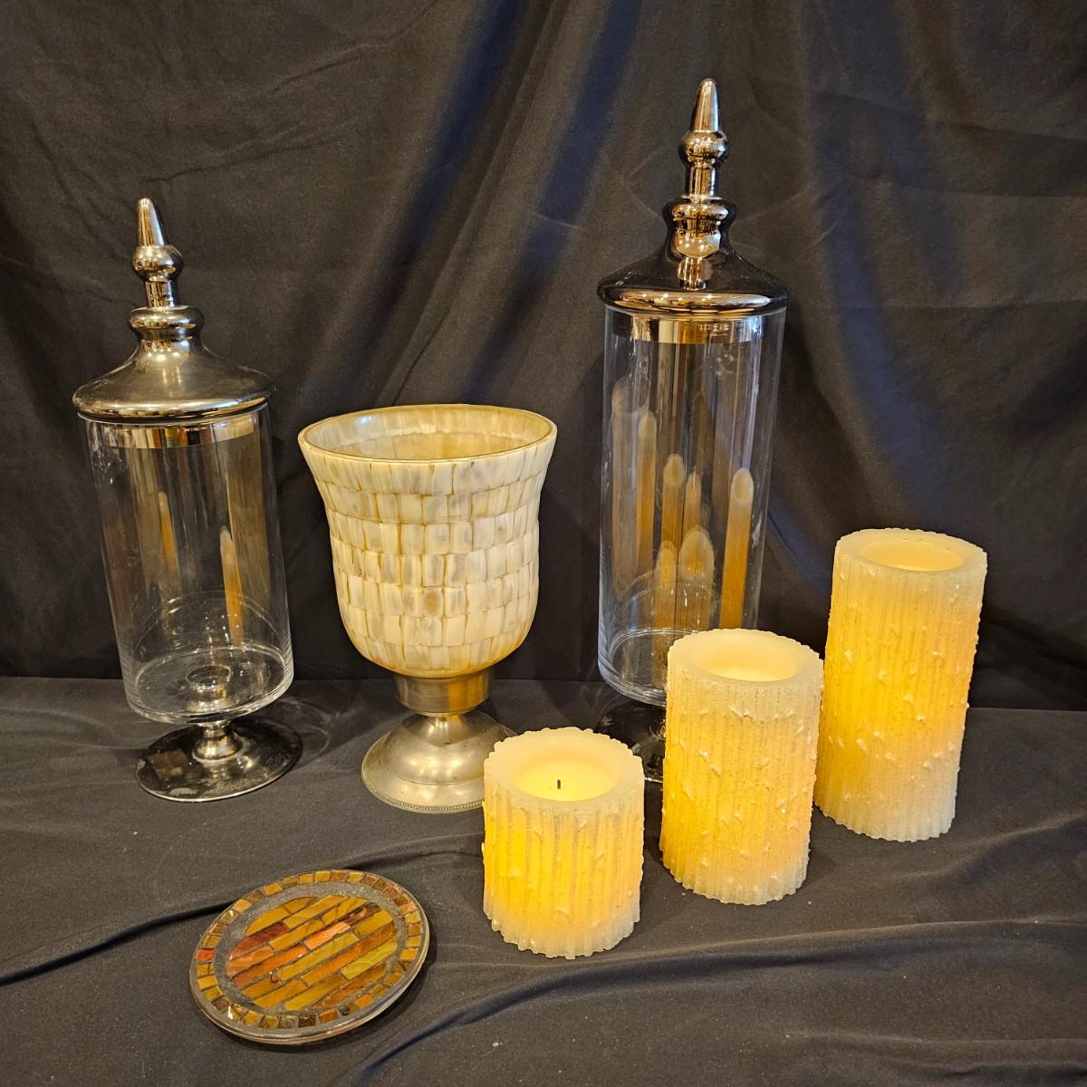 Two tall apothecary jars with lids, three flameless candles, & more. The two jars measure 5.25"D each and are 17"H and 20"H. The candles are all 4"D and 4", 6", and 8"H. Battery operated and all powered on. The off white vase piece has a metal base and some type of shell covering on top. 7.25" x 11"H. The small 5.5" round candle holder is glass with a mosaic inlay top. See photos for details. Shipping available. Shipping can be costly. We suggest contacting our preferred local shipping provider, Postage Express, with dimensions and getting an estimate before bidding: (828) 670-5501 or postageexpress@yahoo.com.