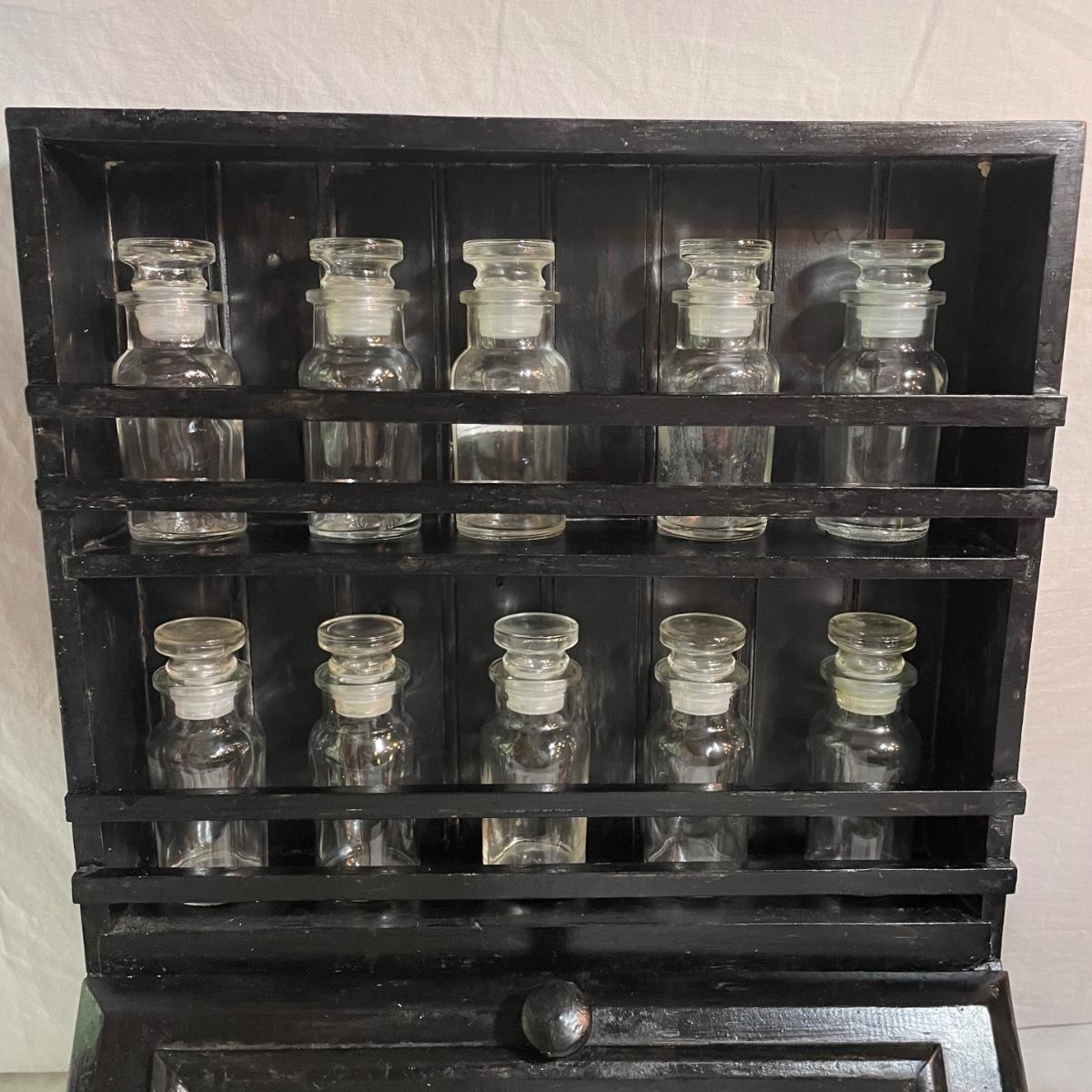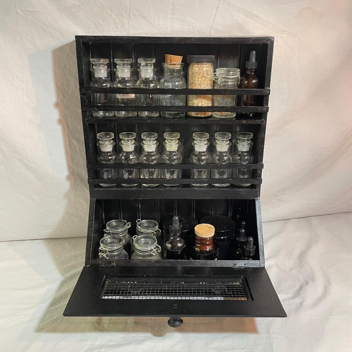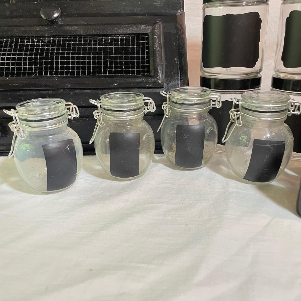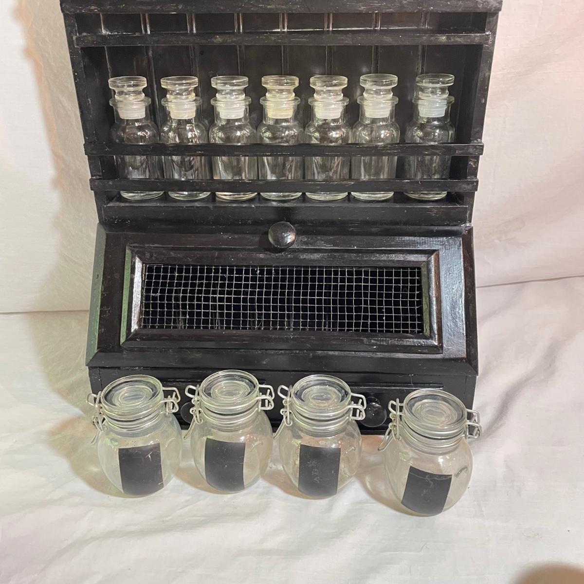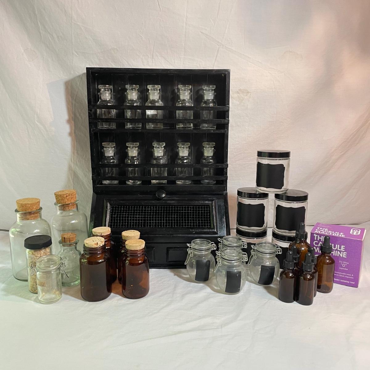 Lot features a black painted wood rack with two shelves, a small cabinet and faux drawers. Rack appears to hold between 12-14 standard size spice jars. Lot also features over 25 various-sized glass bottles and six glass dropper bottles. Some have hinged lids, others cork stoppers. Also included are nine jars with chalkboard paint labels and “The Capsule Machine”. Black rack measures 13” x 6” x 18”H. The largest jar with a cork lid is 6”H without the cork. Some jars still have labels taped on. See images. Local pick up only.