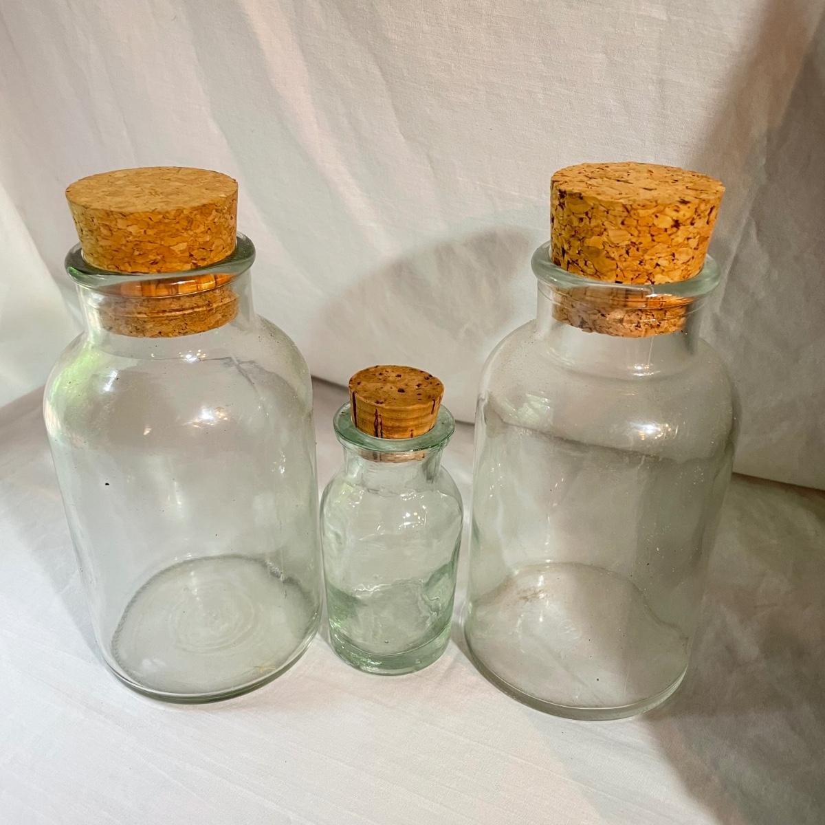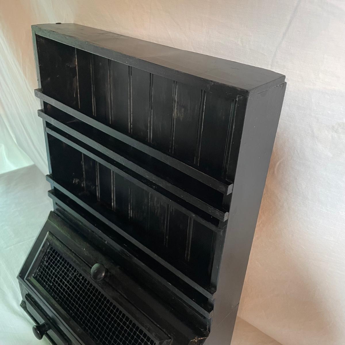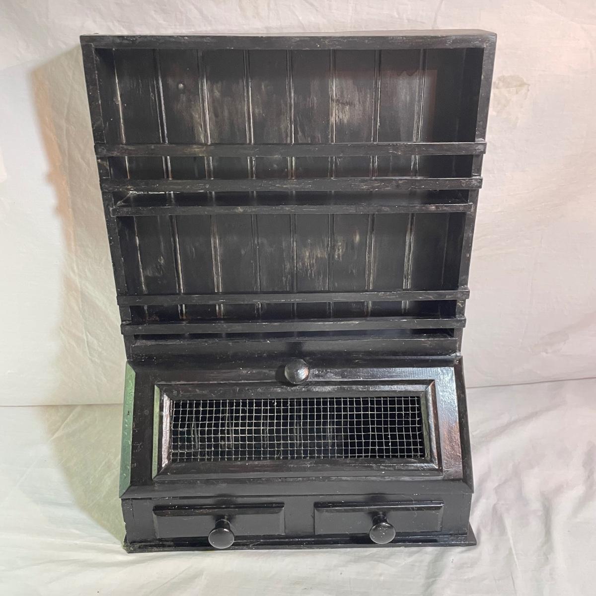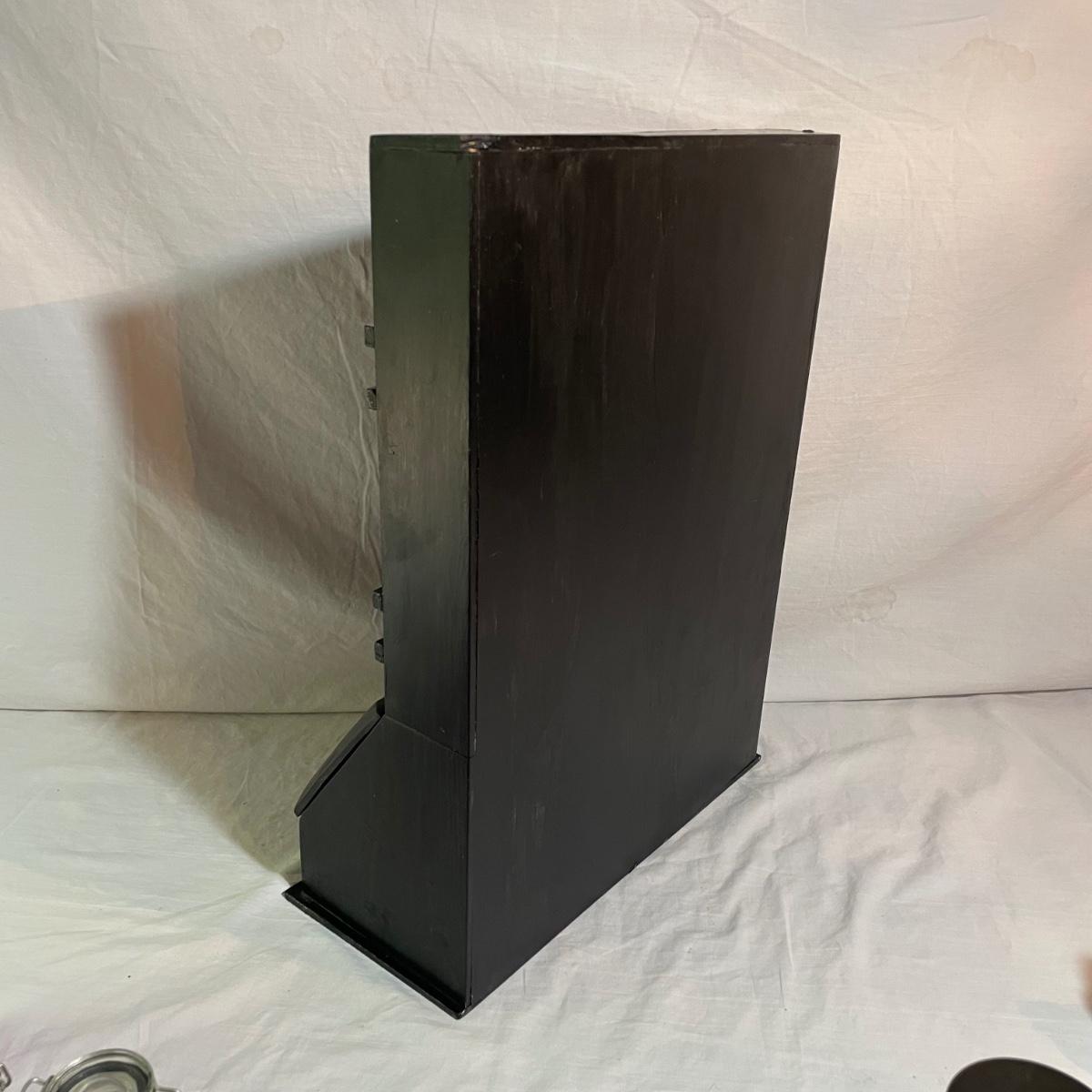 Lot features a black painted wood rack with two shelves, a small cabinet and faux drawers. Rack appears to hold between 12-14 standard size spice jars. Lot also features over 25 various-sized glass bottles and six glass dropper bottles. Some have hinged lids, others cork stoppers. Also included are nine jars with chalkboard paint labels and “The Capsule Machine”. Black rack measures 13” x 6” x 18”H. The largest jar with a cork lid is 6”H without the cork. Some jars still have labels taped on. See images. Local pick up only.