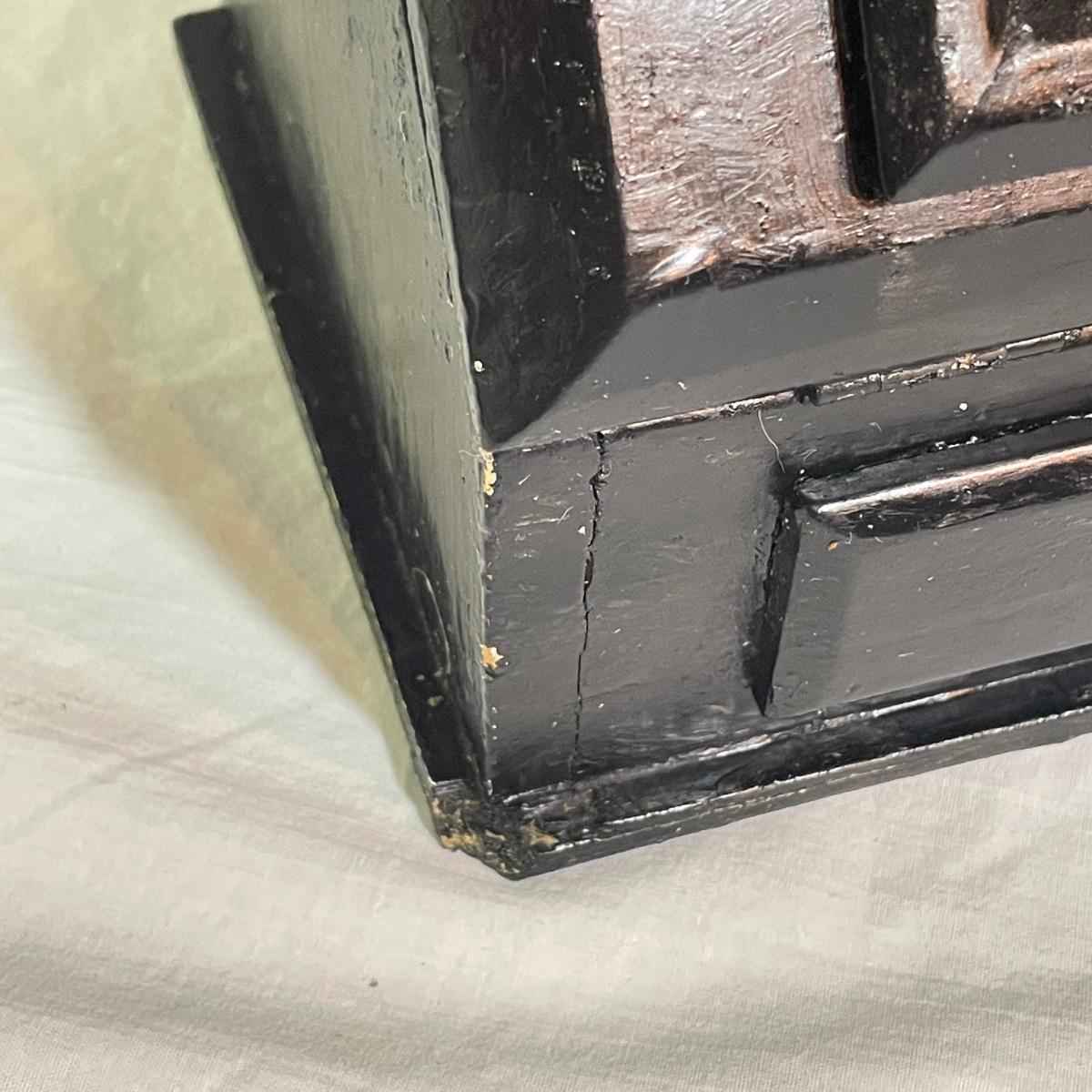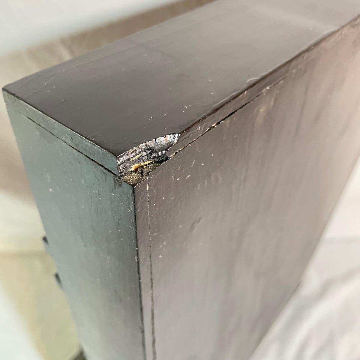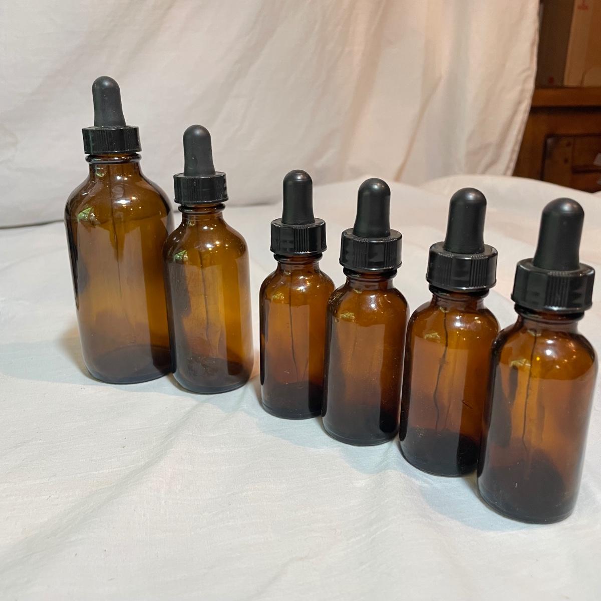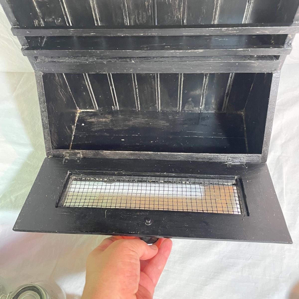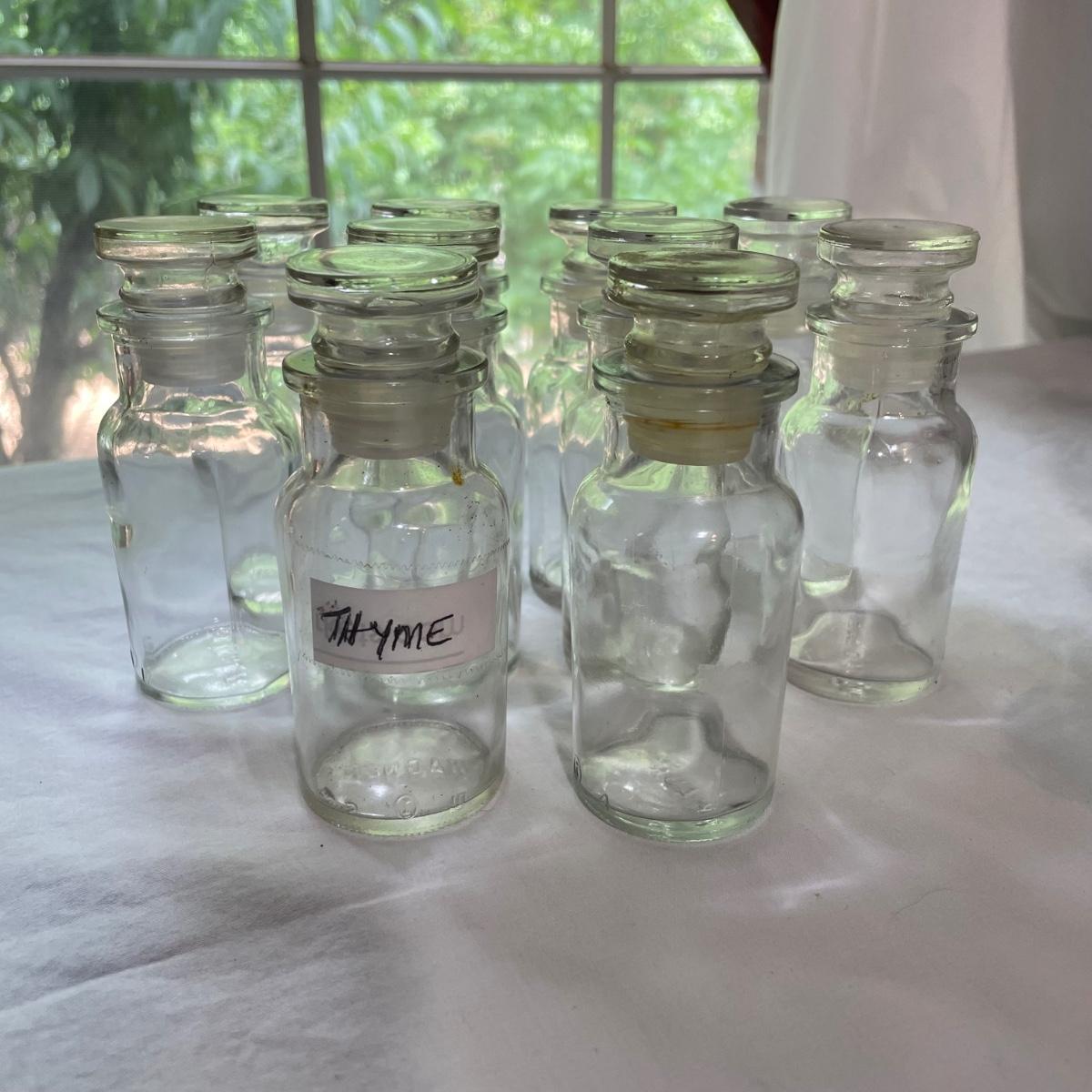 Lot features a black painted wood rack with two shelves, a small cabinet and faux drawers. Rack appears to hold between 12-14 standard size spice jars. Lot also features over 25 various-sized glass bottles and six glass dropper bottles. Some have hinged lids, others cork stoppers. Also included are nine jars with chalkboard paint labels and “The Capsule Machine”. Black rack measures 13” x 6” x 18”H. The largest jar with a cork lid is 6”H without the cork. Some jars still have labels taped on. See images. Local pick up only.