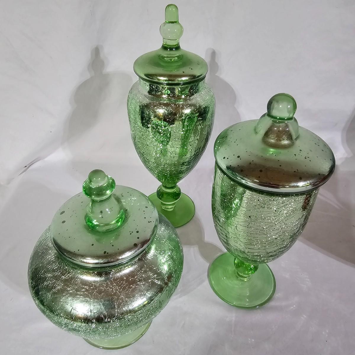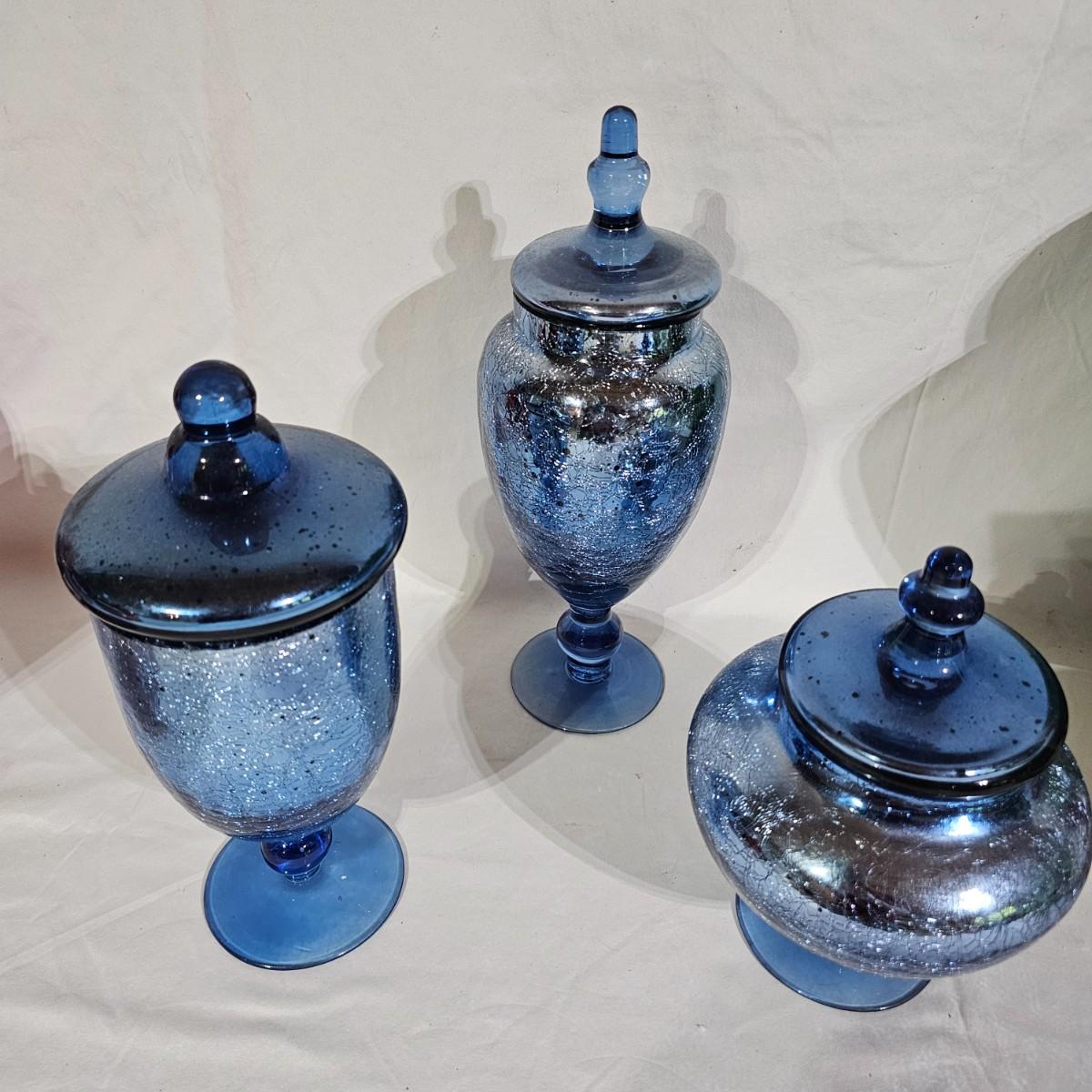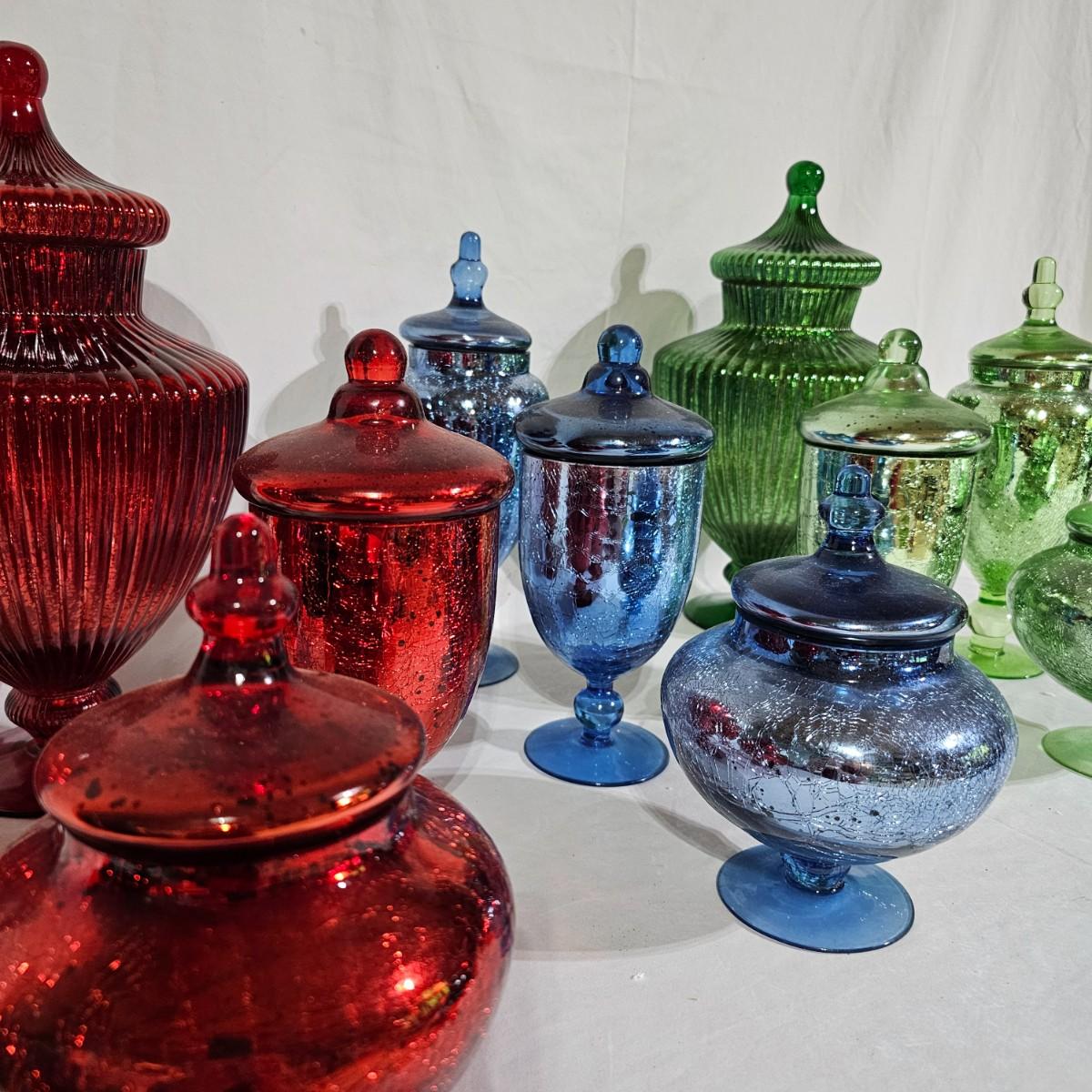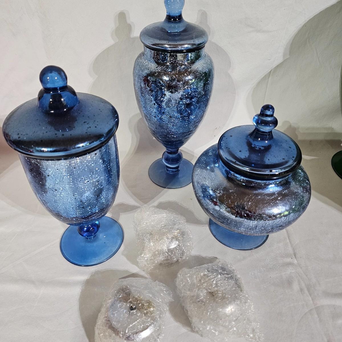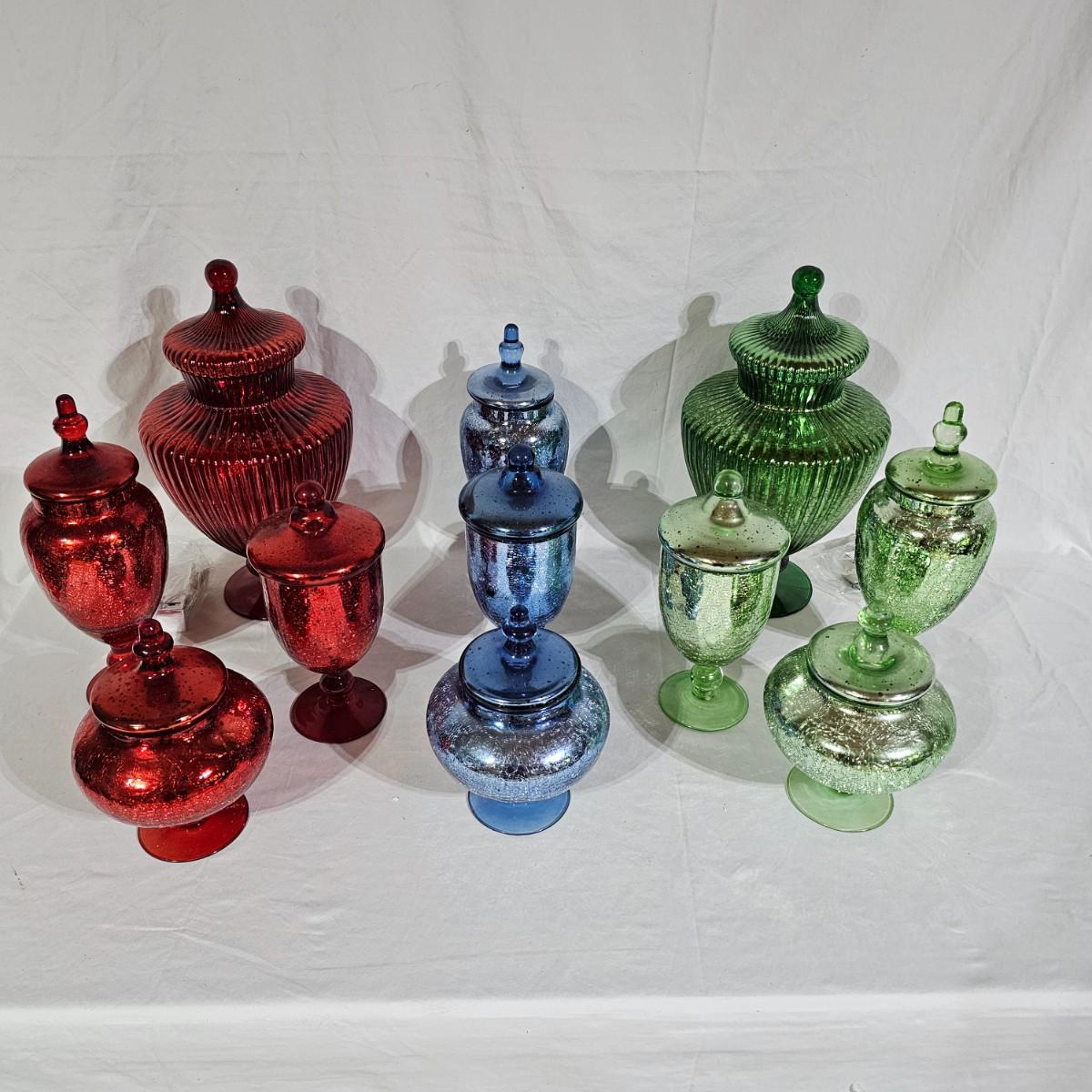 Three sets of three and two larger apothecary style jars with lids, all glass. Each piece has its own battery operated light source for inside, not tested. Most run on AA, AAA or C size batteries. Large jars measure 8"D x 14.5"H. Sets are 4.5"D x 11.5"H, 4.25"D x 10"H and 6"D x 8"H. All with lids. See photos for details. Shipping available.