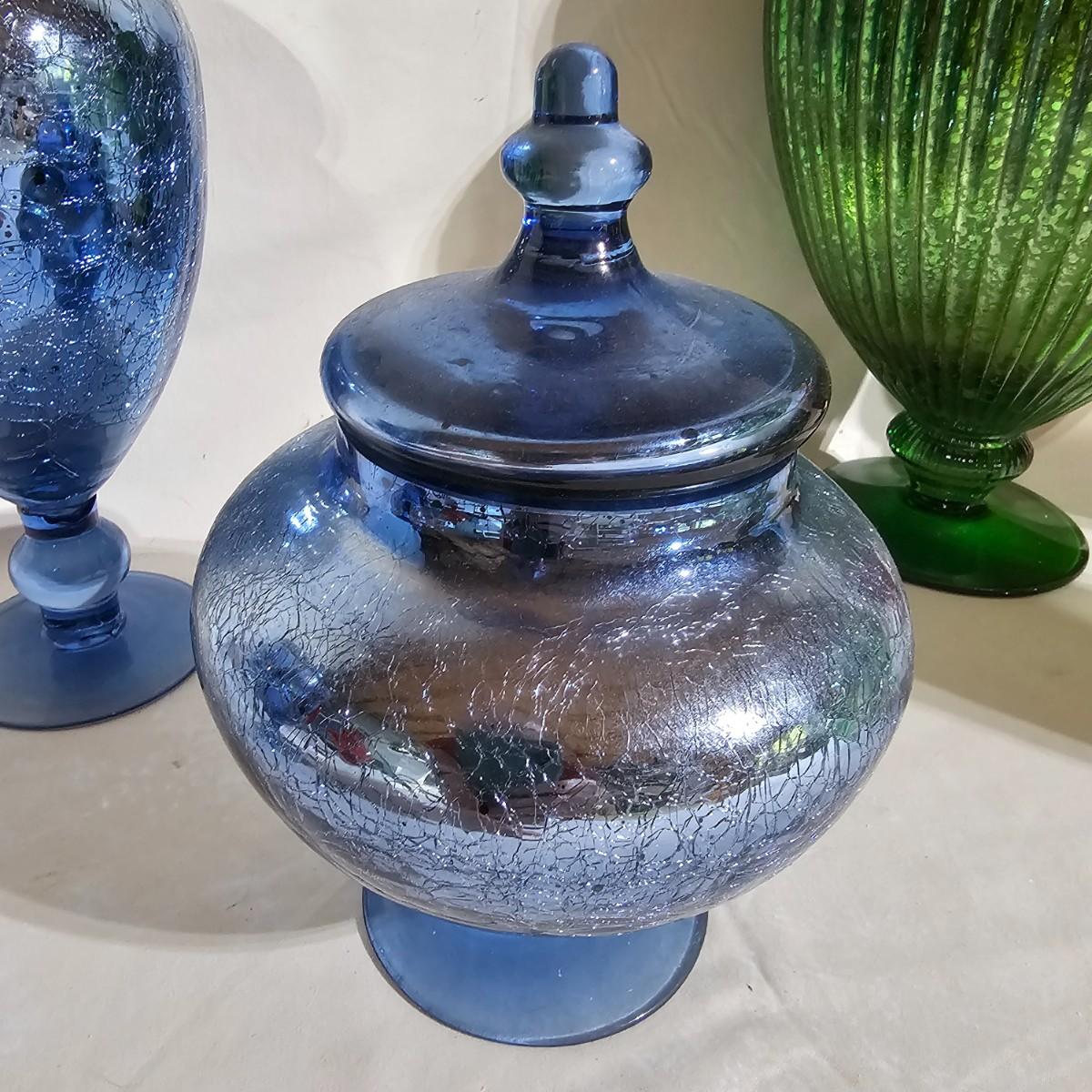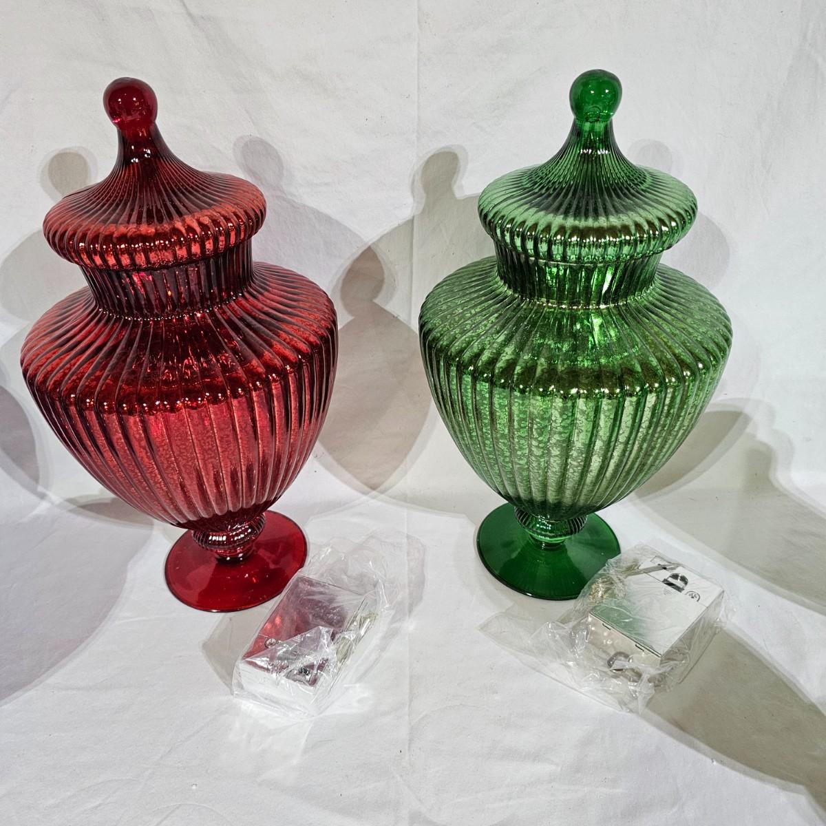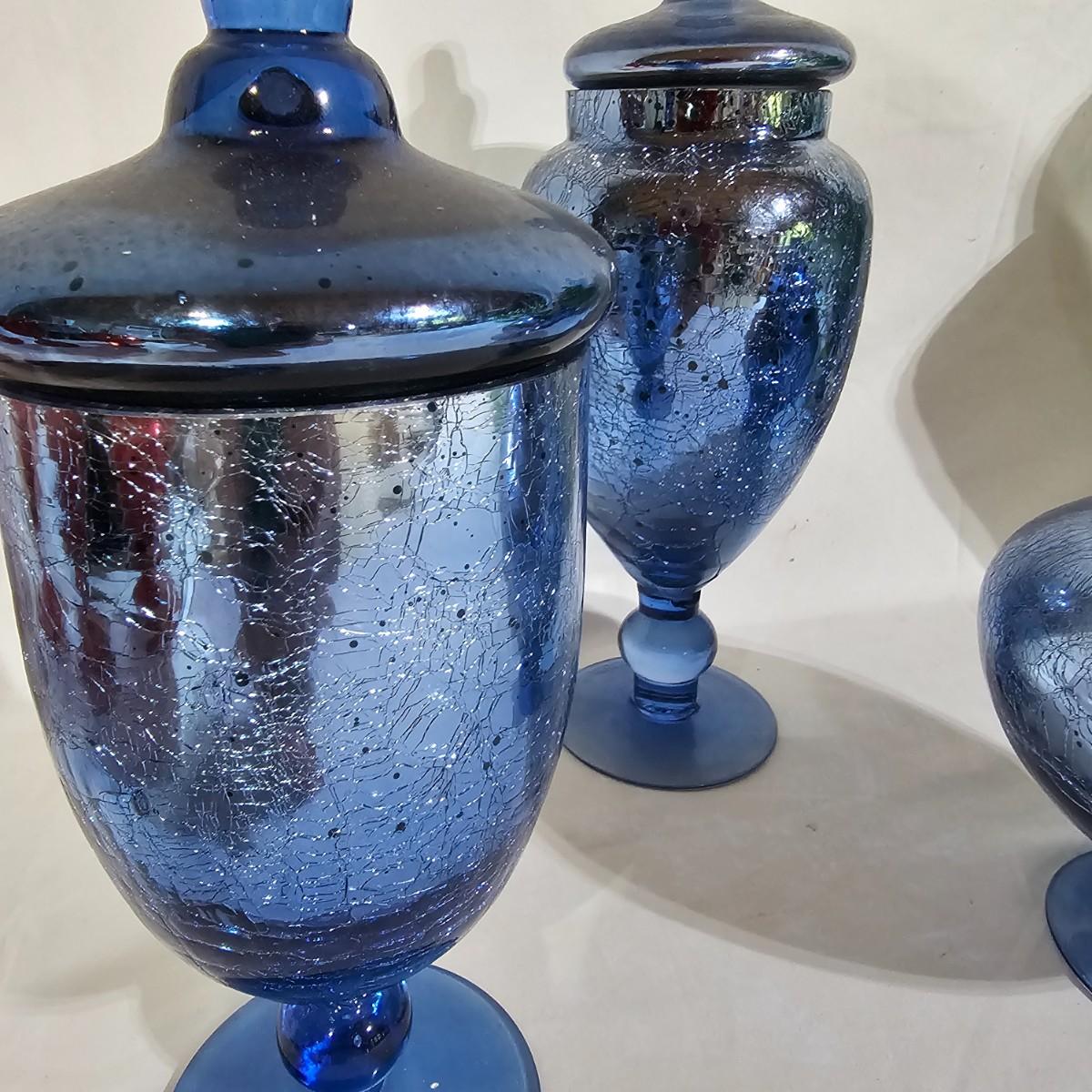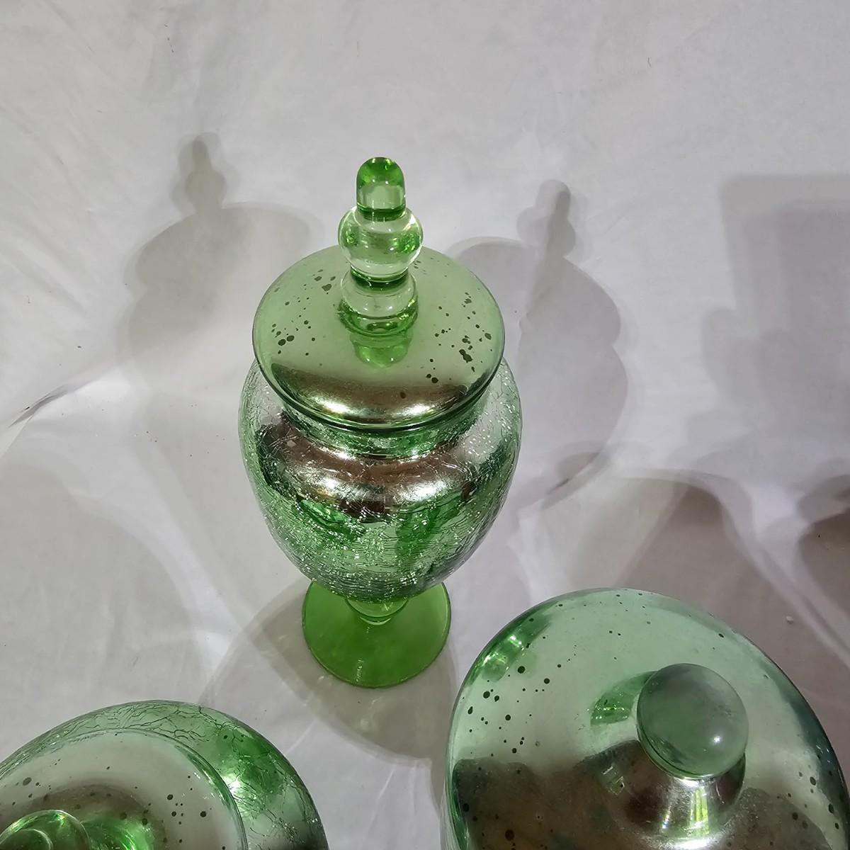 Three sets of three and two larger apothecary style jars with lids, all glass. Each piece has its own battery operated light source for inside, not tested. Most run on AA, AAA or C size batteries. Large jars measure 8"D x 14.5"H. Sets are 4.5"D x 11.5"H, 4.25"D x 10"H and 6"D x 8"H. All with lids. See photos for details. Shipping available.
