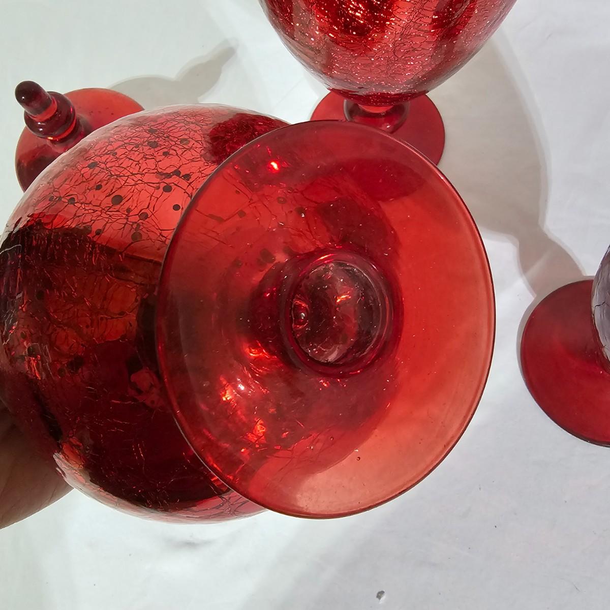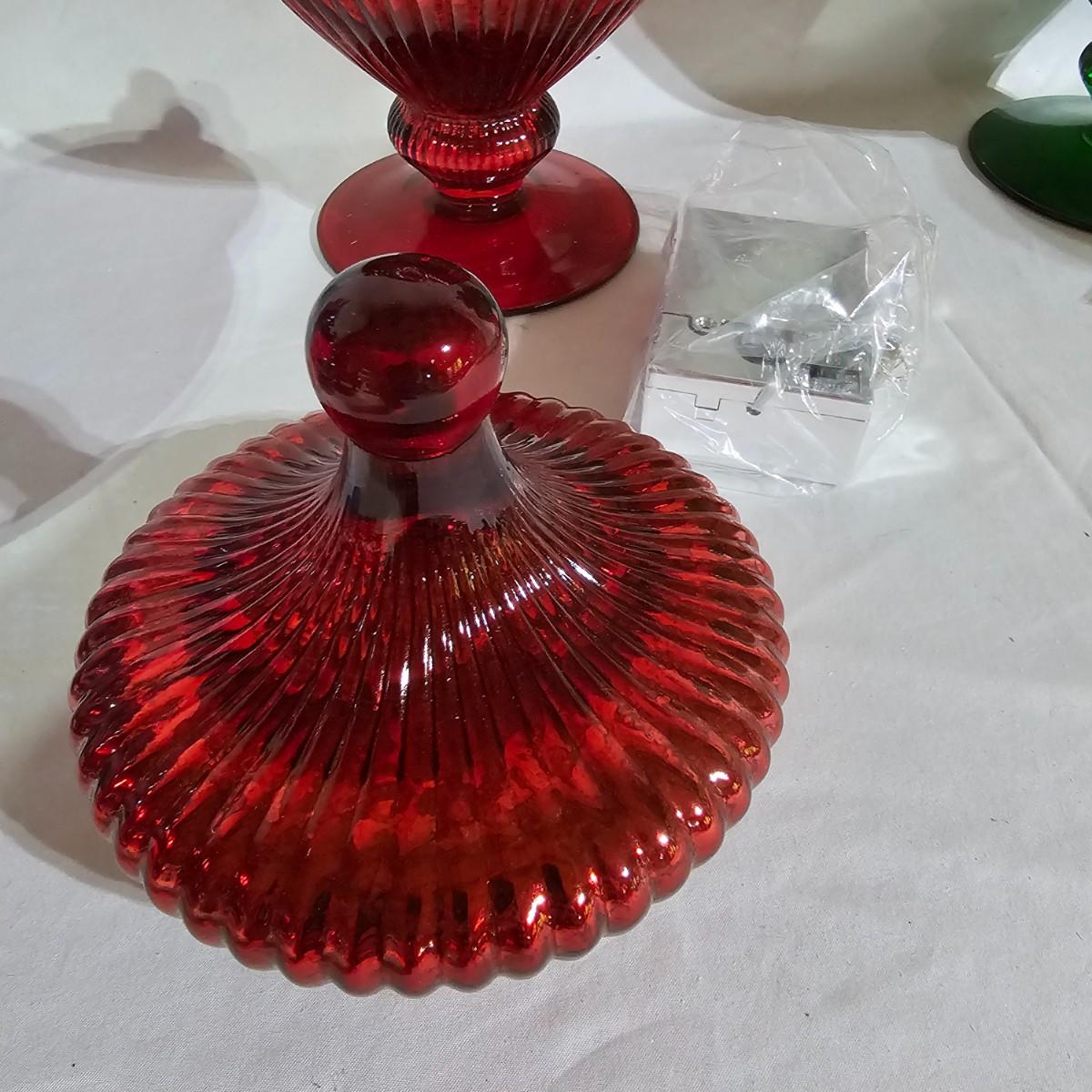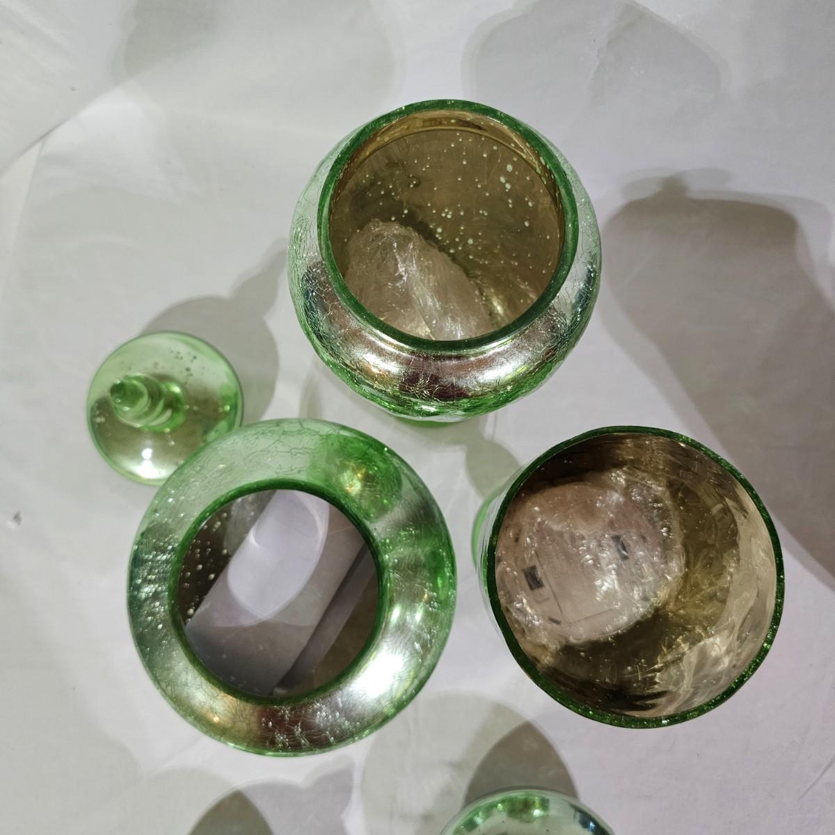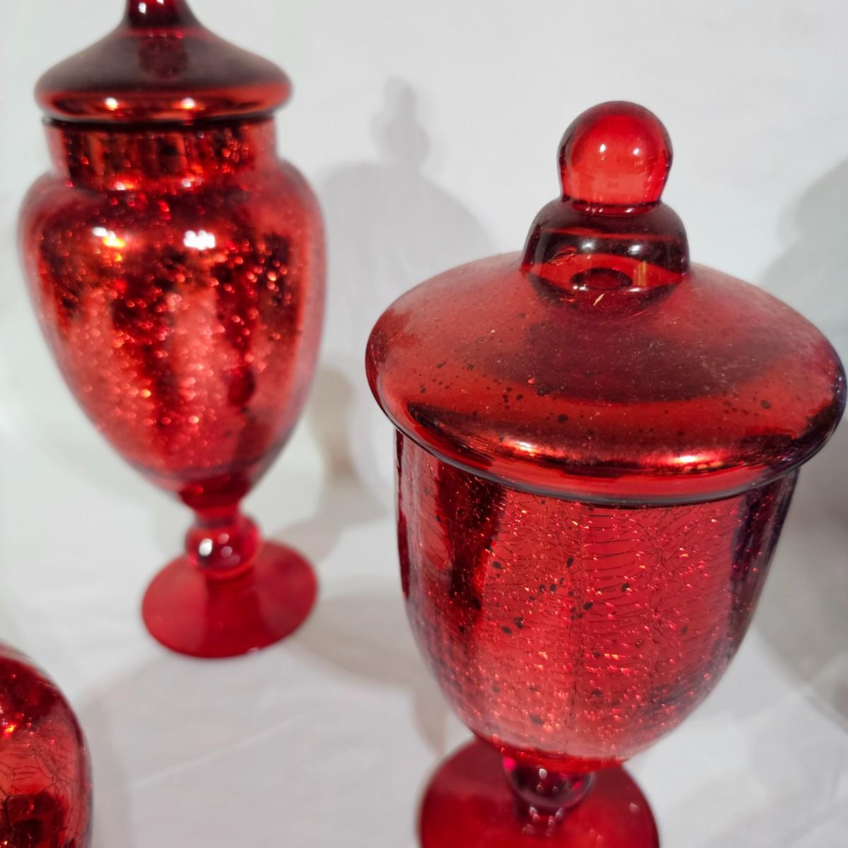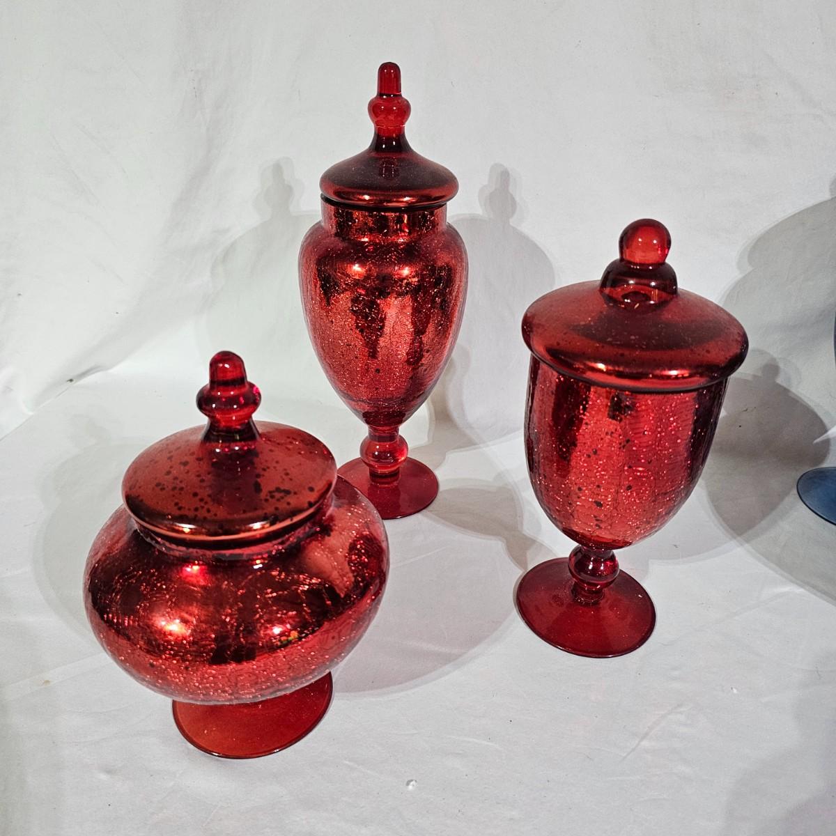 Three sets of three and two larger apothecary style jars with lids, all glass. Each piece has its own battery operated light source for inside, not tested. Most run on AA, AAA or C size batteries. Large jars measure 8"D x 14.5"H. Sets are 4.5"D x 11.5"H, 4.25"D x 10"H and 6"D x 8"H. All with lids. See photos for details. Shipping available.