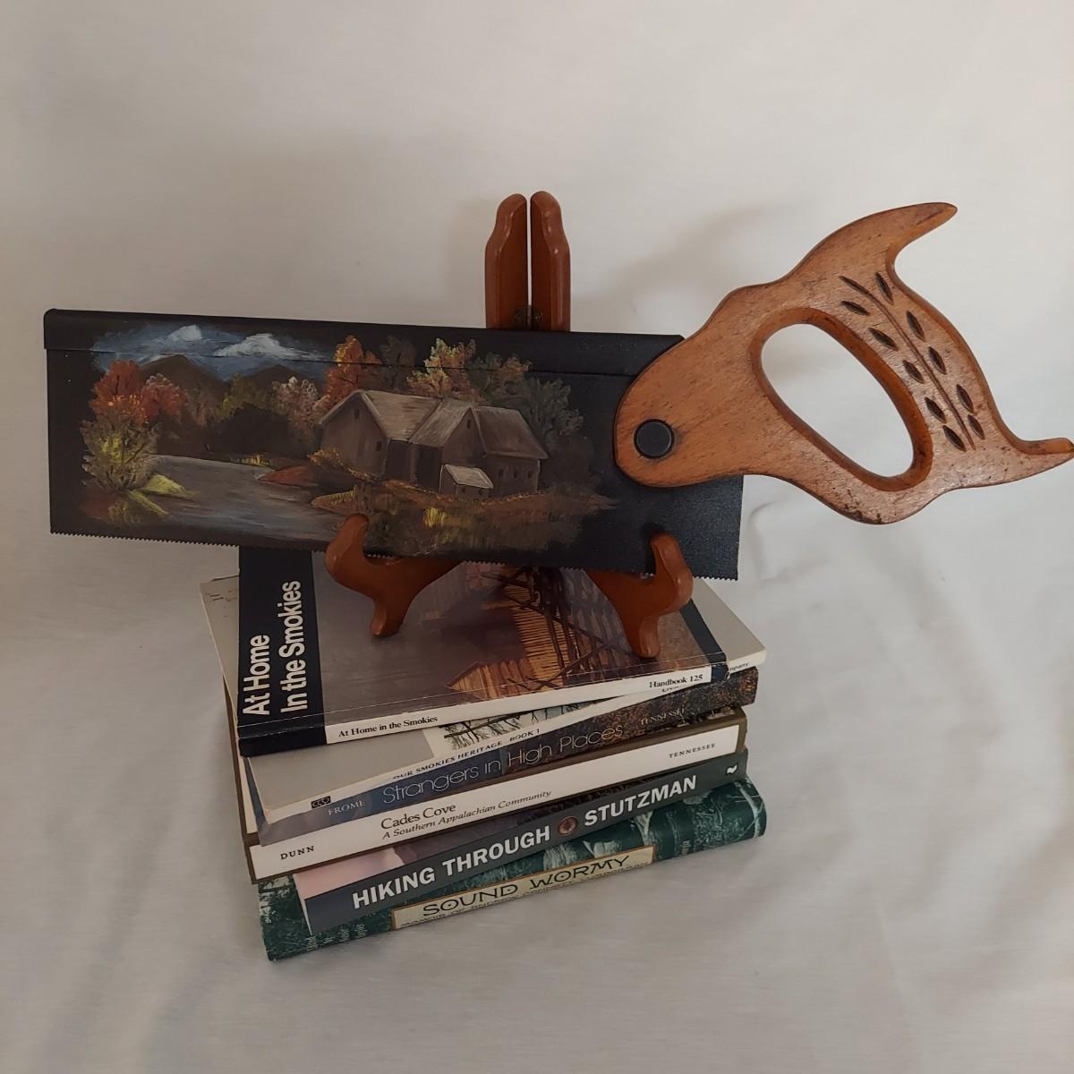 Six books, a mix of paper and hardback, about The Smoky Mountains and Appalachia. Also a folk art saw that's 17" long. Plate stand is not included in this lot. Shipping available