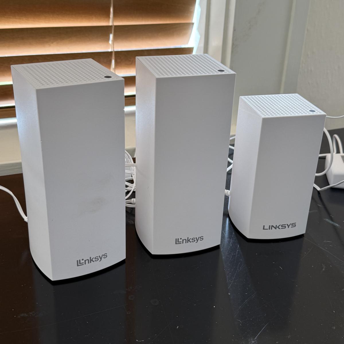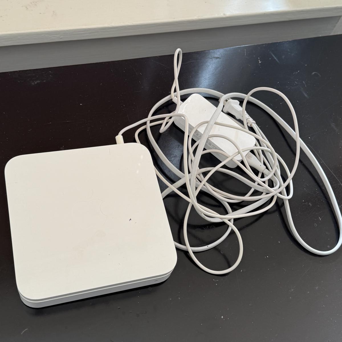 Four Apple accessories with three Linksys routers. Apple products include: a Magic Mouse, a slim wired keyboard, a second generation Apple Pencil in its original box, and an AirPort Extreme base station. Three Linksys routers include two of model MX2000 and one of model WHW01. The two equal routers powered on when plugged on. The smaller didn’t, but is included in case it just needs a different adapter (the port is a different size on this one than the other two). The AirPort powered on as well. The other three Apple items were unable to be tested.