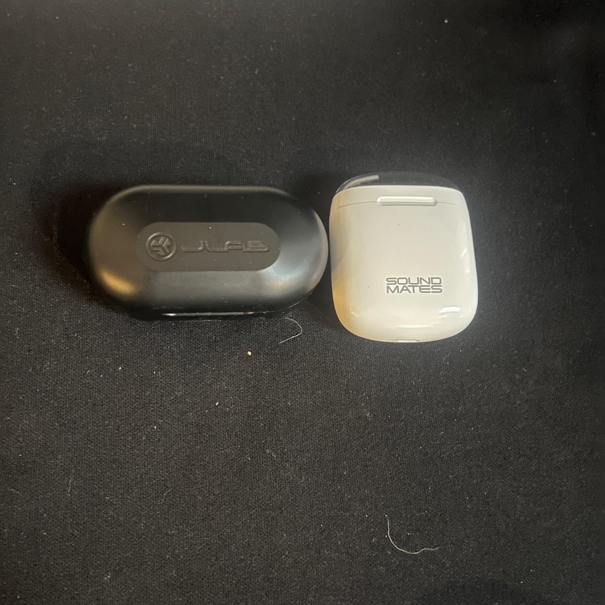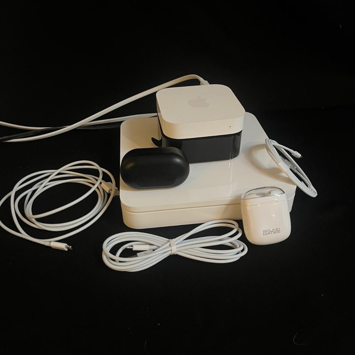 Lot includes an Apple Airport Express, AirPort 1 TB Time Capsule, Apple TV, JLAB and Sound Mates wireless headphones and lightning cables.