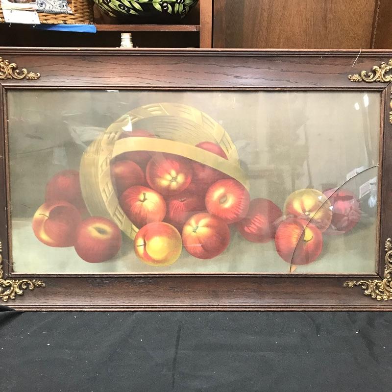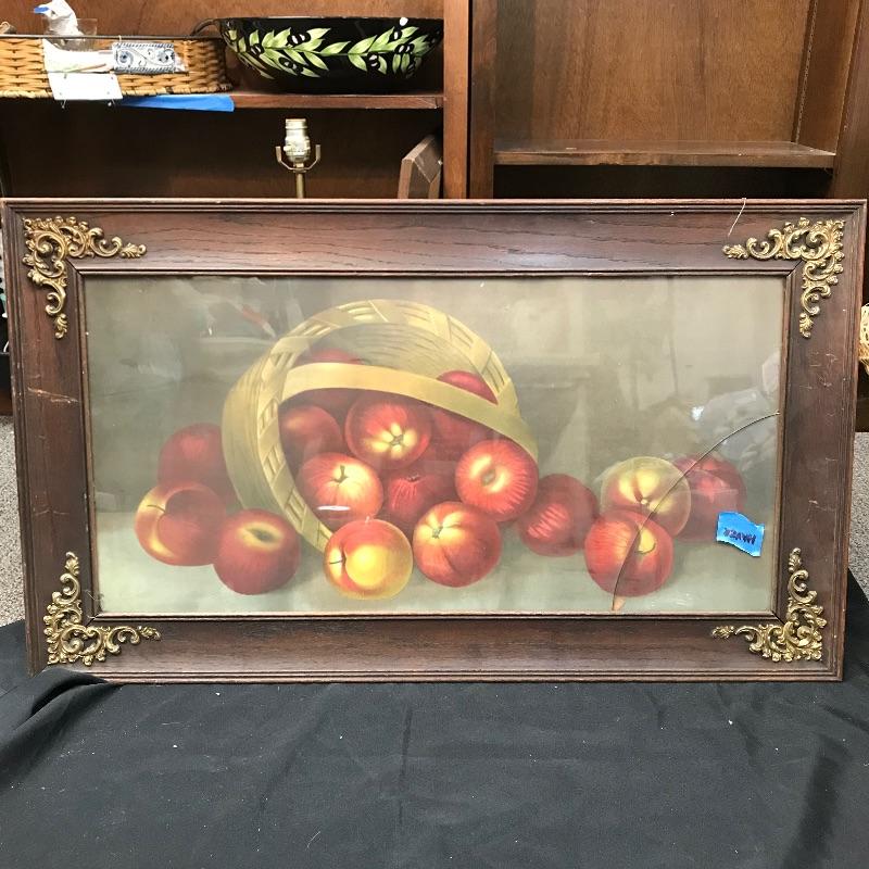Painting is not signed in any way. There is no information on the back of the frame either. There are numerous scuffs on the surface of the frame, and the glass is cracked. The provisions for hanging this picture are also broken. Measures 19 3/4“ x 33 1/4“.