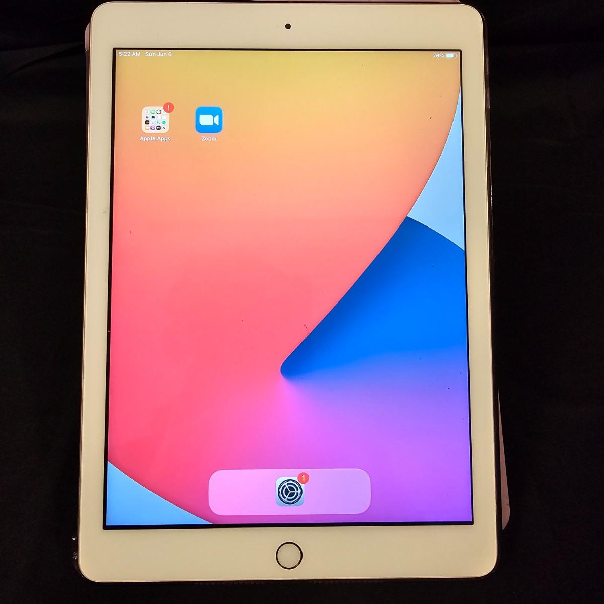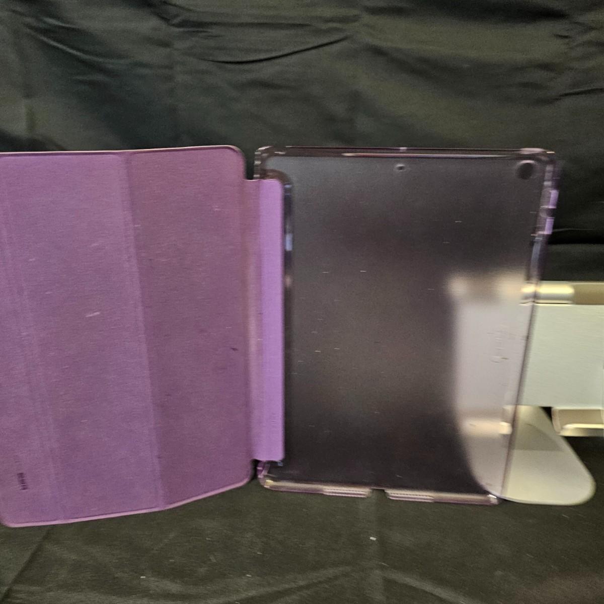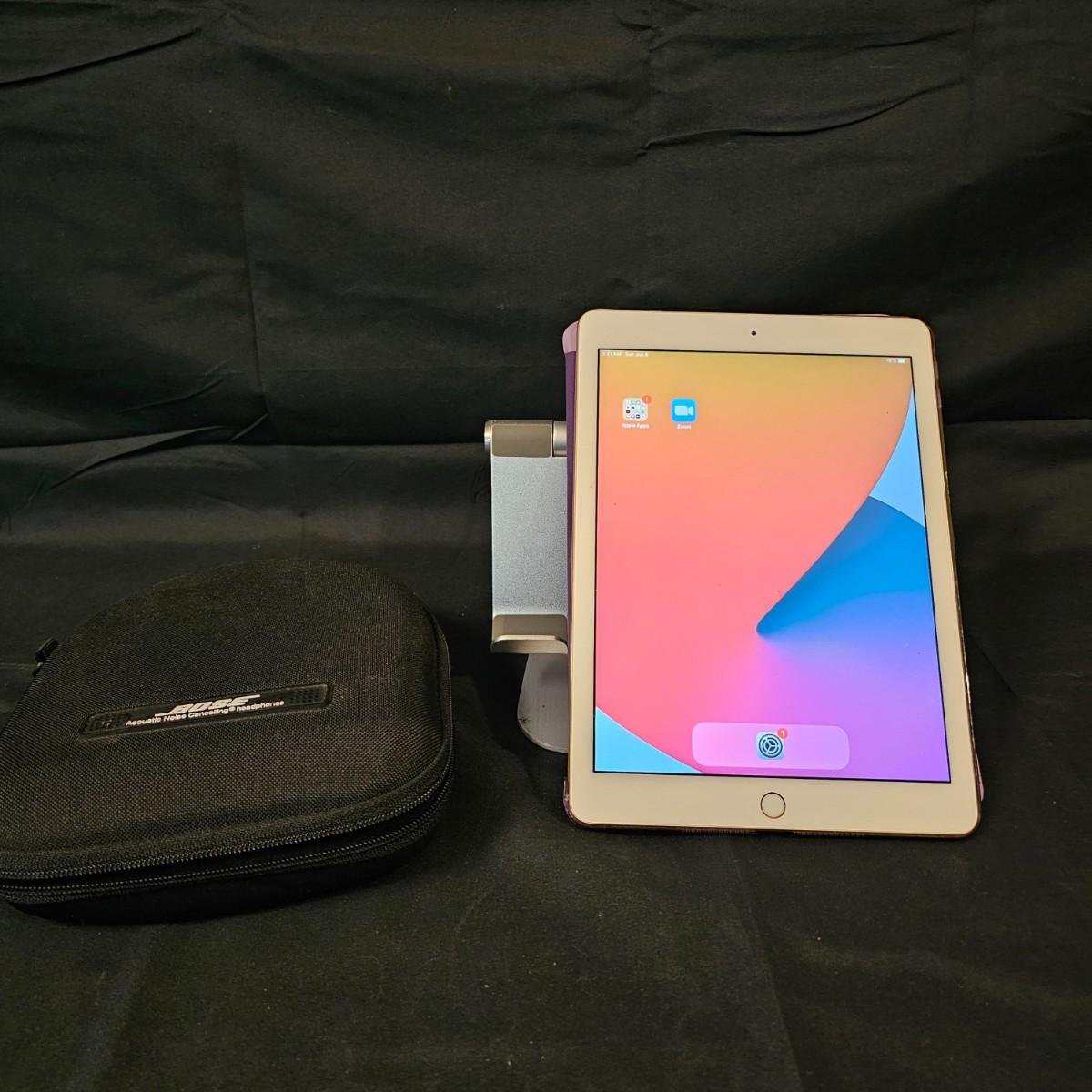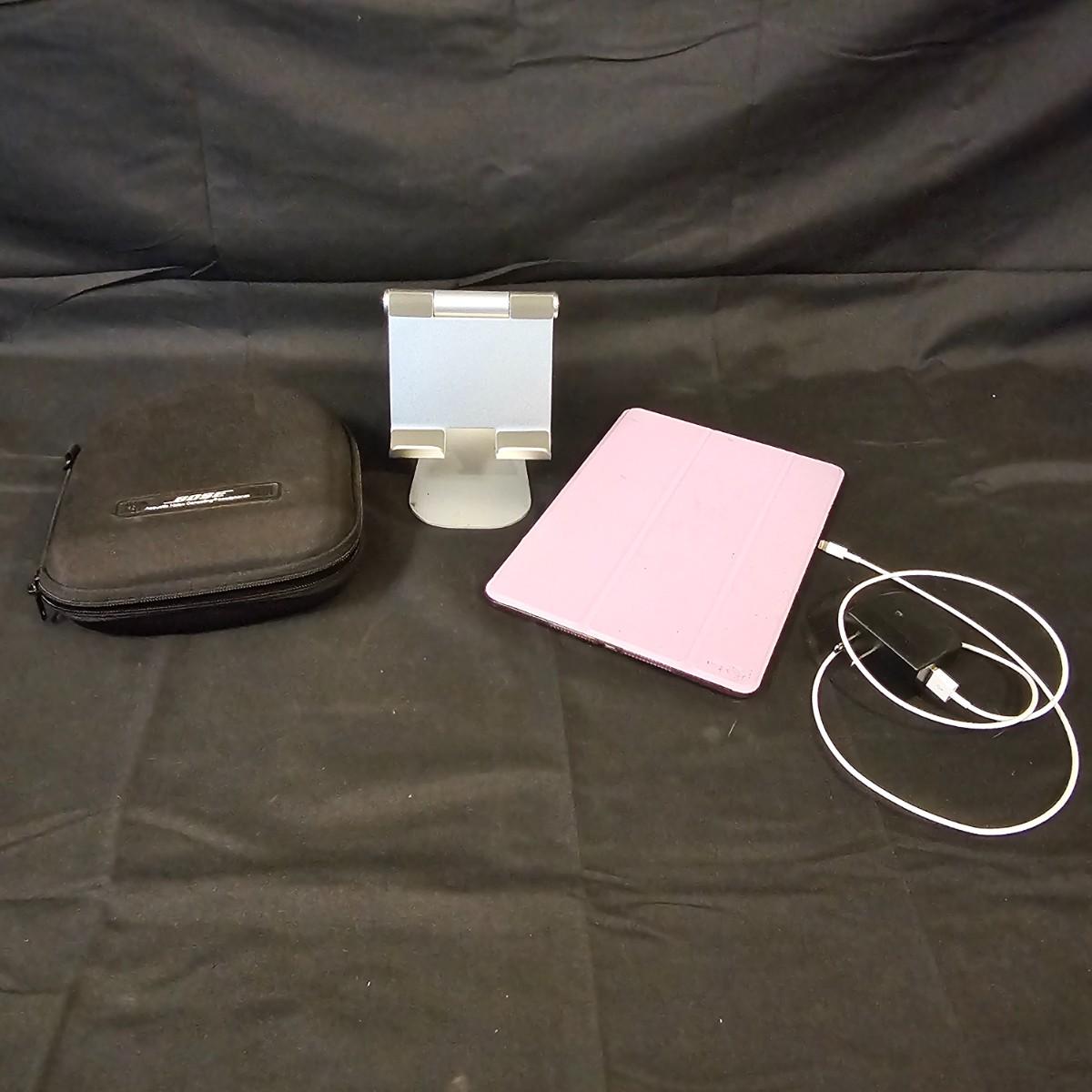 One Apple iPad 5th generation with 32gb storage. Unit has Wi-Fi and bluetooth, measures 7" x 9.5". Comes with pink/purple cover case and charging cable and plug. Unit powered on. Also one Lamicall aluminum adjustable viewing stand. One pair Bose wired headphones with case. Earcups are slightly distorted. See photos for details. Shipping available.