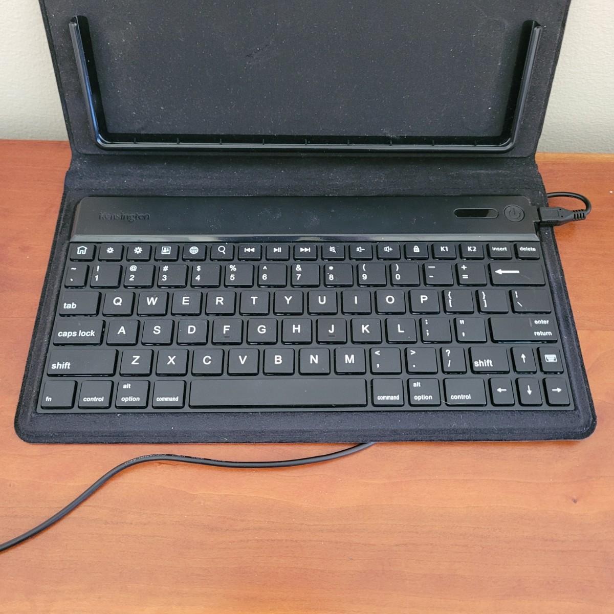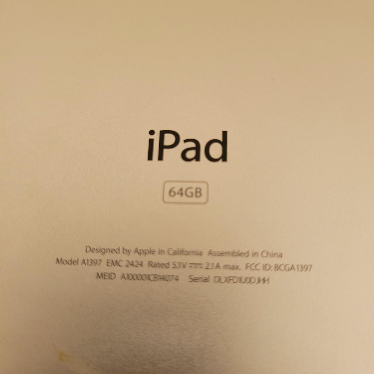 This lot includes two Apple brand iPads with magnetic covers, Kensington Bluetooth keyboard case, and extra cords. The smaller iPad is an iPad mini model A1432 and includes a magnetic folding screen cover. It seems to have some small damage under the screen (may have been smashed a bit). It includes original box and paperwork. The larger iPad is the 64gb version of the A1397 model and also includes a folding screen cover. Both iPads are wiped and start on the setup screen. The Kensington keyboard case folds flat and includes extra power cords.