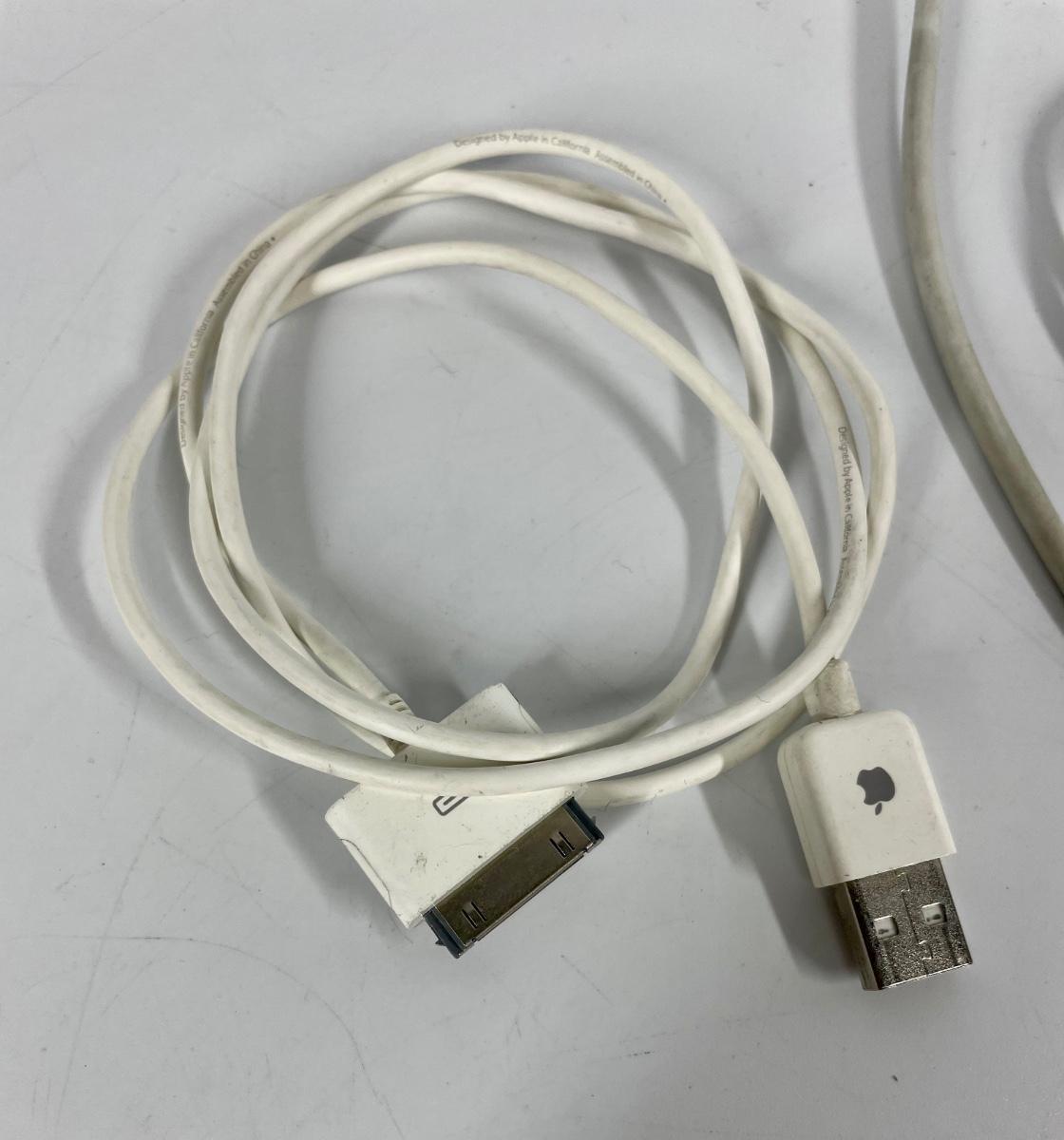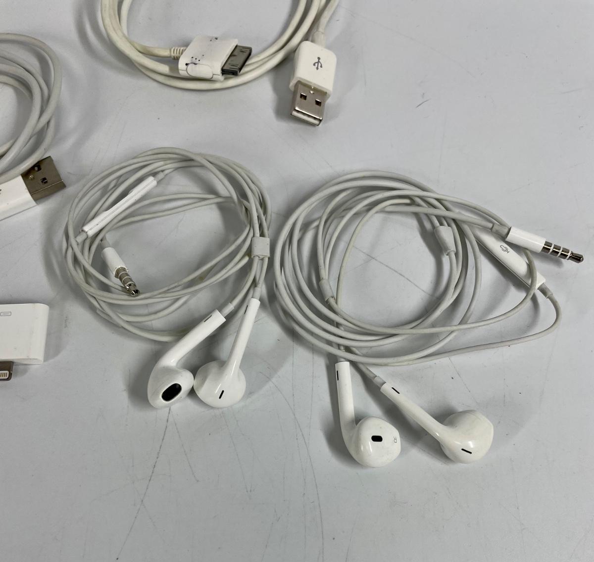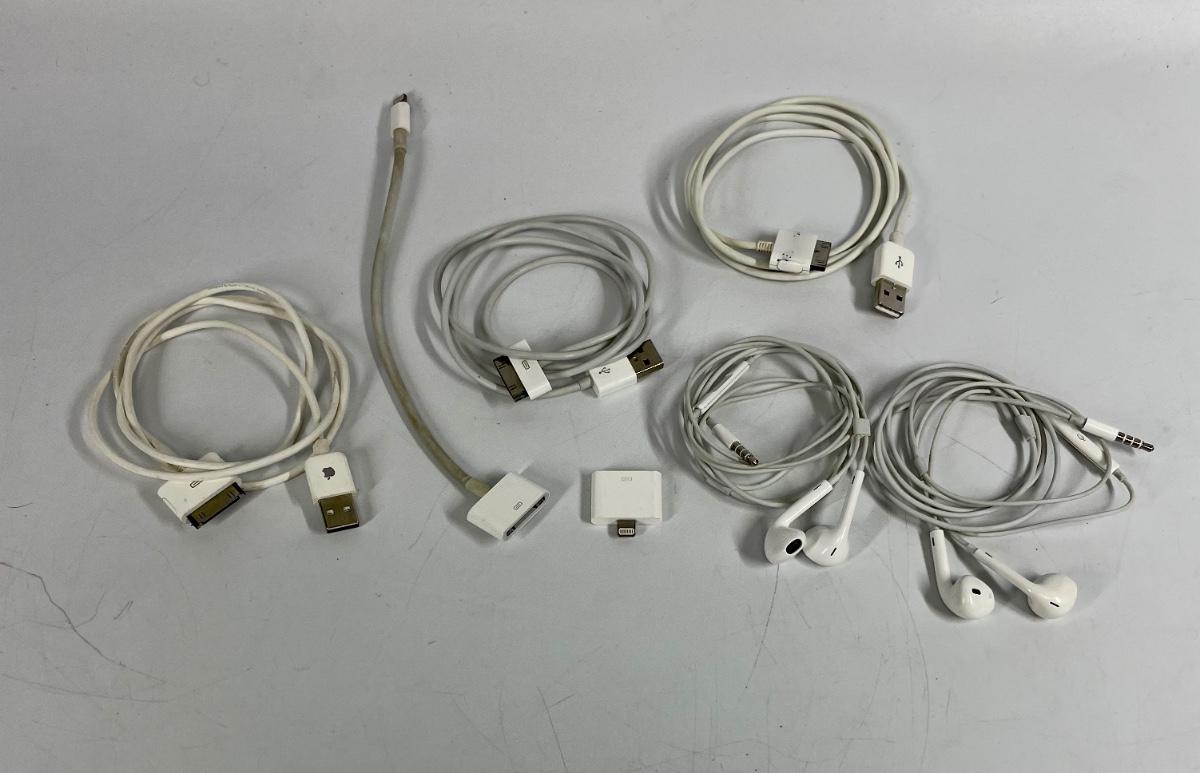 Lot of Apple Iphine and IPad items: 2 sets of older plug 3.5mm connector earbuds, 3 USB to flat pin IPad connectors, and 2 IPad flat pin connector to lightning style plug converters. Used but have been thoroughly cleaned.