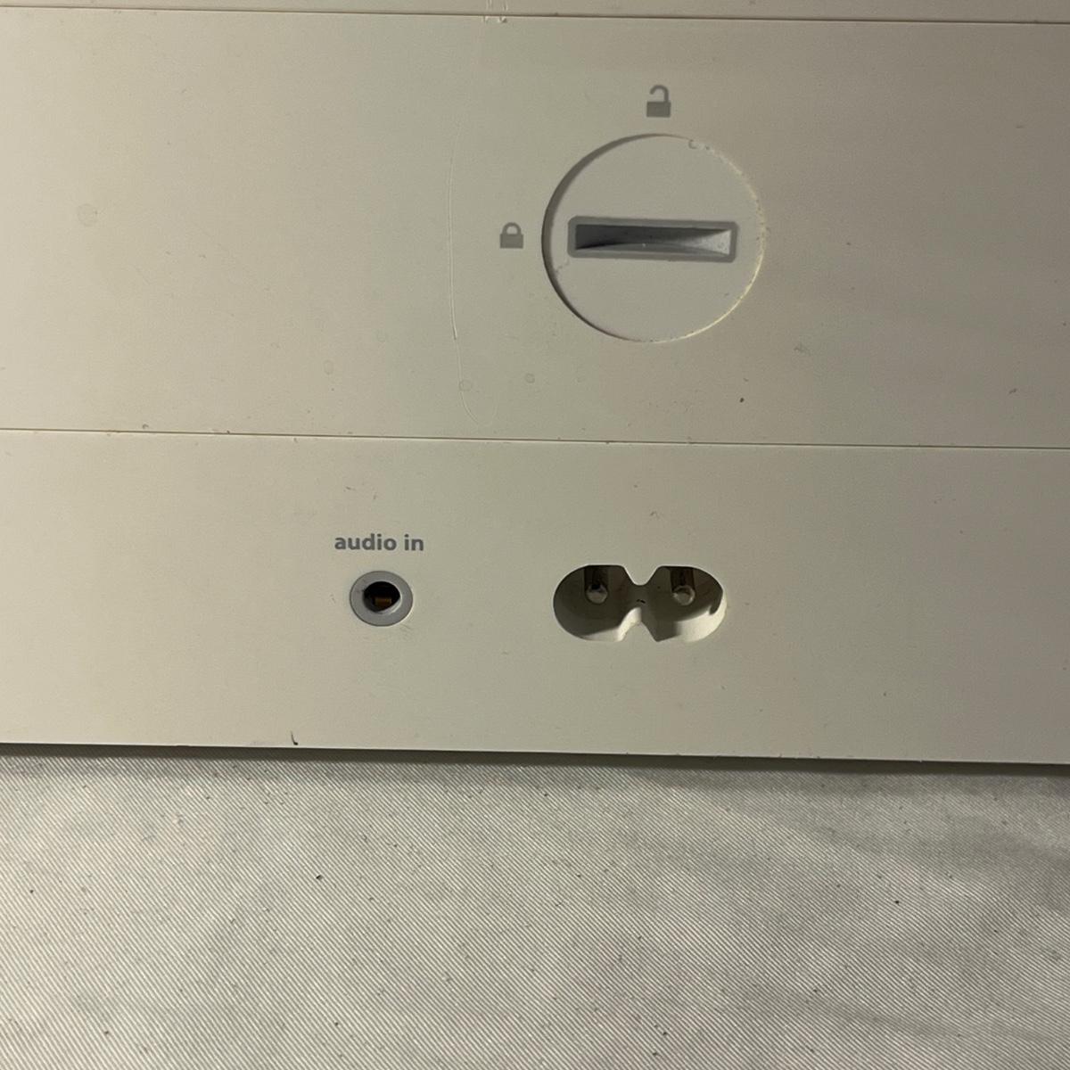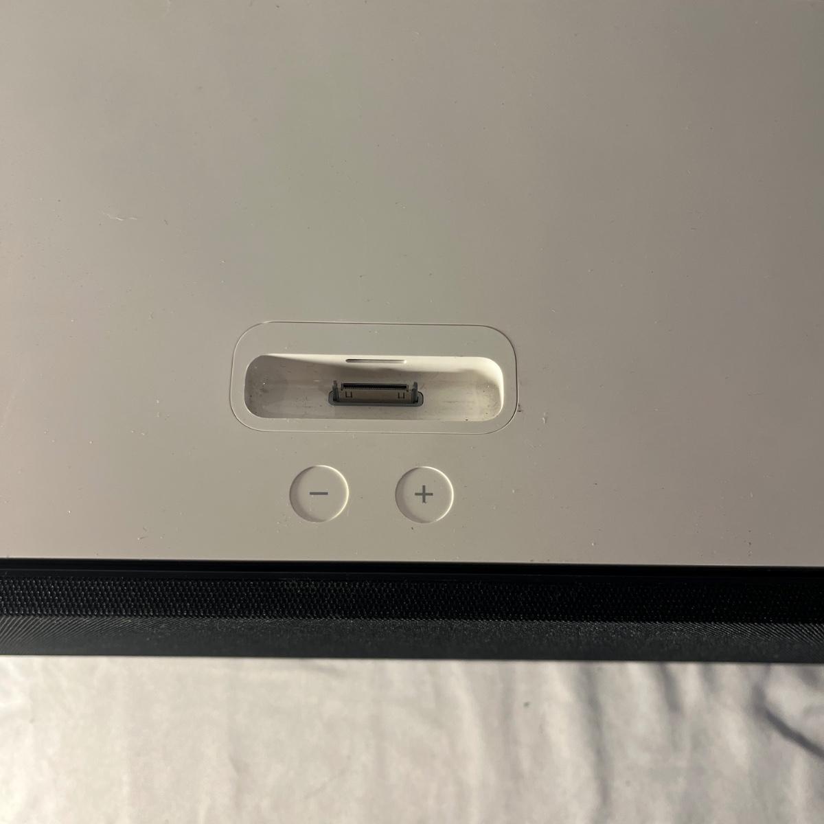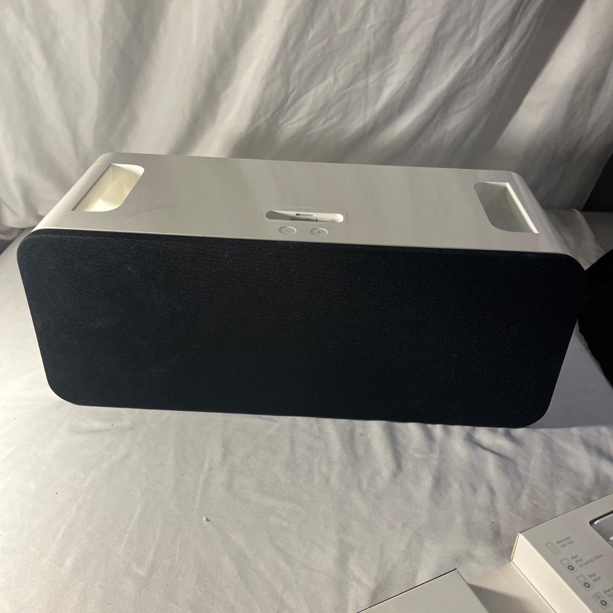 Lot includes an Apple 30 pin IPod dock HiFi speaker with remote and assorted mounts for various IPods. Machine powered on when plugged and also has battery power capabilities. Machine measures 17” x 7” x 7”H.