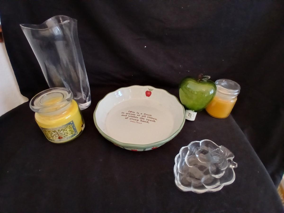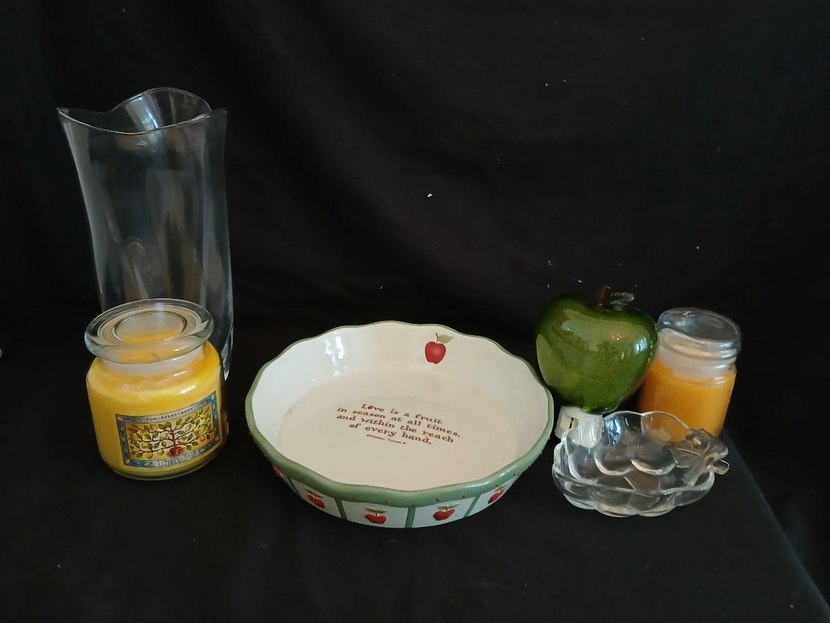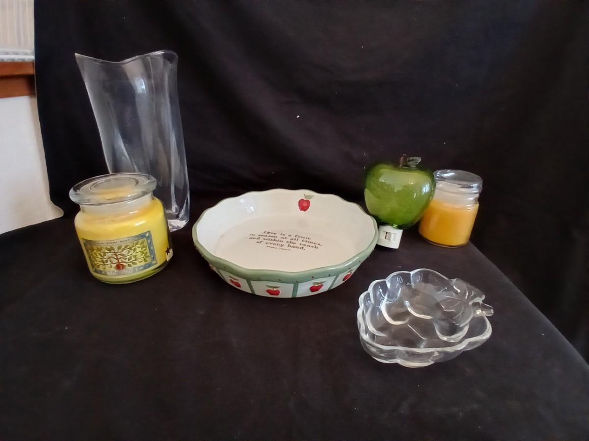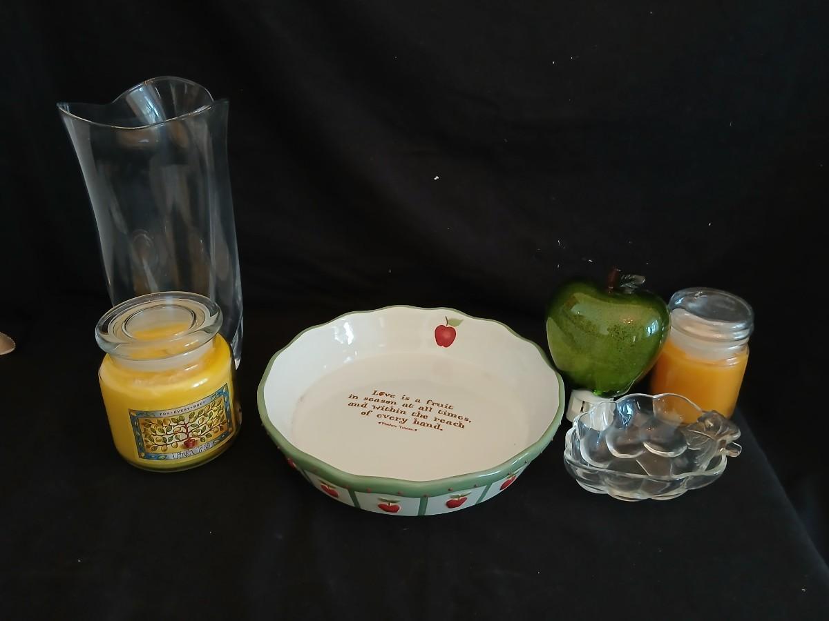 Apple pie dish, glass grape dish, apple nightlight, candles and a vase