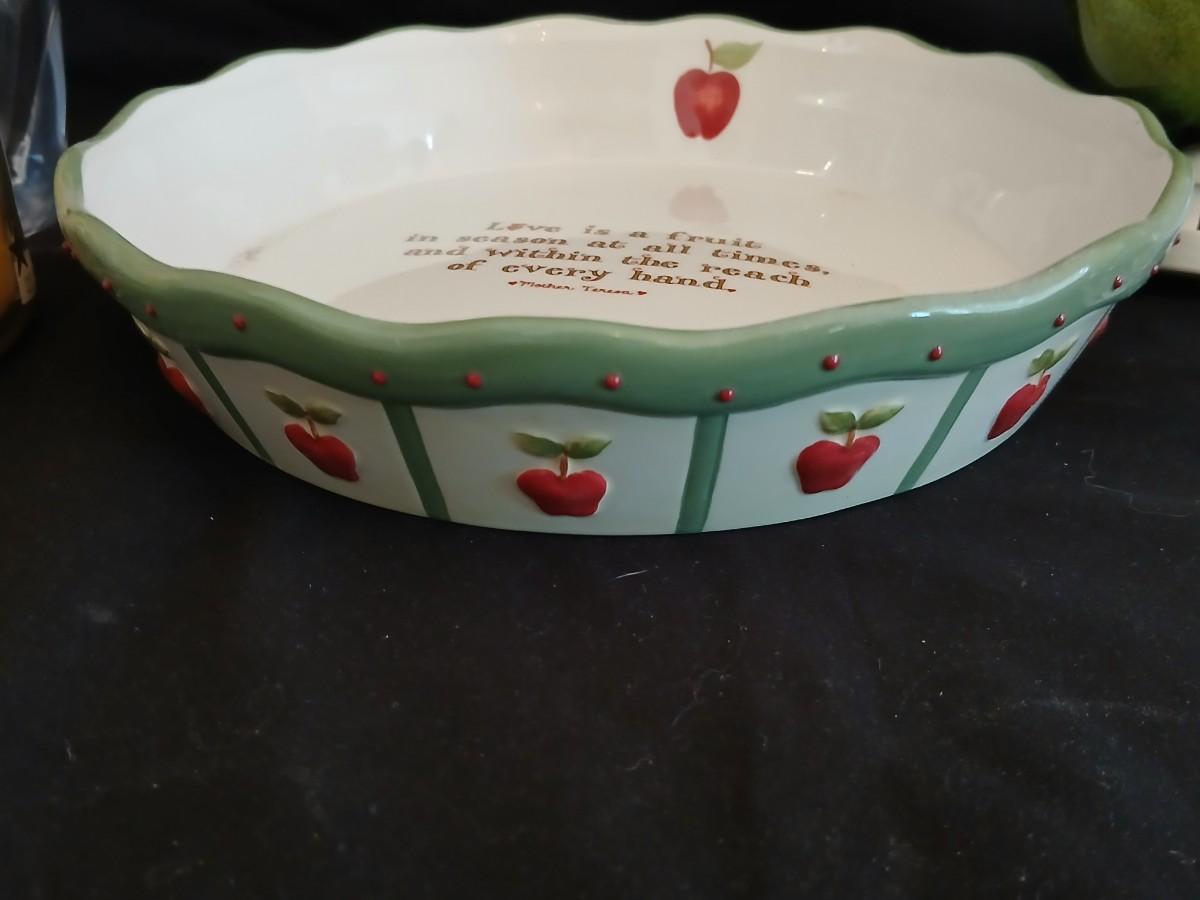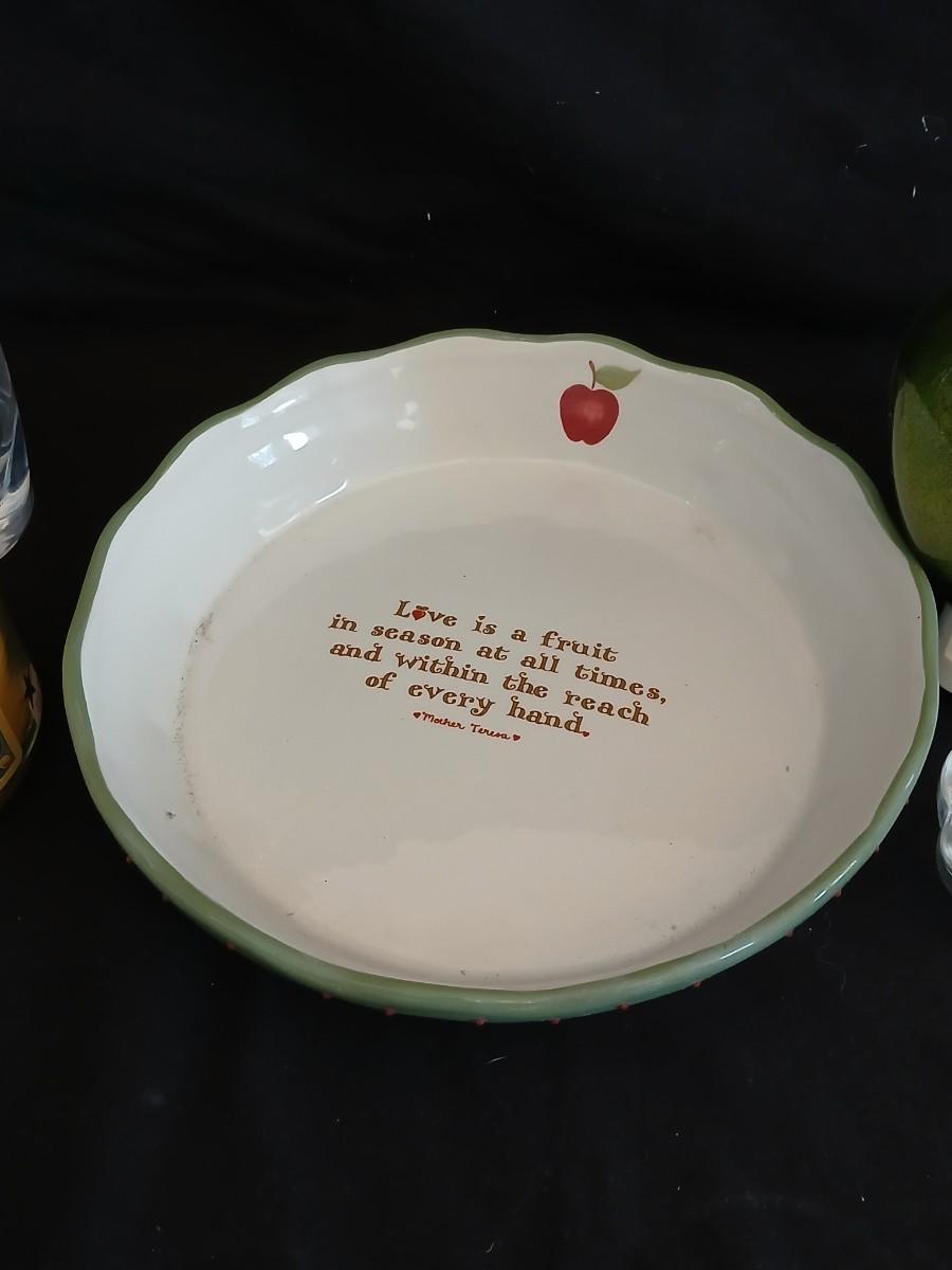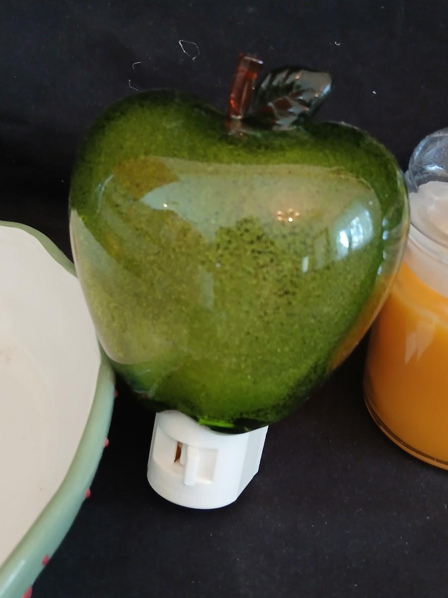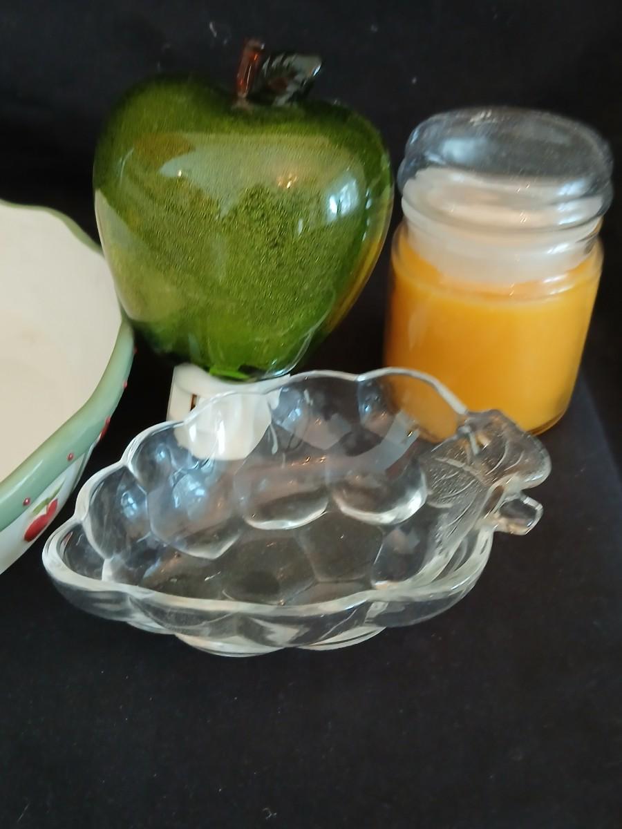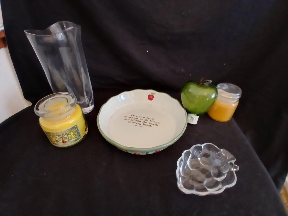 Apple pie dish, glass grape dish, apple nightlight, candles and a vase