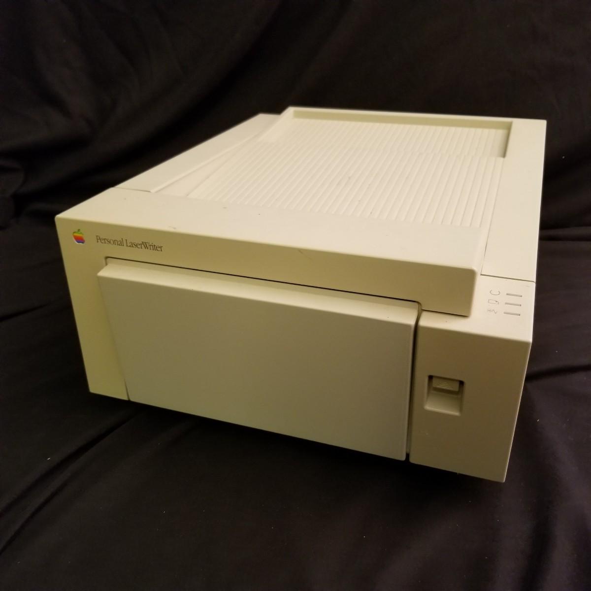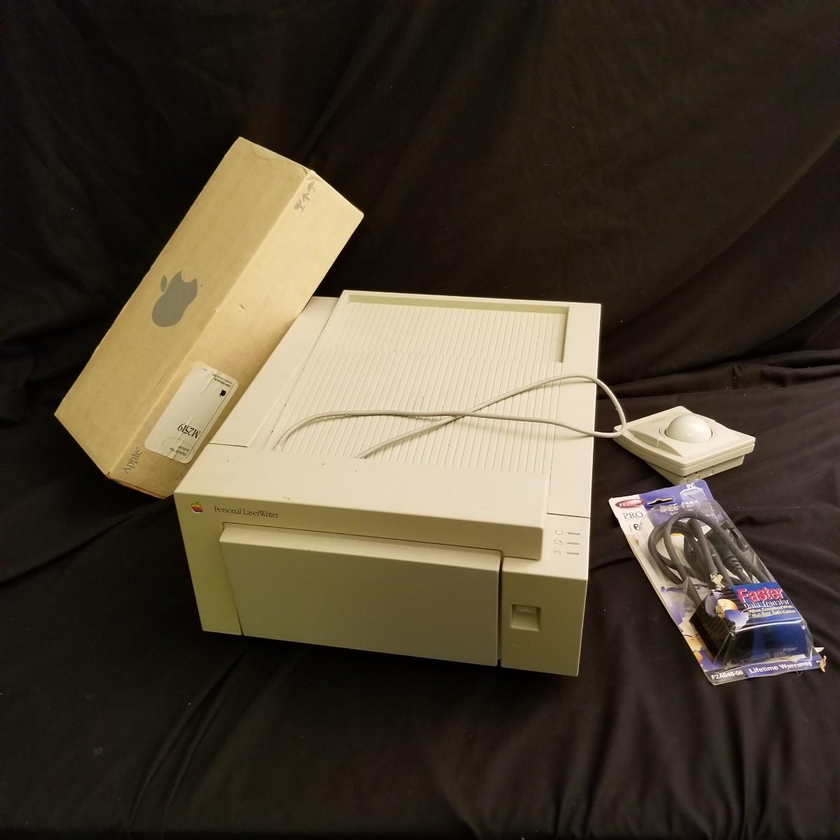 A vintage 1991 Apple Personal LaserWriter printer, Macintosh keyboard and a Kensington TurboMouse are included in this batch. Printer comes with toner cartridge but no cables and measures 15" x18"x8", it is fair condition. Keyboard is original box and measures 16" x6" x2", also no cables. Track ball mouse is 5" x5", has one cable. Also included is one IEEE 1284 parallel printer cable. All items untested. See photos for details. Local pickup only.
