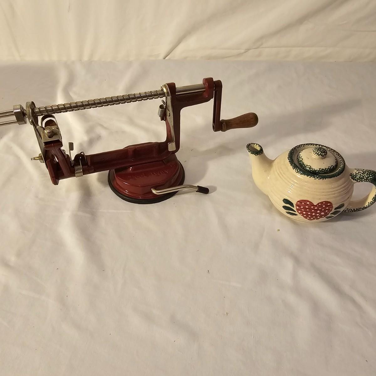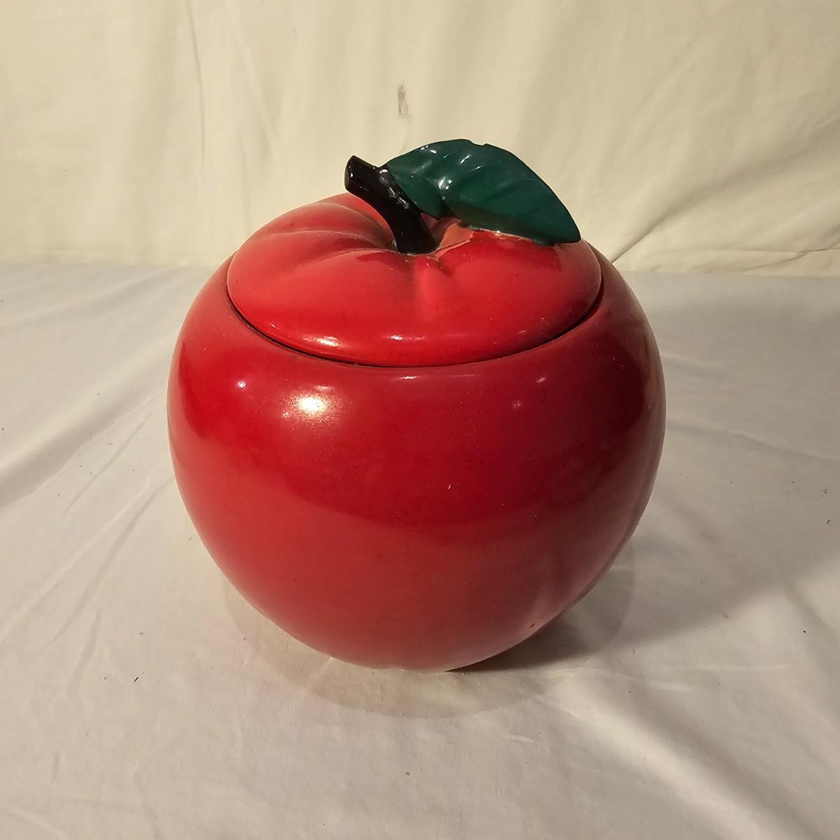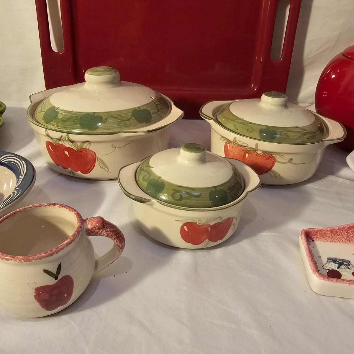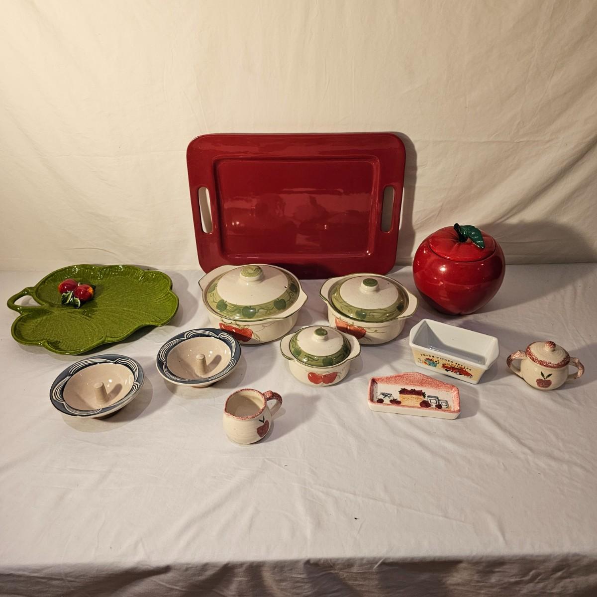 Multiple pieces of ceramic bowls, plates and more with an apple theme. Large flat tray measures 14" x 18.5", has handles. Set of three casseroles with lids nest together, large piece is 9.75"D x 6"H. Sugar bowl and pitcher set. Tabletop apple peeler. Large apple shaped jar with lid, measures 8"D x 7"H, has small chip on top. See photos for details. Shipping available.